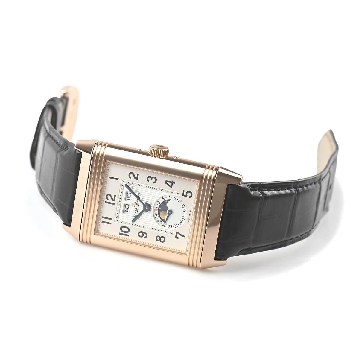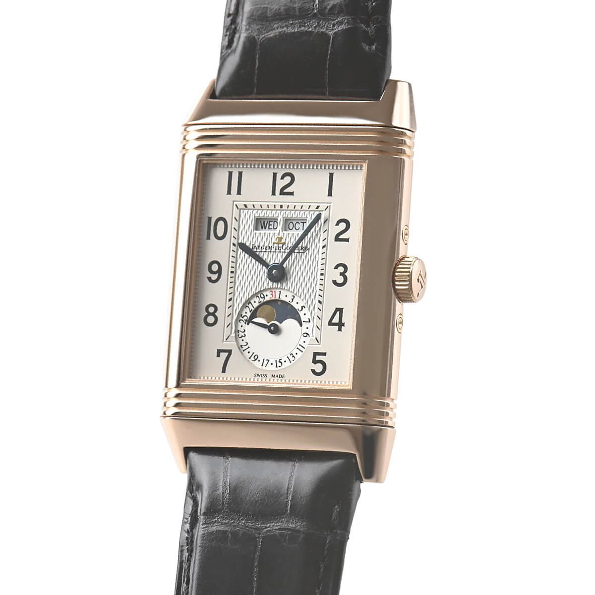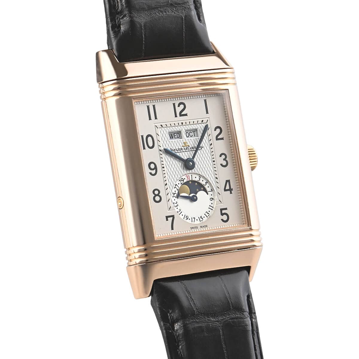 ジャガー・ルクルトのトリプルカレンダームーンフェイズといえば、ヴィンテージファンにも絶大な人気を誇る複雑時計の定番モデル。こちらはその複雑機構をレベルソのケースに詰め込んだ一本です。
