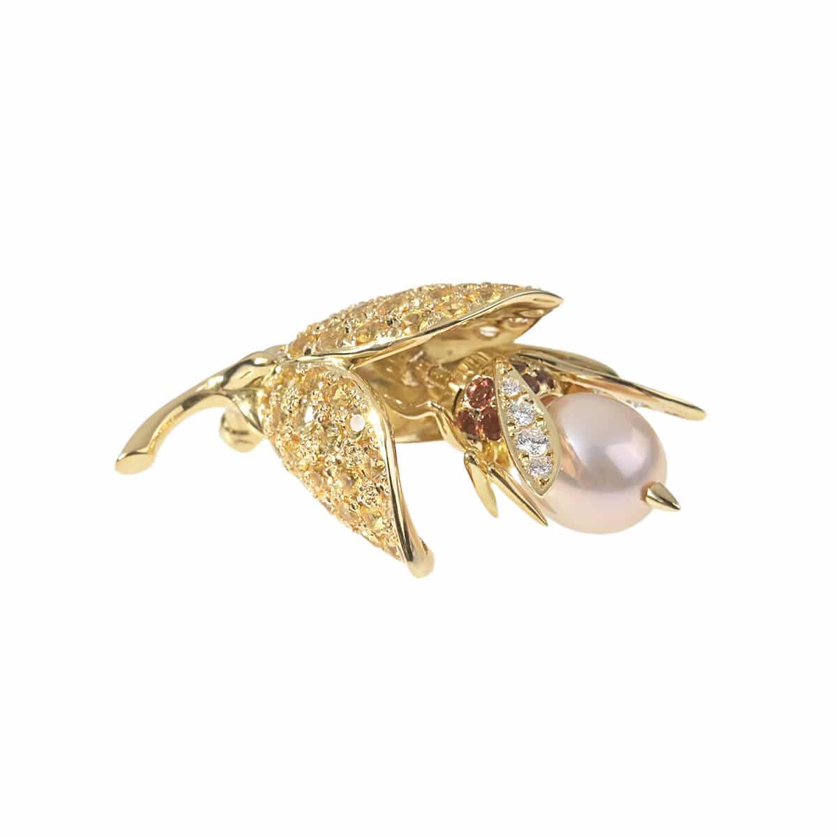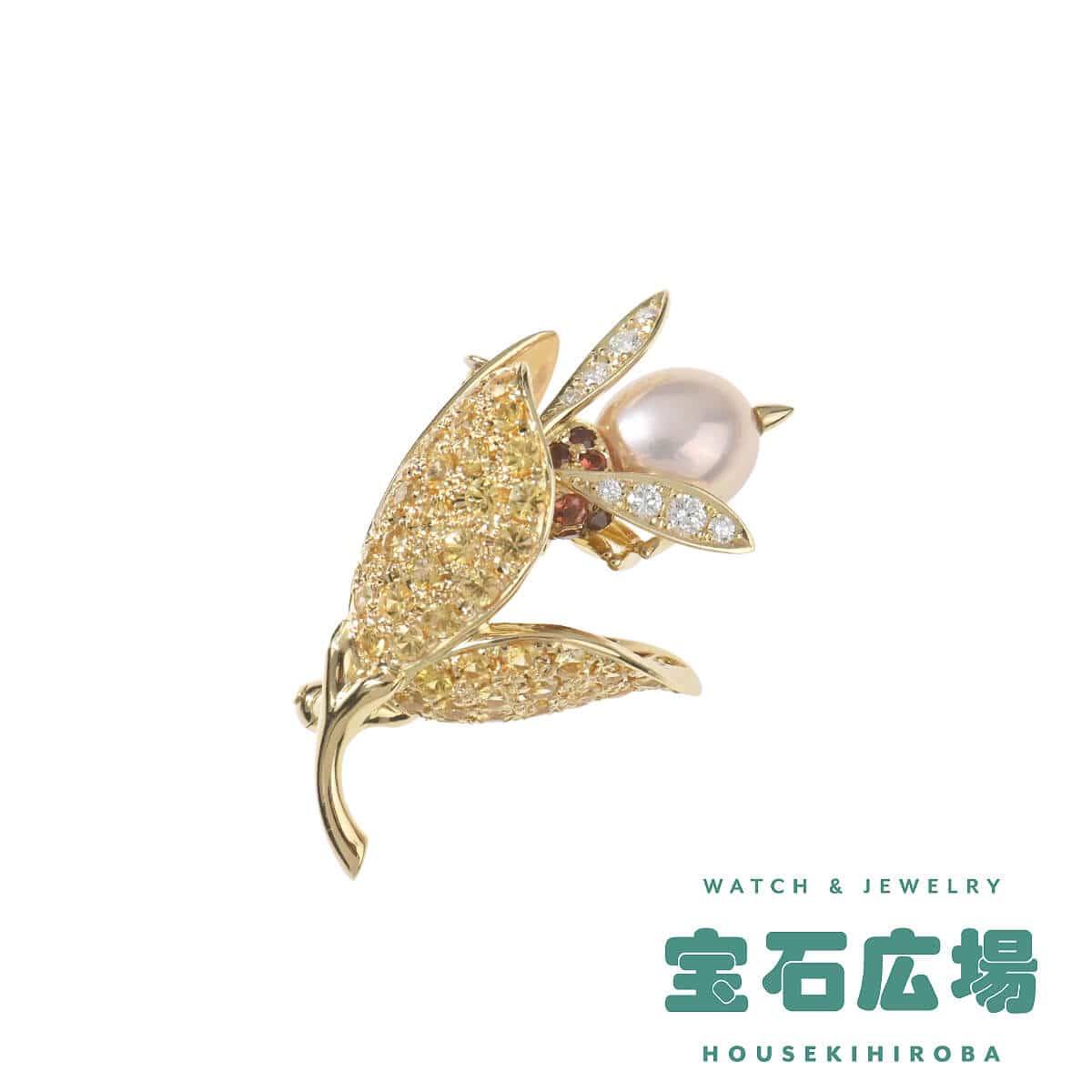 ヨーロッパでは“神の鳥”とも呼ばれ、花から蜜を集めて蜂蜜をつくることから愛のシンボルとされている「ハチ」。ハチが蜜を集める様をそのままザインに落とし込んだ、イエローゴールド製ブローチです。イエローサファイアが敷き詰められた立体フォルムの花びらが印象的なお花に留まったハチは、ボディがガーネットと淡水パールで表現され、繊細な羽にはきらめくダイヤモンドがあしらわれています。動くたびハチが揺れる、遊び心を感じるギミックの効いた、芸術性にあふれたデザインと細工が技術の高さを物語る芸術作品のようなブローチです。