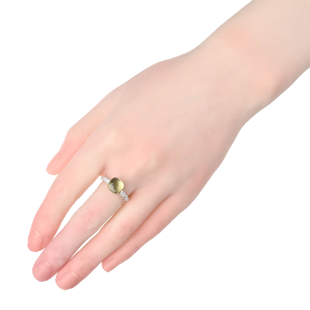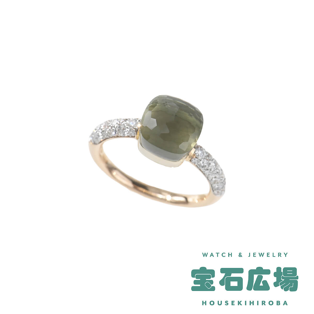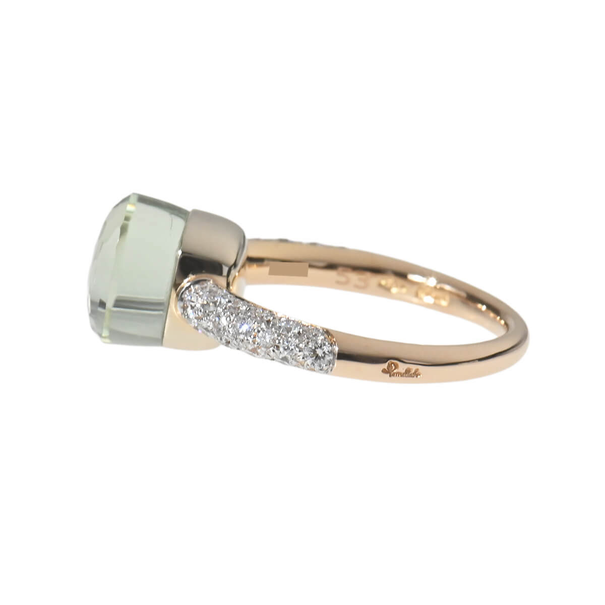 『Pomellato(ポメラート)』のコンテンポラリーなスタイルのアイコン「ヌード」は、特許を取得している美しい多面のファセットカットとセッティングで、宝石がもつありのままの美しさを表現したジュエリーコレクション。無数のカラーコンビネーションが可能な「ヌード」の宝石をあしらった、非常にすっきりとシンプルなデザインながらパワフルで、強く印象に残るシックな個性をもつコレクションです。コレクションの中で最もコンパクトなサイズの「プラシオライト」をあしらった、「ヌード・プチ」リングは、より繊細な印象に。プラシオライトと呼ばれる、“愛と調和”だけでなく、“奇跡”を象徴するパワーストーンでもあるグリーンアメシストの他の宝石にはない透明感あふれるモスグリーンを、サイドのパヴェダイヤモンドの強いきらめきが一層印象的に惹きたてています。ニュアンス豊かな色彩が目を惹く、ポメラートらしいお洒落な個性と遊び心、そしてインパクトある美しさにあふれたコレクションジュエリーです。