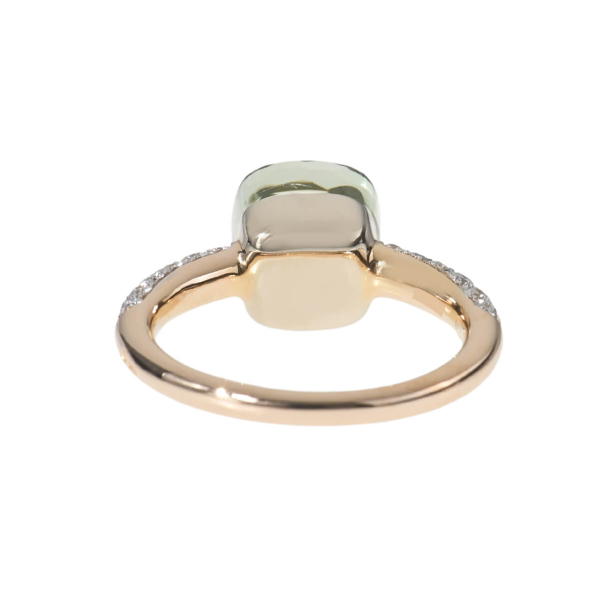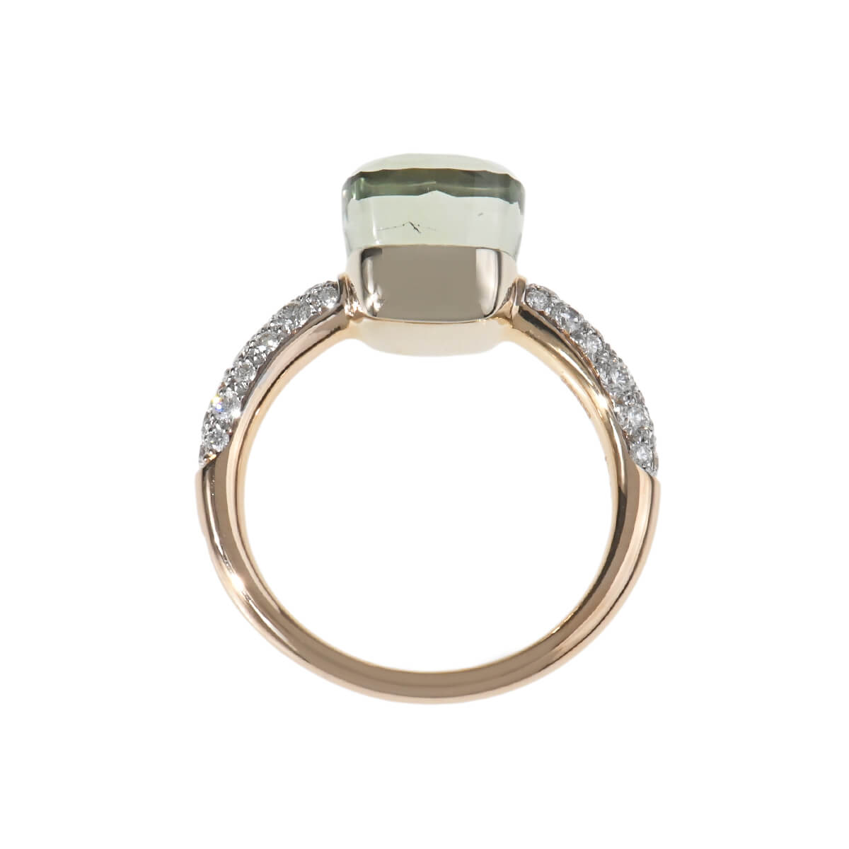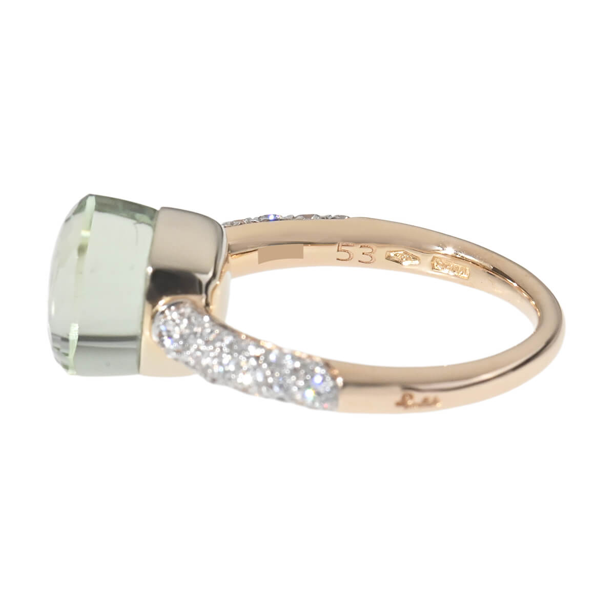 『Pomellato(ポメラート)』のコンテンポラリーなスタイルのアイコン「ヌード」は、特許を取得している美しい多面のファセットカットとセッティングで、宝石がもつありのままの美しさを表現したジュエリーコレクション。無数のカラーコンビネーションが可能な「ヌード」の宝石をあしらった、非常にすっきりとシンプルなデザインながらパワフルで、強く印象に残るシックな個性をもつコレクションです。コレクションの中で最もコンパクトなサイズの「プラシオライト」をあしらった、「ヌード・プチ」リングは、より繊細な印象に。プラシオライトと呼ばれる、“愛と調和”だけでなく、“奇跡”を象徴するパワーストーンでもあるグリーンアメシストの他の宝石にはない透明感あふれるモスグリーンを、サイドのパヴェダイヤモンドの強いきらめきが一層印象的に惹きたてています。ニュアンス豊かな色彩が目を惹く、ポメラートらしいお洒落な個性と遊び心、そしてインパクトある美しさにあふれたコレクションジュエリーです。