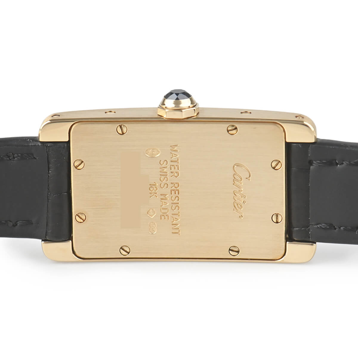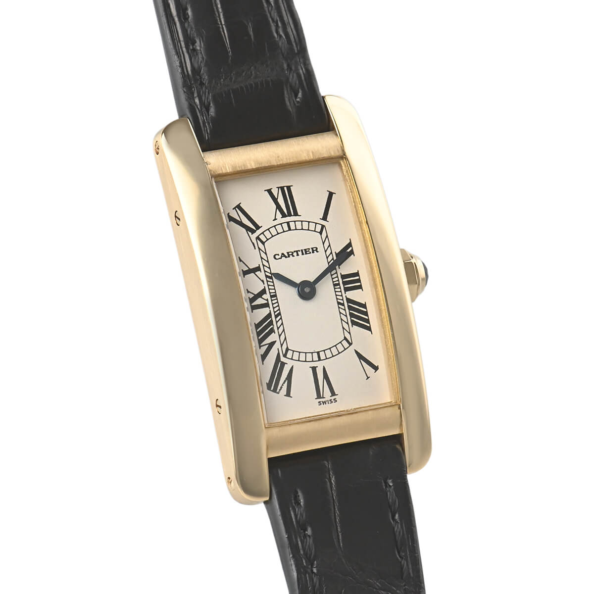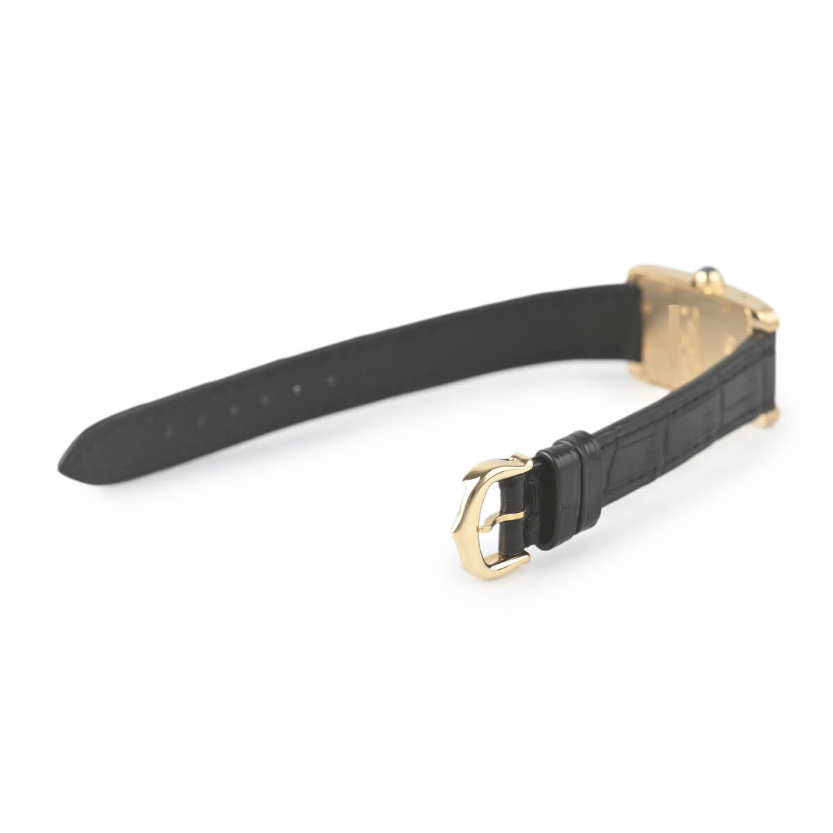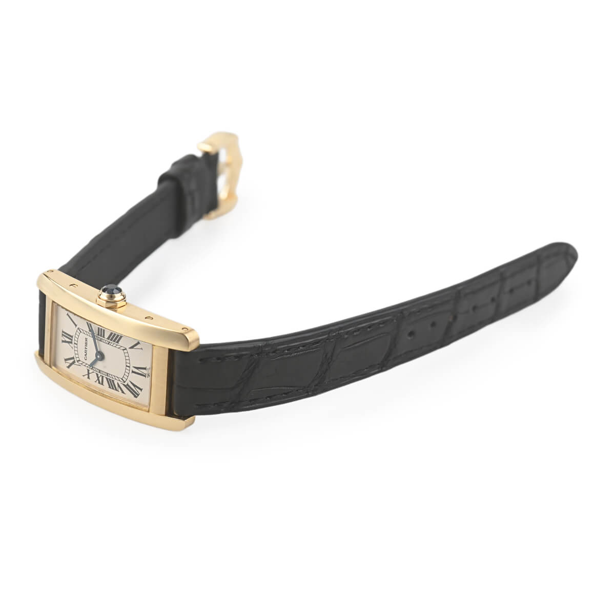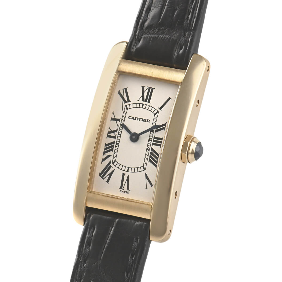 二本の並行するバーを特徴とするタンクシリーズの中でも、縦方向に長いデザインが個性的な「タンクアメリカン」。こちらはクォーツムーブメントを搭載したSMサイズのレディースモデル。