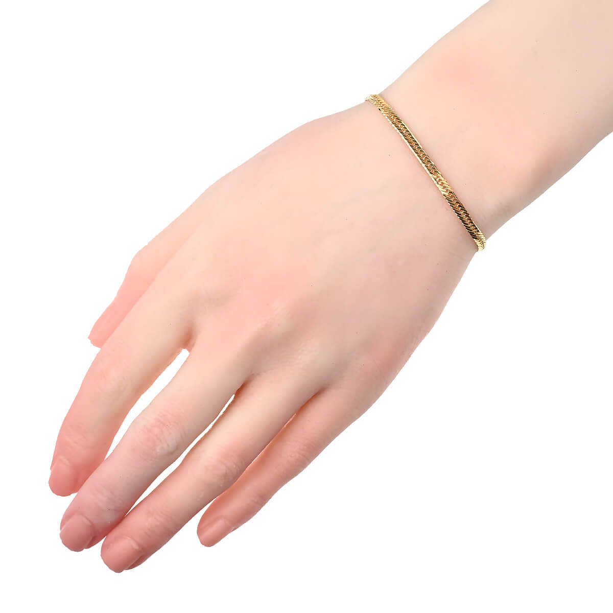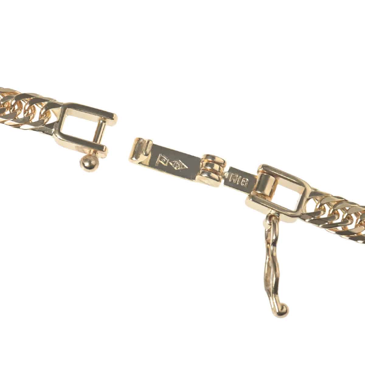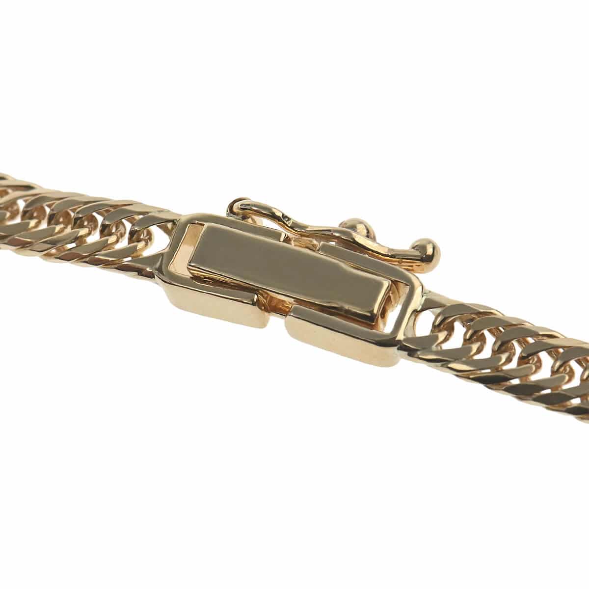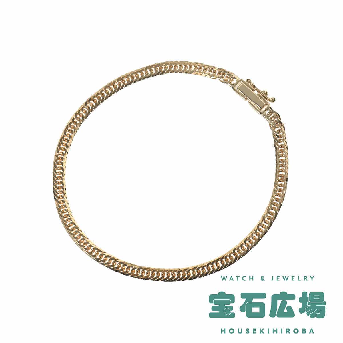 約17センチ、幅約3.2ミリ、約4.9グラムの細いながらも華やかな存在感をもつイエローゴールド製8面トリプルキヘイチェーンブレスレット。キヘイチェーンとは、あずき型のチェーンを90度ひねり、さらに押しつぶしたつくりのデザインチェーンのこと。押しつぶした面が綺麗に並んで同じ面を向き、連続していることによるなめらかな輝きが魅力のデザインチェーンです。カット面が多いほど輝きと華やかさが増し、面数が多いほど加工の手間がかかっており、価値があるとされるキヘイチェーン。8面カットが施されたコマが3コマずつ滑らかに繋がれた、コマの隙間がほとんどないデザインの8面トリプルキヘイチェーンは、手元でキラキラと光を反射し抜群の存在感を放ちます。資産価値にも注目されるキヘイは他のチェーンとは違い、単なる装飾品としてだけでなく身につける資産としても人気です。