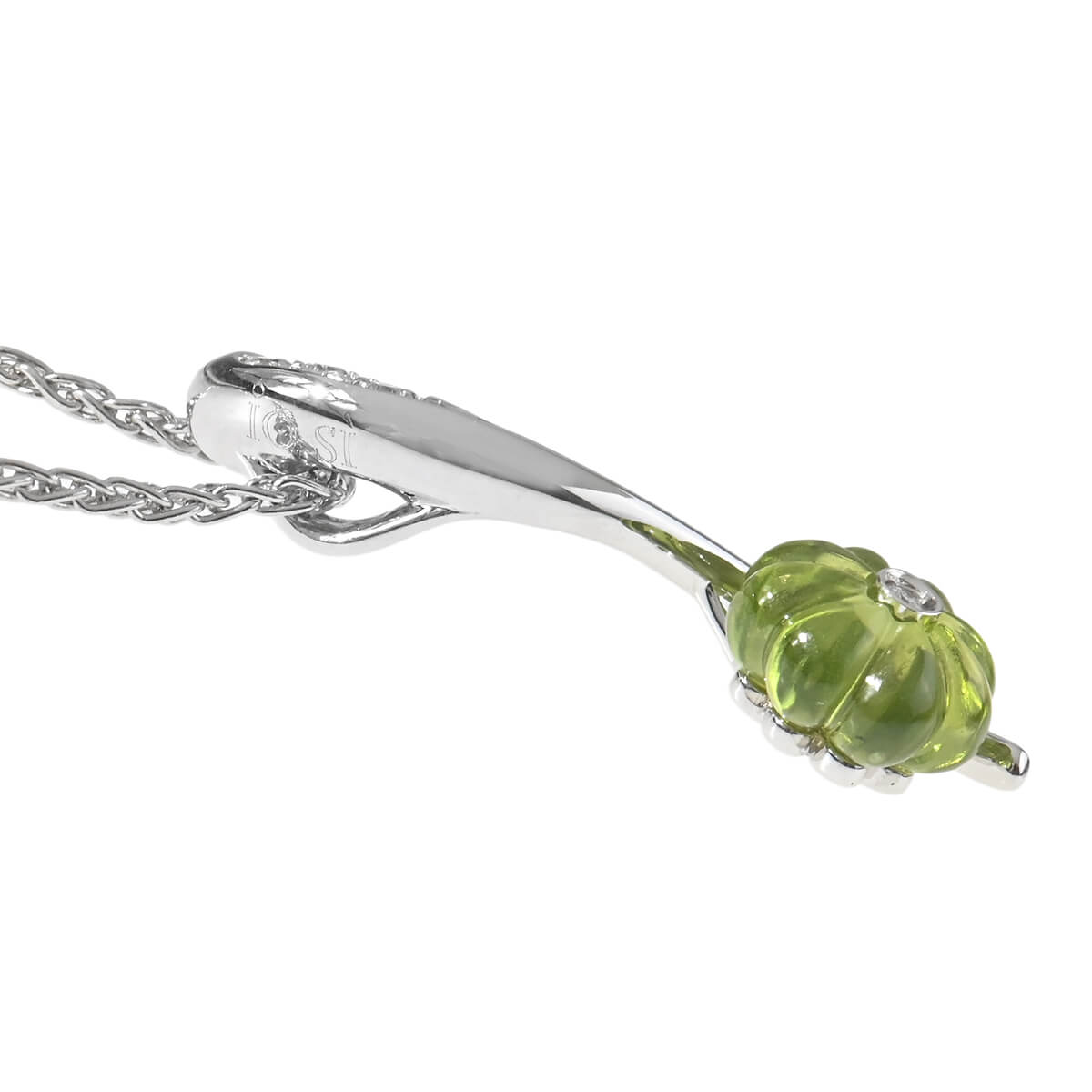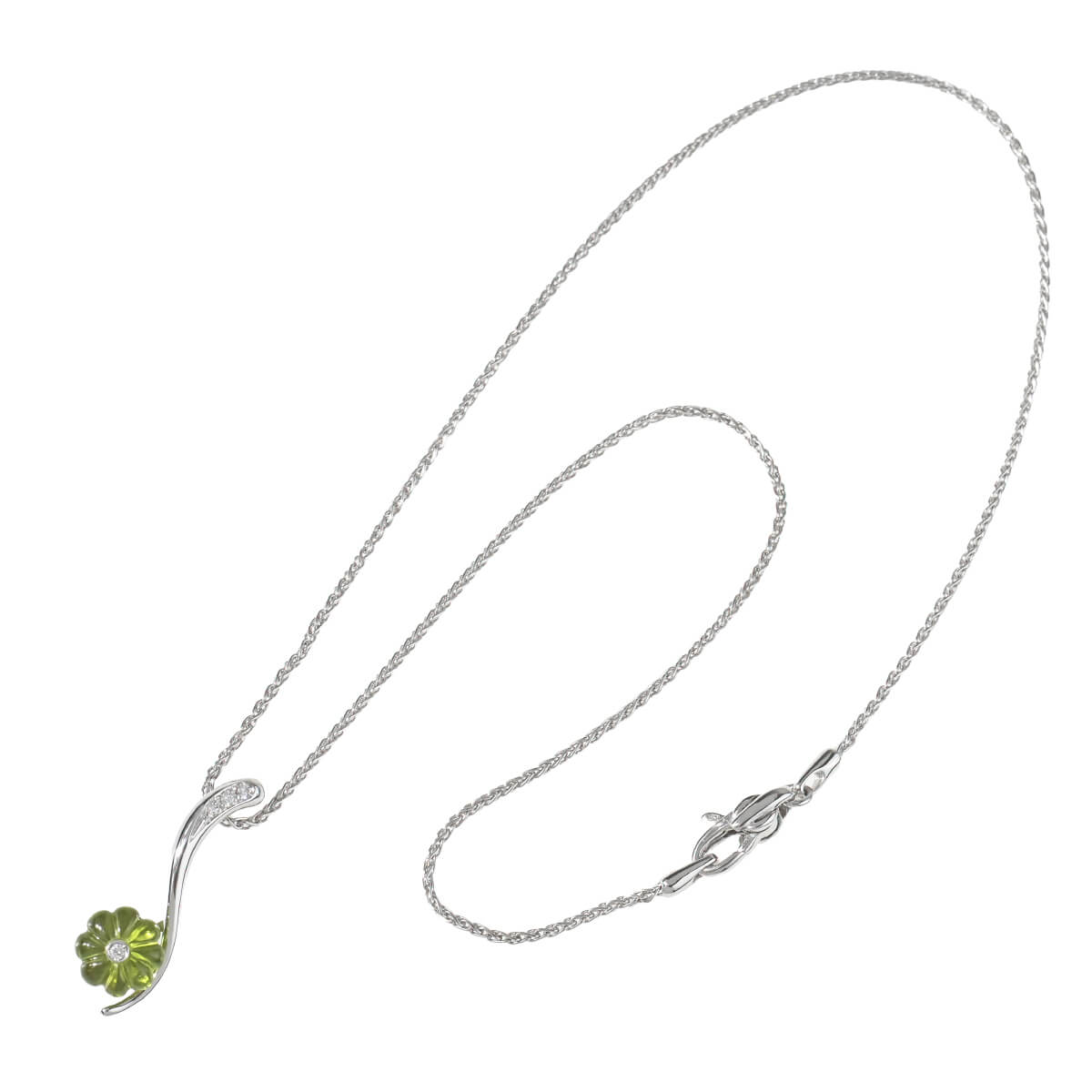 1911年、ミラノで創業し、他に類を見ないエレガントな唯一無二のデザインを手仕事によって作り出し、世界中の人々を魅了し続ける、屈指の名門ハイジュエラー『SCAVIA(スカヴィア)』のファインジュエリーライン『io si SCAVIA(イオシー スカヴィア)』。独創的で他に類をみないエレガントで優美なデザインと、イタリアに伝わる伝統的かつ高度な技術の融合から生みだされているスカヴィアのジュエリーの数々は、都市、自然、神話…そして何よりそのジュエリーを身につけるひとをインスピレーションにデザインされているそう。スカヴィアらしい、空間的で洗練されたデザインがスタイリングをさりげなくも優しく彩る、ホワイトゴールド製ペンダントネックレス。ペリドットで形づくられた一凛のお花を撫でる風のように描かれたホワイトゴールドのマテリアルとダイヤモンドとのコントラストも美しく、大人のエレガンスがありながら、ポップな個性をもったファインジュエリーです。