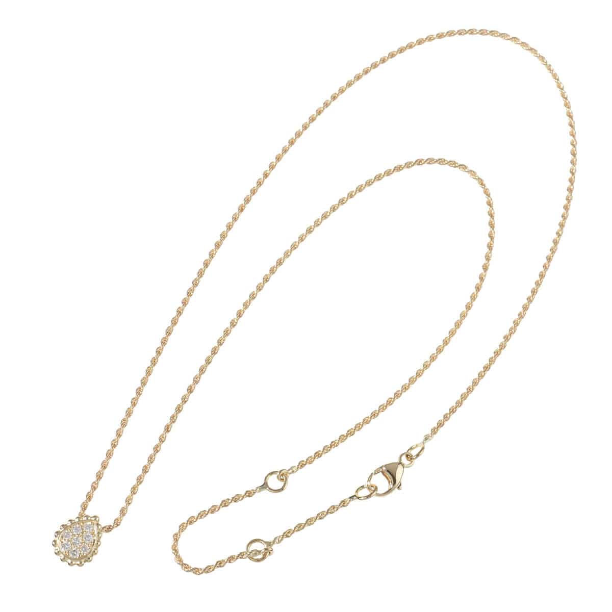時代を超えて『BOUCHERON(ブシュロン)』のクラシックとして存在を確立した「セルパンボエム」は、守り神の象徴であり不死のシンボルでもあるスネークをモチーフとしたジュエリーコレクションです。まばゆいばかりの煌めきをまとった、ヘビの頭部のイメージから生まれたドロップモチーフが印象的な存在感を放つ、イエローゴールド製ペンダント。宝石の魔術師と呼ばれるメゾンの職人たちによるグレインセッティング技法はダイヤモンドにさらなる輝きをもたらし、そのダイヤモンドを取り囲む可憐なビーズと繊細なツイストチェーンがペンダントの輝きを高めています。メゾンのさまざまなコードやエスプリを引き継ぎながら、現代の新しい美学を主張しているペンダントです。