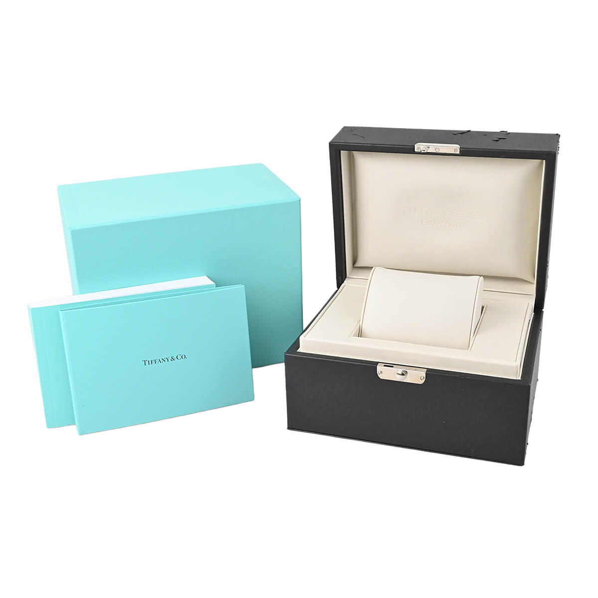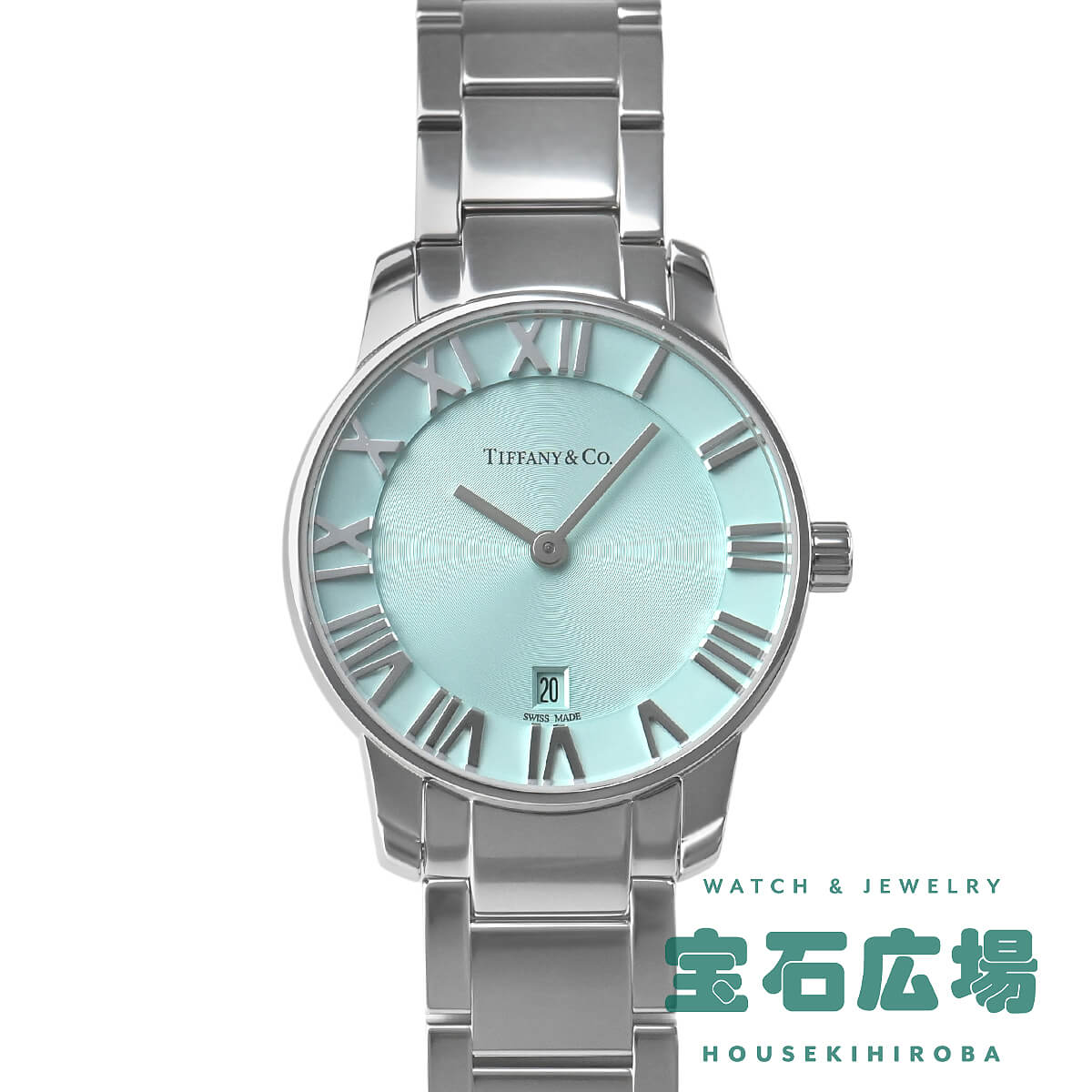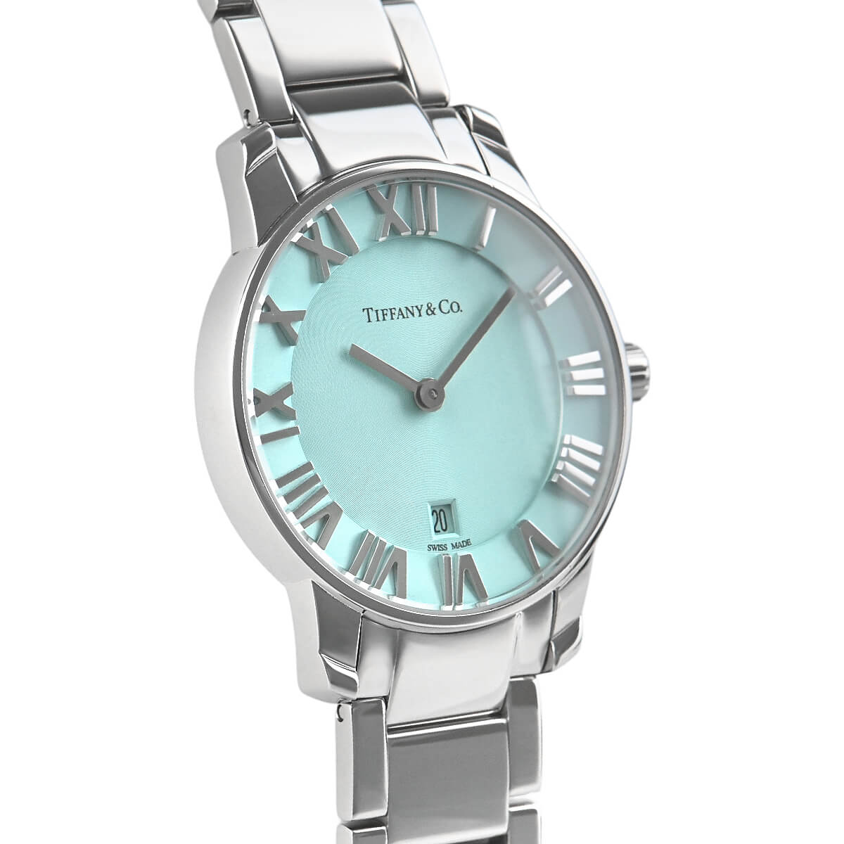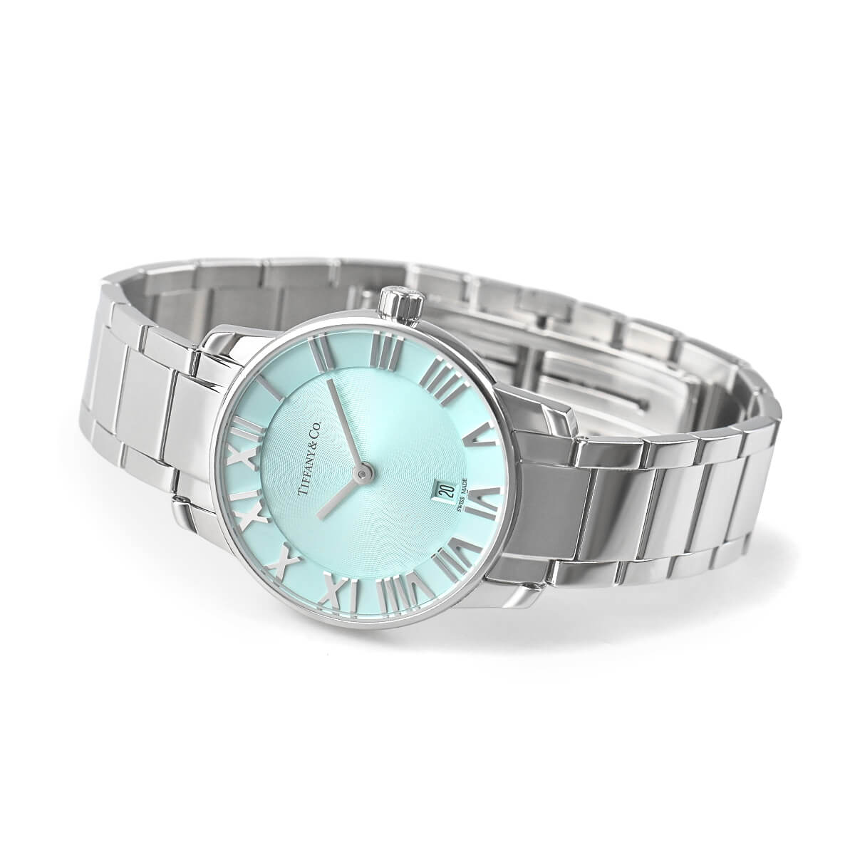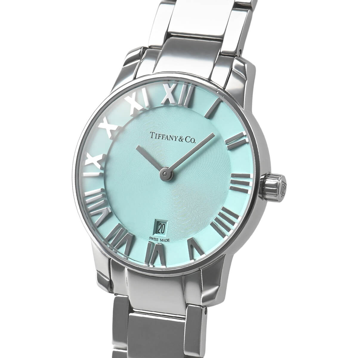 ニューヨーク本店の正面玄関に飾られた時計、アトラスクロックがモデルの由来になっている「アトラスウォッチ」。立体的なローマンインデックスがアトラスの特徴ですが、こちらの「アトラス2ハンド」は、その特徴にティファニーブルーを合わせたレディースモデル。
