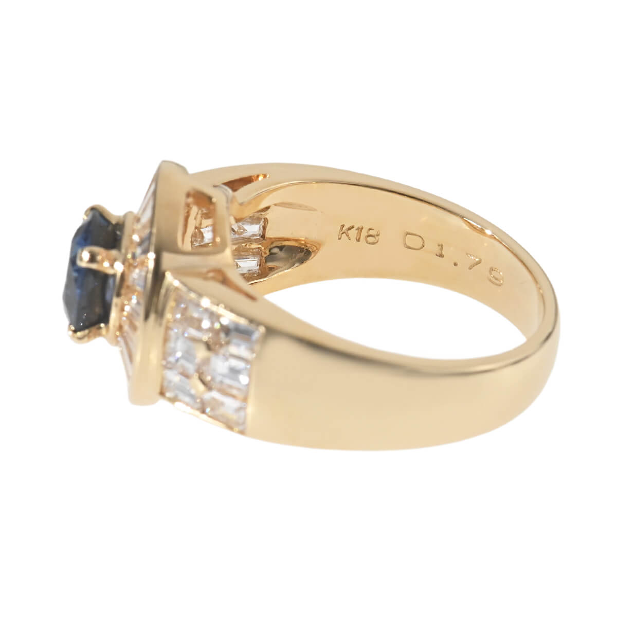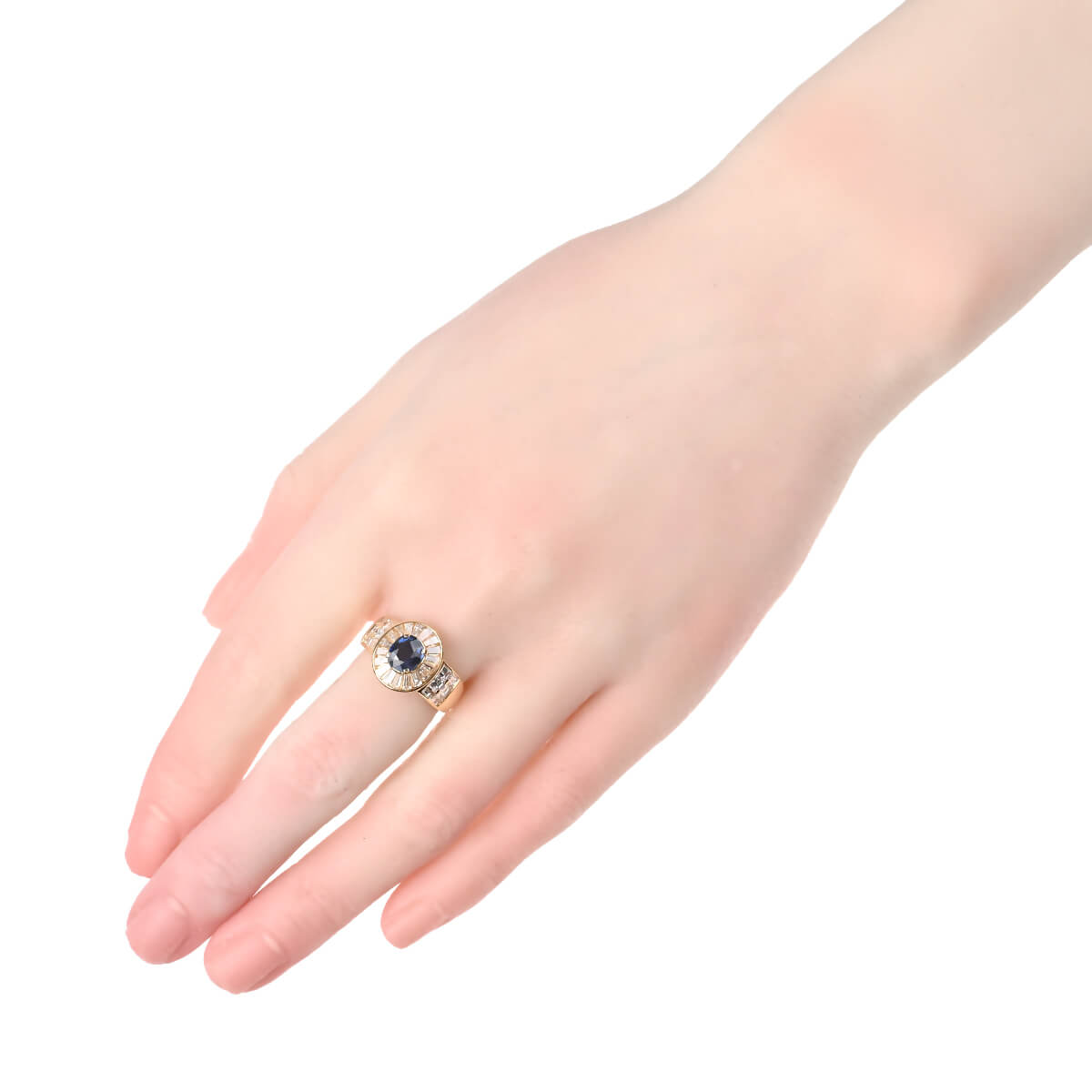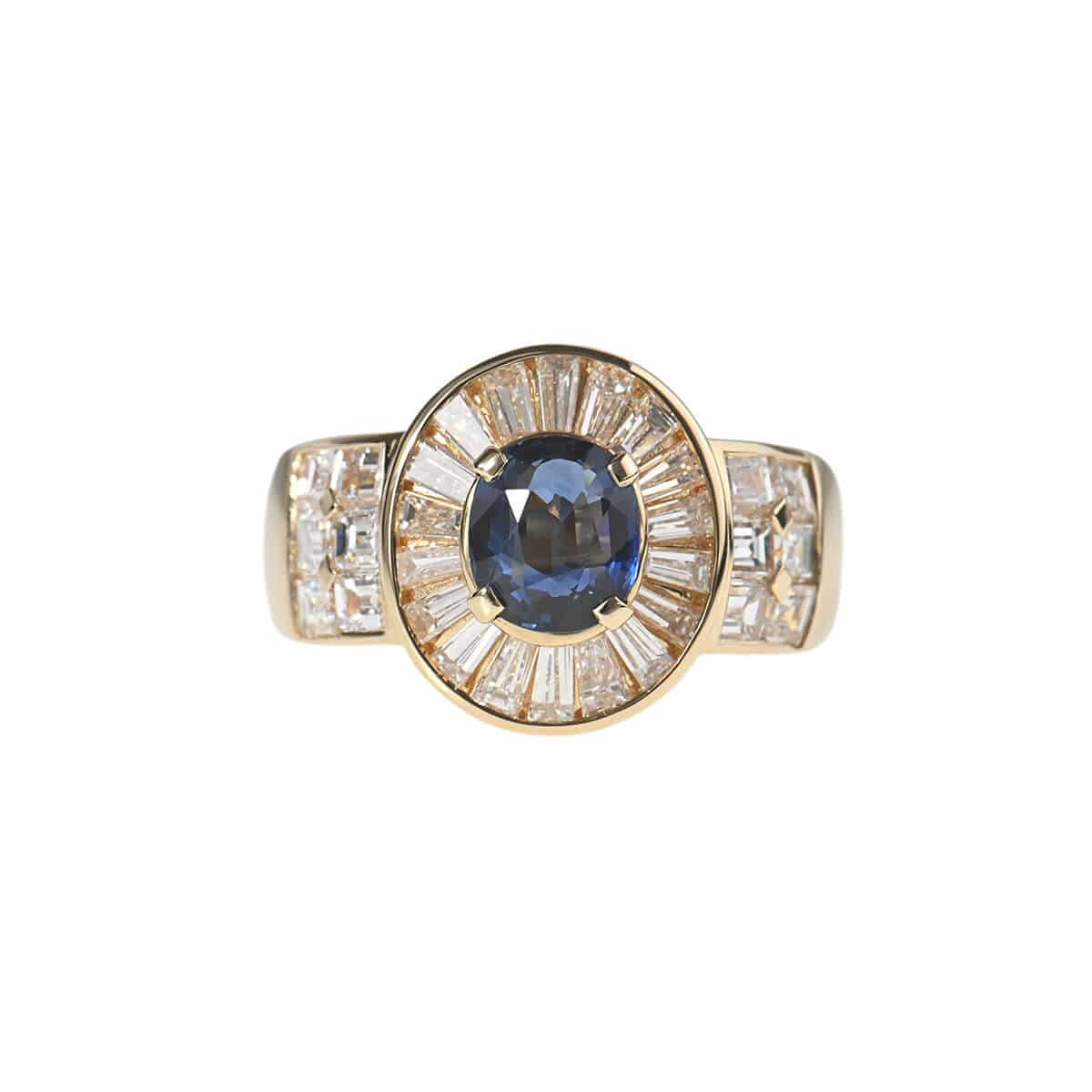 天空の色とつながり、地球の青、宇宙の青として最も神に近い石とされてきた宝石「サファイア」。“青”を意味するラテン語、「SAPPHIRUS(サッピールス)」が名前の由来とされるサファイアは、“誠実、慈愛、徳望”といった宝石言葉を持ち、知性や平和の象徴としても愛されて続けています。天然石ならではの透明感あふれる濃紺のサファイアが美しい、イエローゴールド製リング。サファイアを囲むテーパーカットのダイヤモンドの大胆な煌めきと、夜の海のような深いブルーのサファイアのコントラストが指先で印象的なコントラストを魅せています。しっかりと丁寧につくりこまれた重厚感も魅力の、美しく上質なカラーストーンジュエリーです。