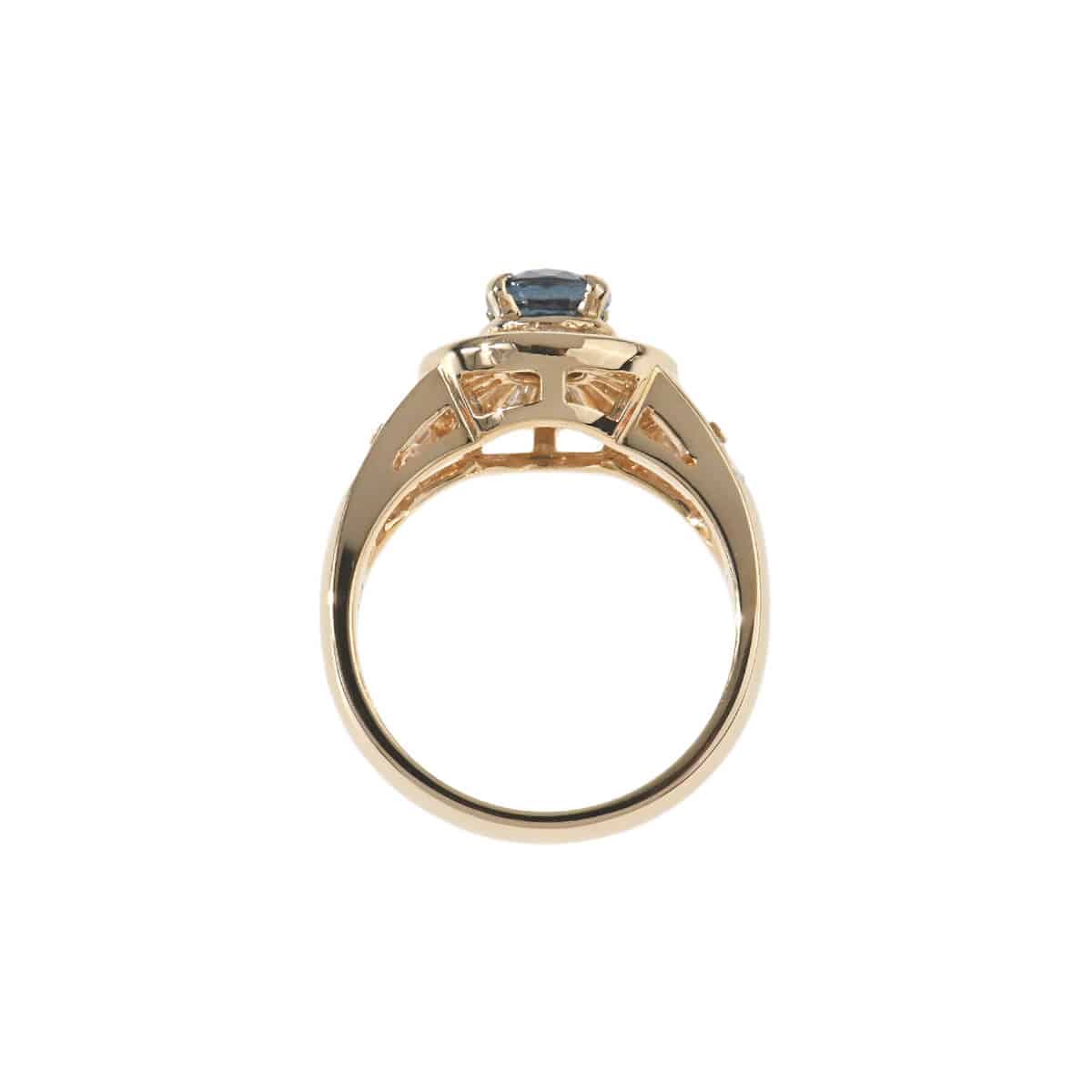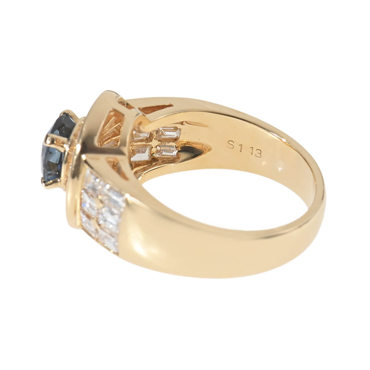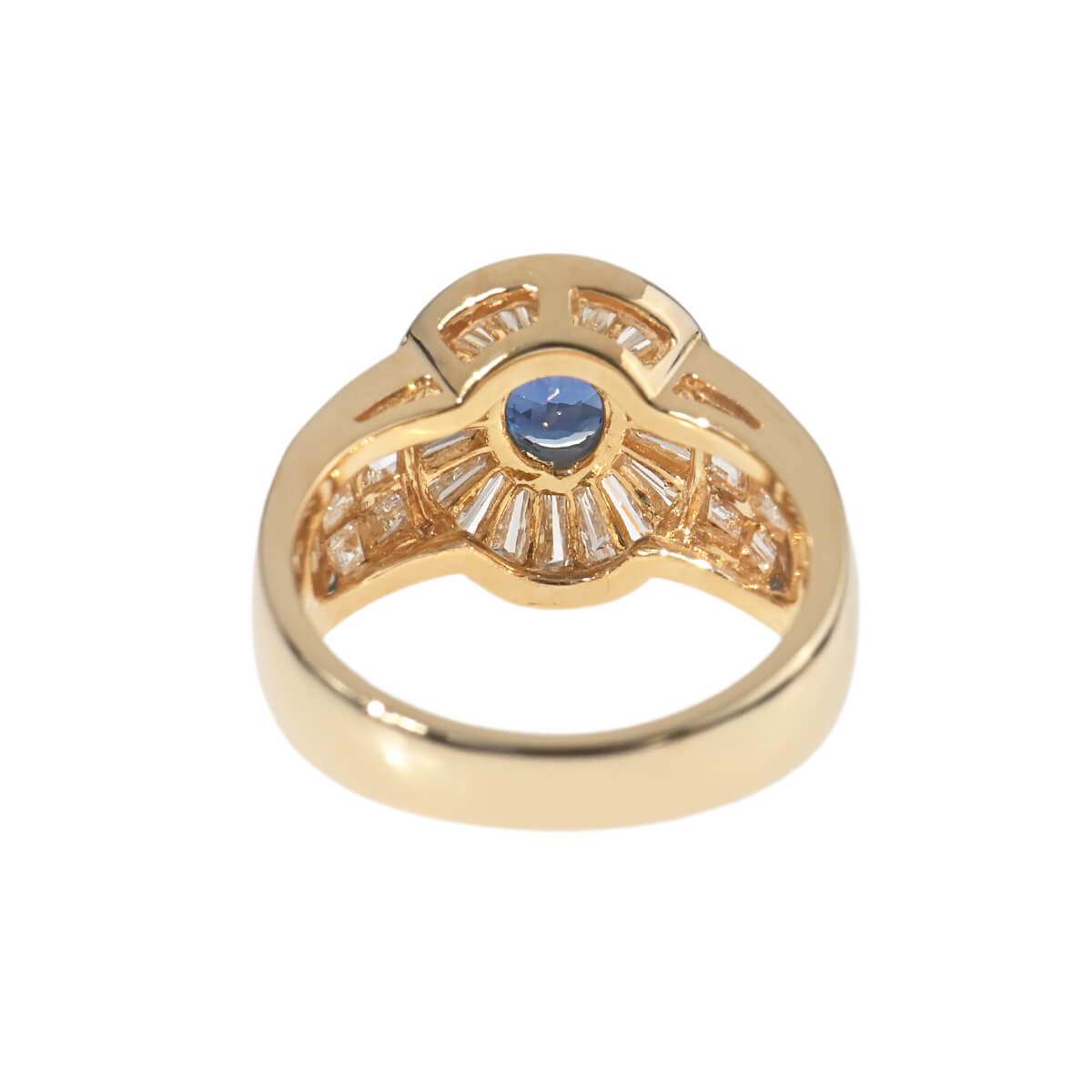 天空の色とつながり、地球の青、宇宙の青として最も神に近い石とされてきた宝石「サファイア」。“青”を意味するラテン語、「SAPPHIRUS(サッピールス)」が名前の由来とされるサファイアは、“誠実、慈愛、徳望”といった宝石言葉を持ち、知性や平和の象徴としても愛されて続けています。天然石ならではの透明感あふれる濃紺のサファイアが美しい、イエローゴールド製リング。サファイアを囲むテーパーカットのダイヤモンドの大胆な煌めきと、夜の海のような深いブルーのサファイアのコントラストが指先で印象的なコントラストを魅せています。しっかりと丁寧につくりこまれた重厚感も魅力の、美しく上質なカラーストーンジュエリーです。