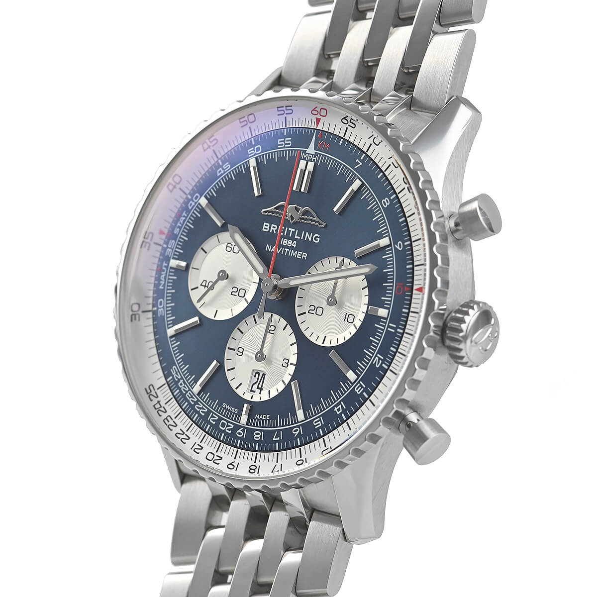 自社製クロノグラフムーブメントのB01を搭載した【ナビタイマーB01 クロノグラフ46】が入荷しました。文字盤12時位置のメーカーロゴがAOPAの本来の翼の形に戻っており、赤いクロノグラフ秒針もヴィンテージの雰囲気を際立たせています。