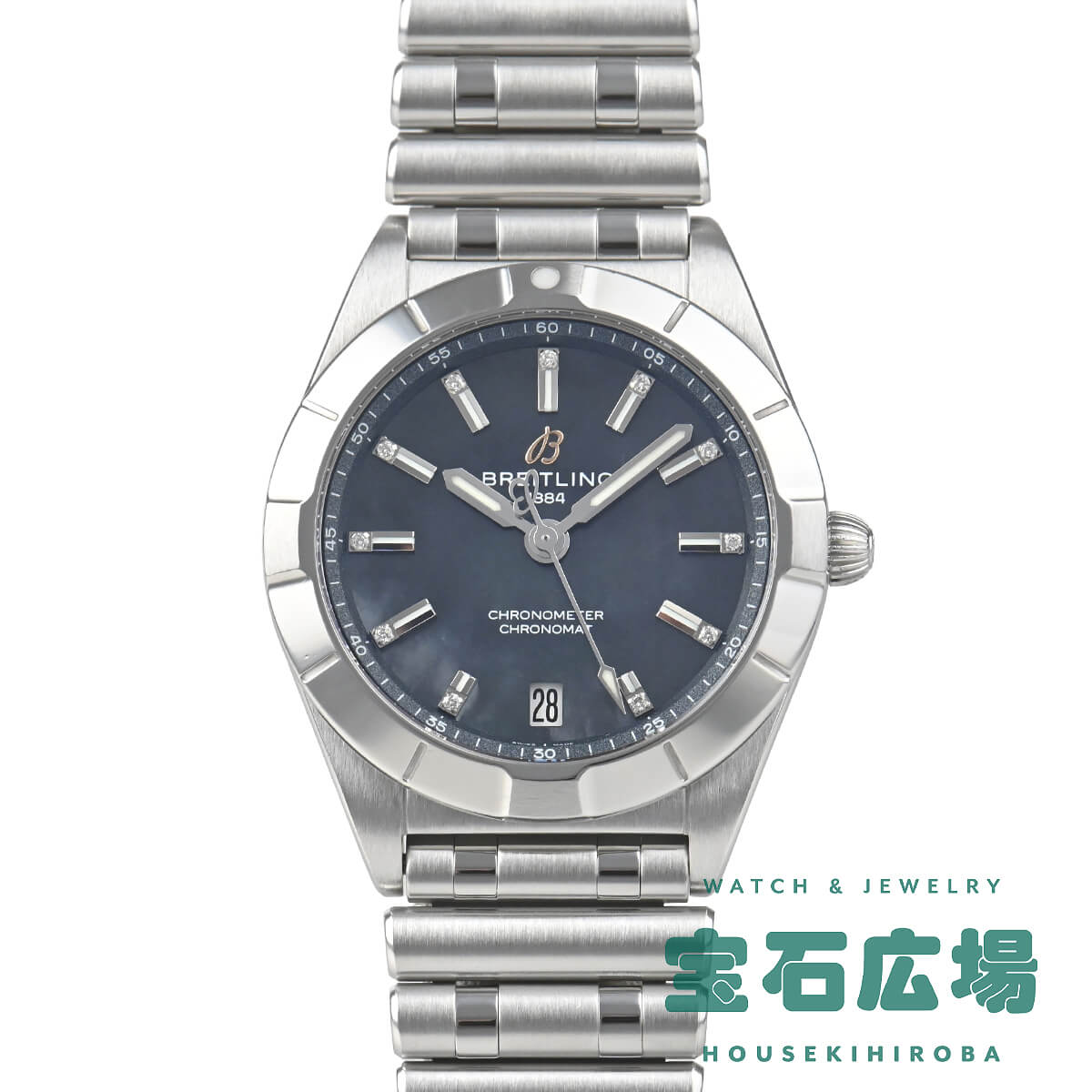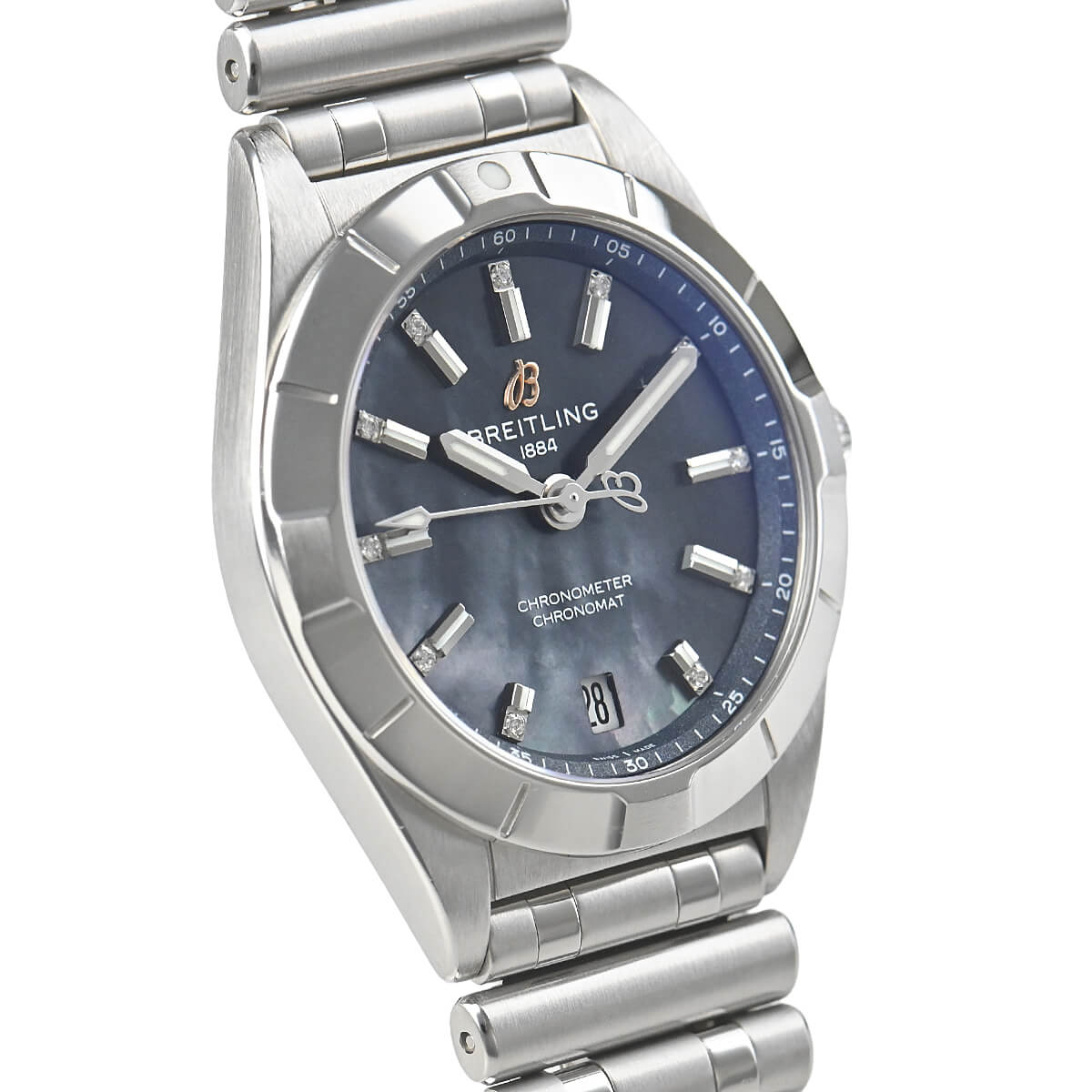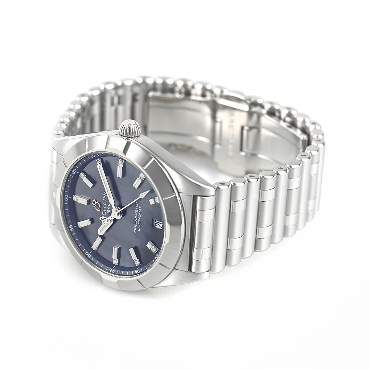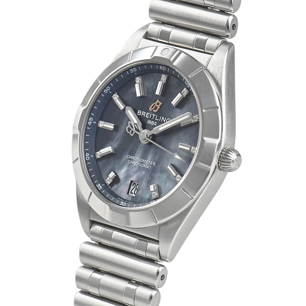 スタイリッシュかつエレガントなレディースモデルの【クロノマット32】が入荷しました。ブライトリングがかつてのデザインはそのままに再構築したルーローブレスは女性らしさの中にスポーティさをうまく演出しております。32mmケースにシェル文字盤、バーインデックスの先にはダイヤモンドが配されており、華やかな一本です。