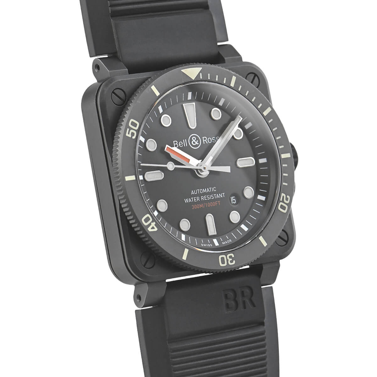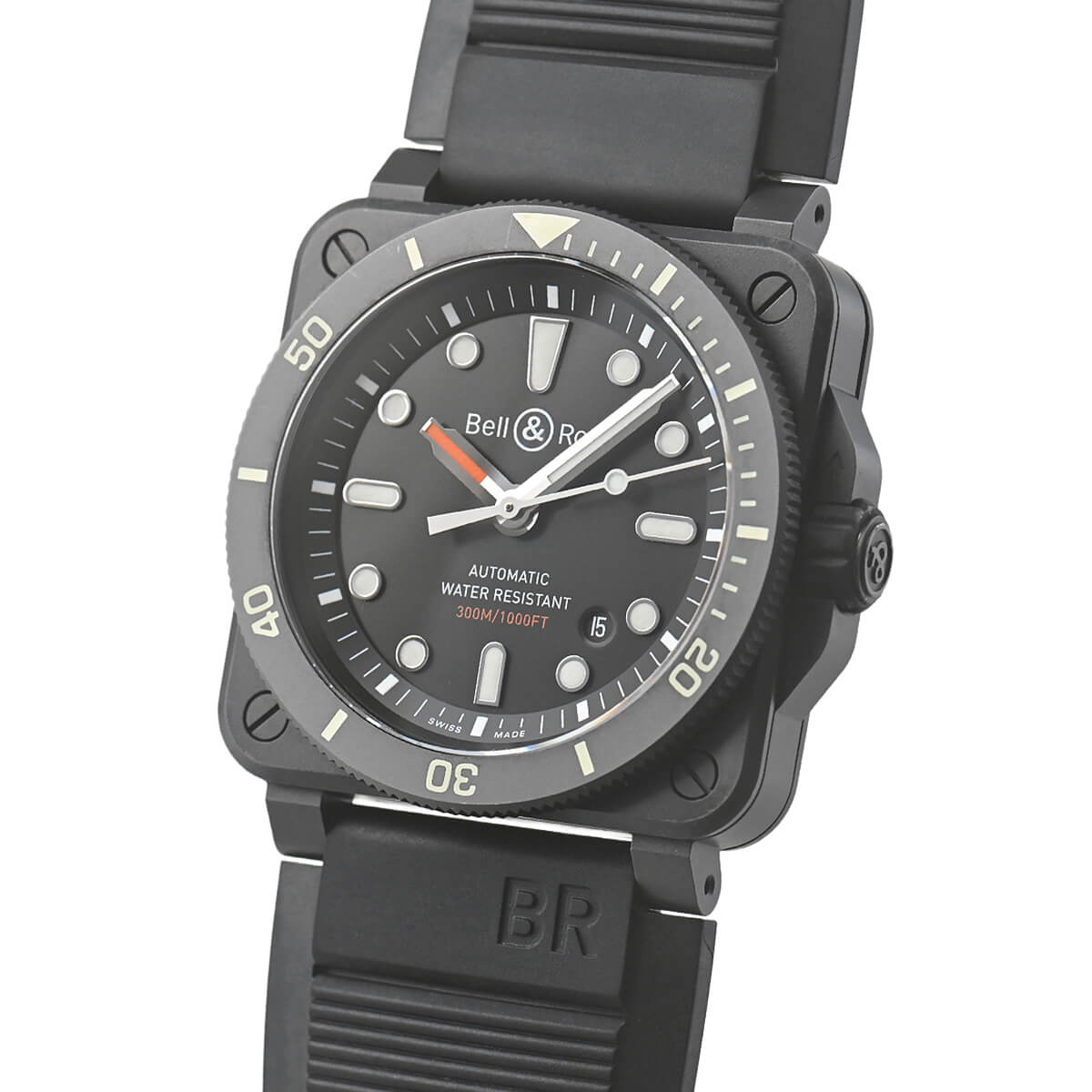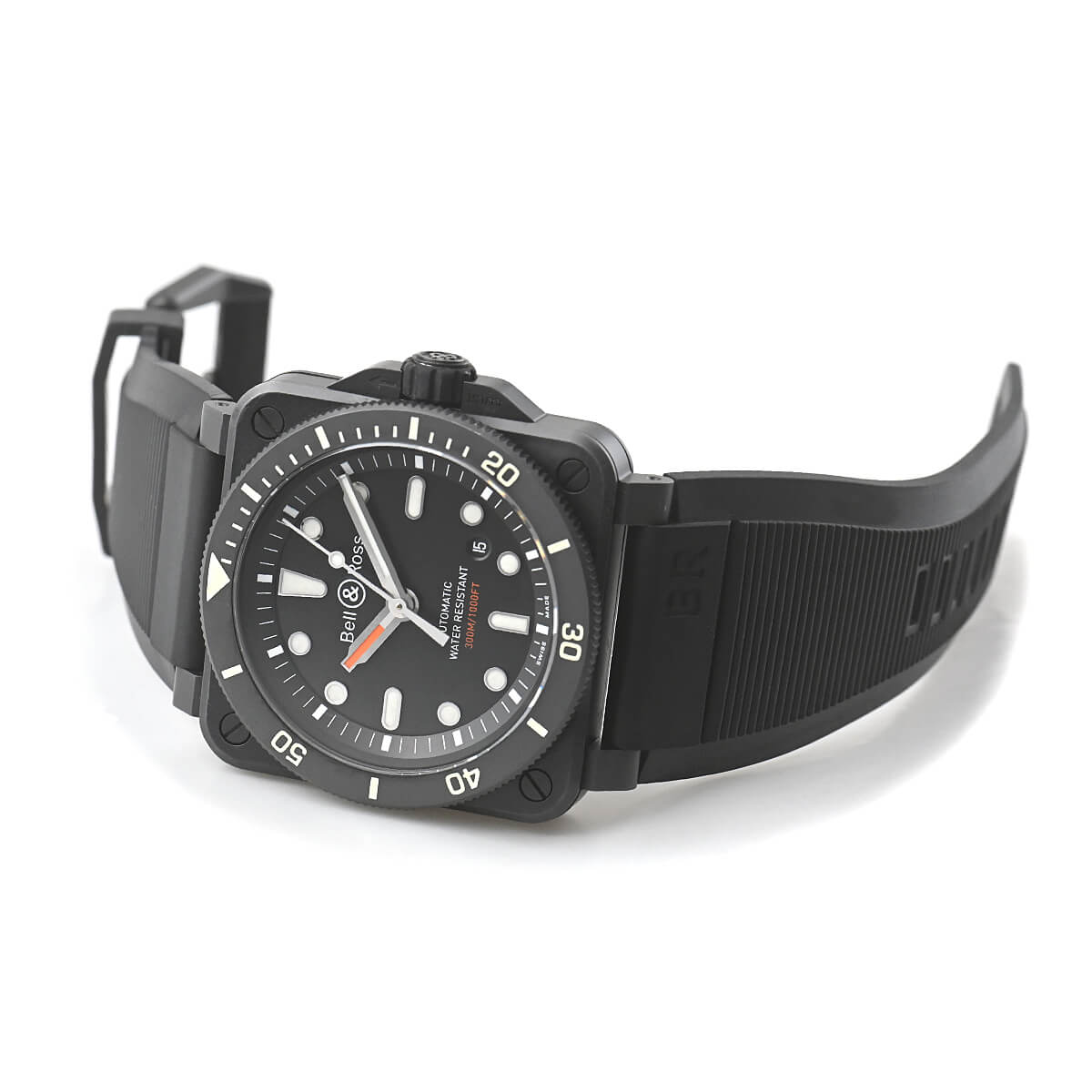 スクエアケースのBR03では初となるダイバーモデル【BR03-92 ダイバー・ブラックマット】。ケース素材には耐傷性・耐久性に優れたブラックセラミックを採用してます。