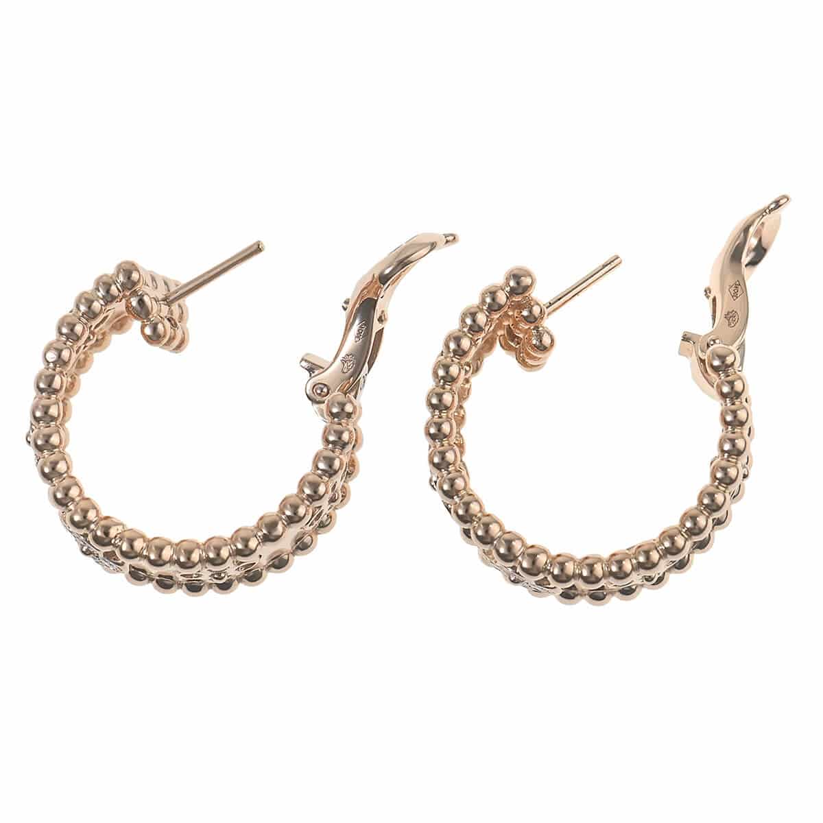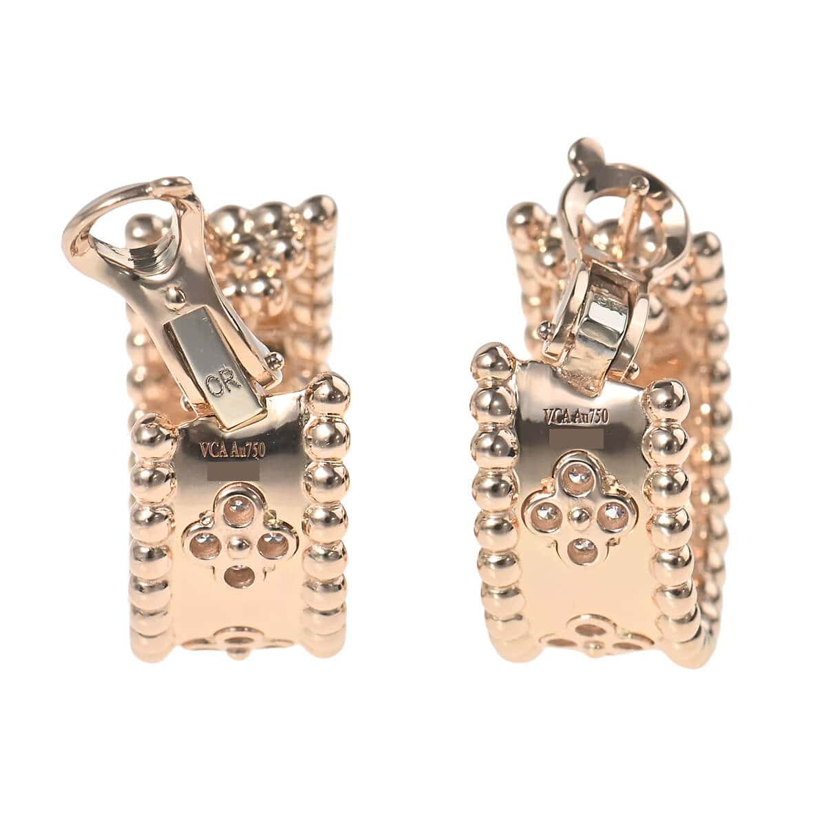 言わずと知れたパリの老舗ハイジュエリーメゾン『VanCleef&Arpels(ヴァンクリーフ&アーペル)』を象徴する数々のコレクションでも重要な装飾として受け継がれてきた、ゴールドビーズを主役にした「ペルレ」コレクション。ゴールドの素材選定はもちろんのこと、なめらかな丸みを帯びたフォルムに整える研磨の工程など、複雑にして正確性を求められるデザインに卓越した職人技術の真骨頂を感じさせる、繊細でありながら華やかなコレクションです。フランス語で真珠を意味するコレクションの名の通り、美しいフォルムの艶やかな丸いビーズの連なりで縁取られた、「ペルレ クローバー」のローズゴールド製フープイヤリングピアス。ダイヤモンドの煌めきを纏ったメゾンの幸運のシンボルである貴重なクローバーモチーフがステーションされたフープが、横顔まで可憐に、フェミニンに印象づけます。