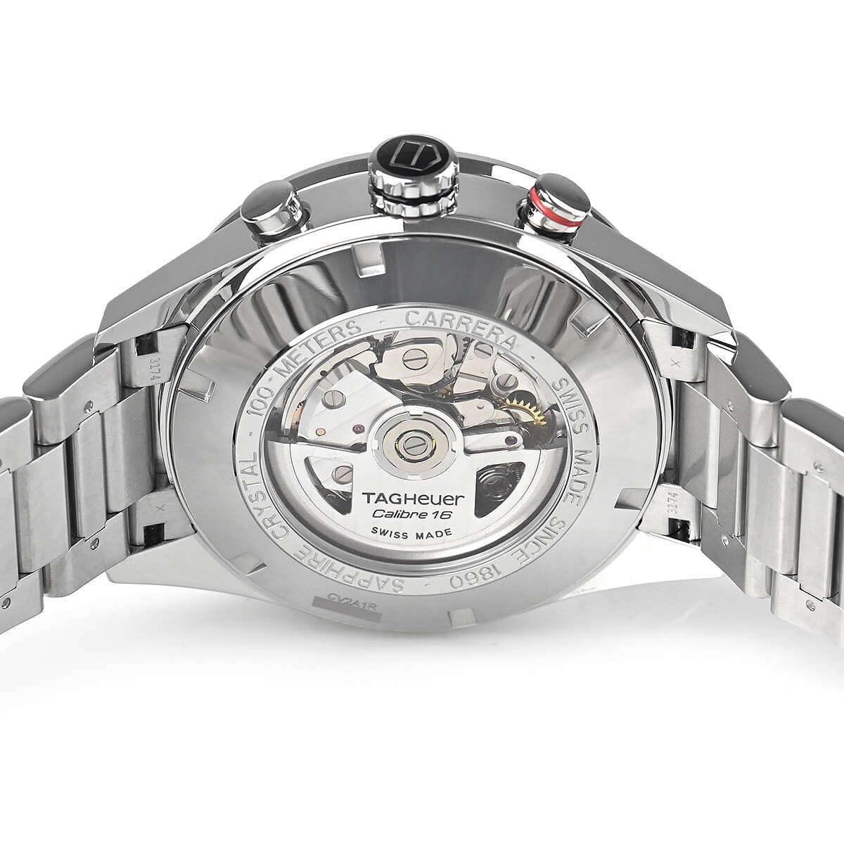 ケースはシースルーバックになっており、機械式クロノグラフの動きが鑑賞できます。
