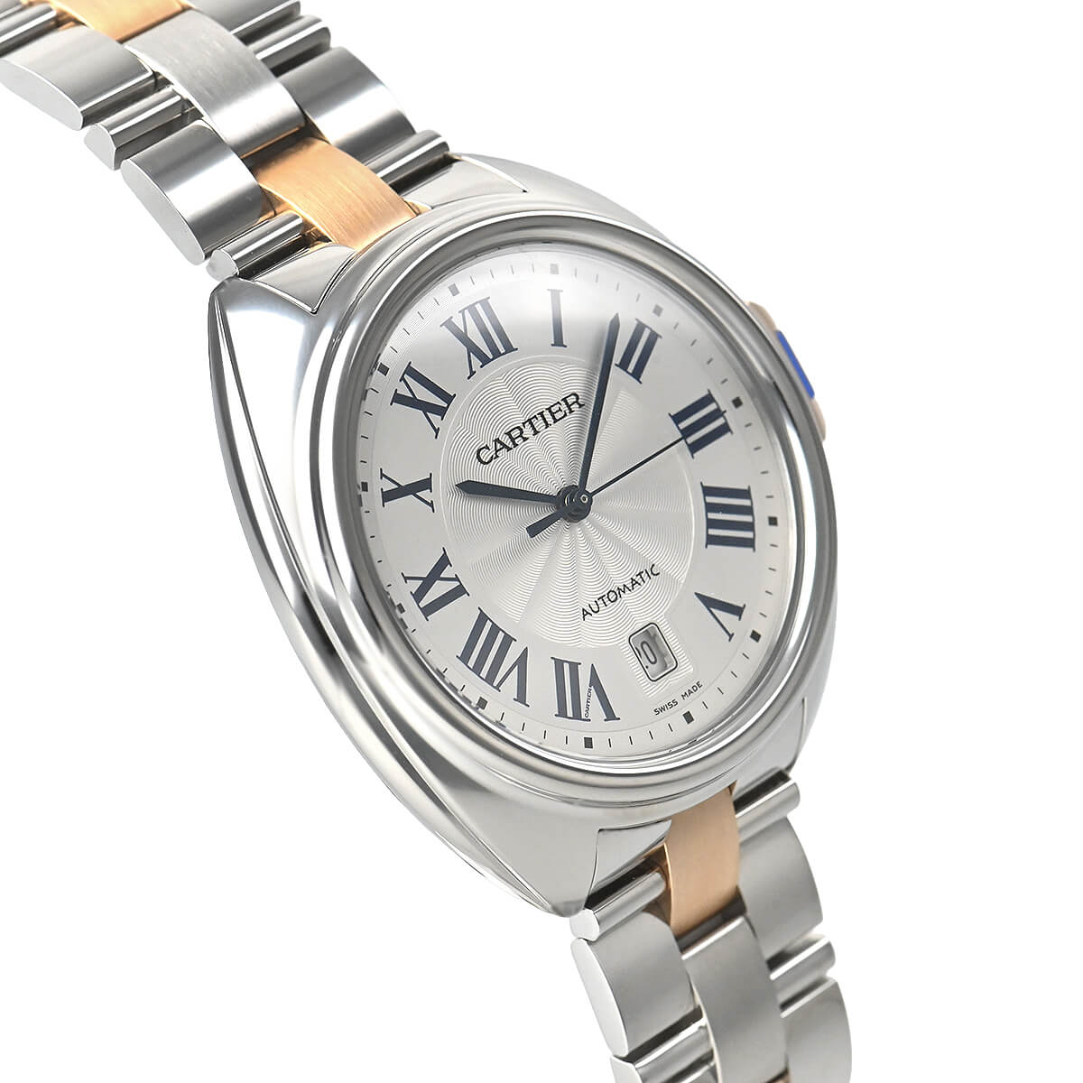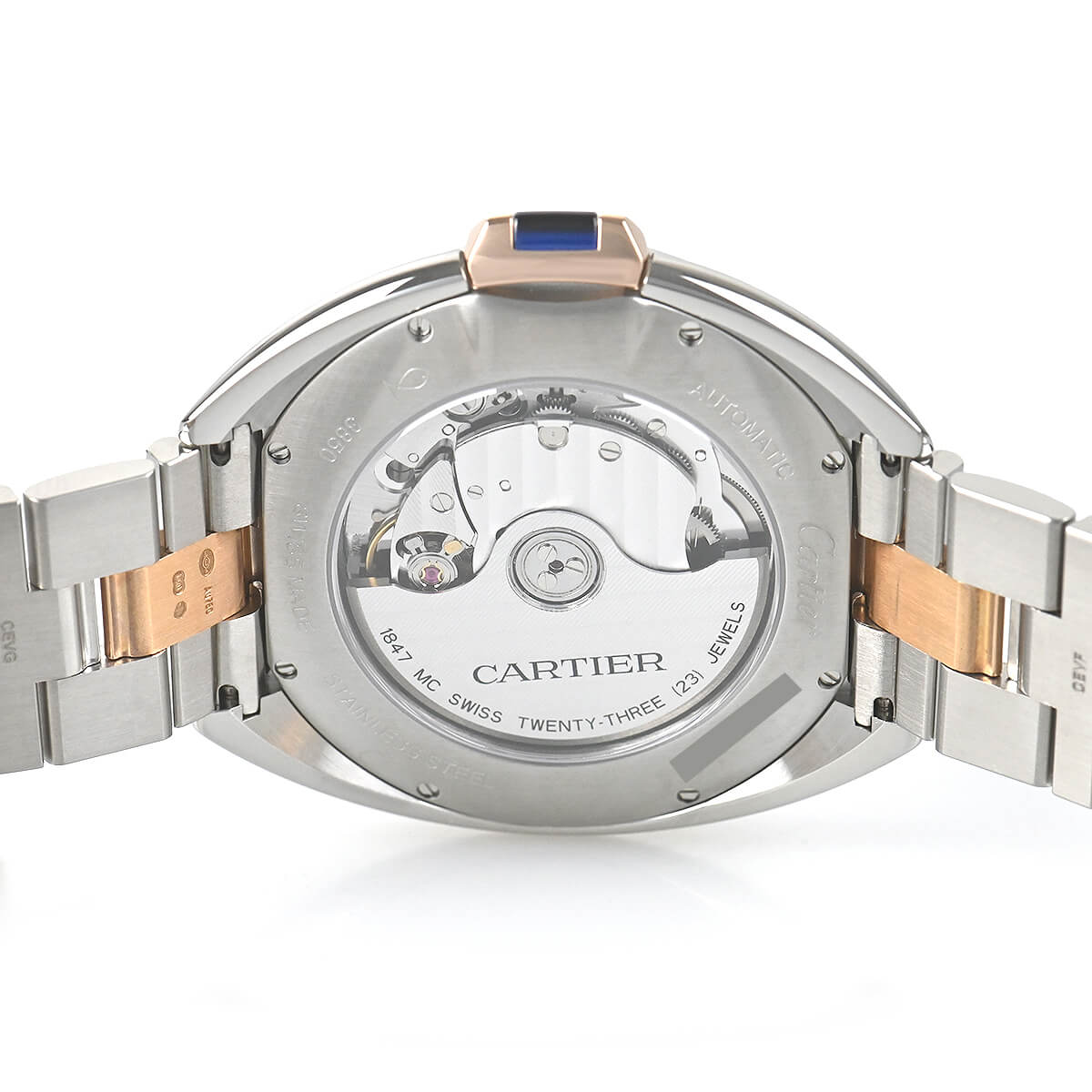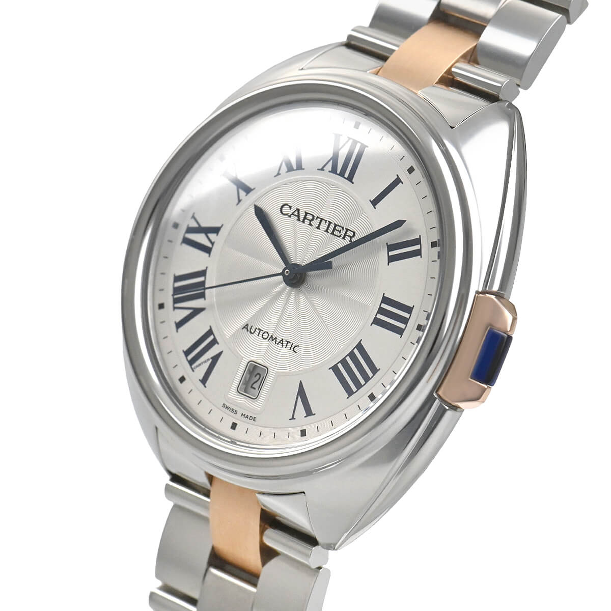 こちらはピンクゴールドとステンレスのコンビモデルで、フランケ装飾のギョーシェ彫りが施されたシルバーダイアルもカルティエらしく美しい仕上りです。