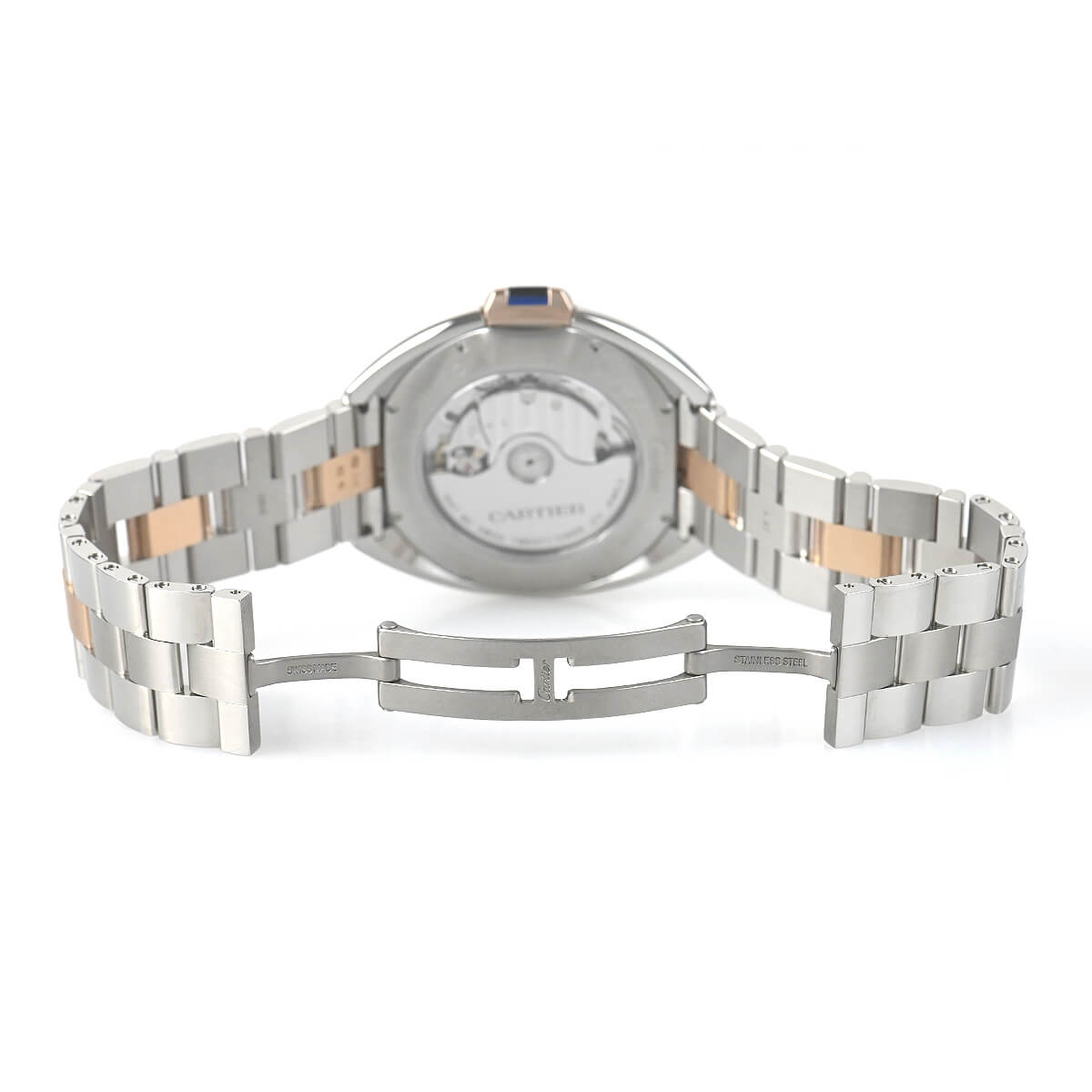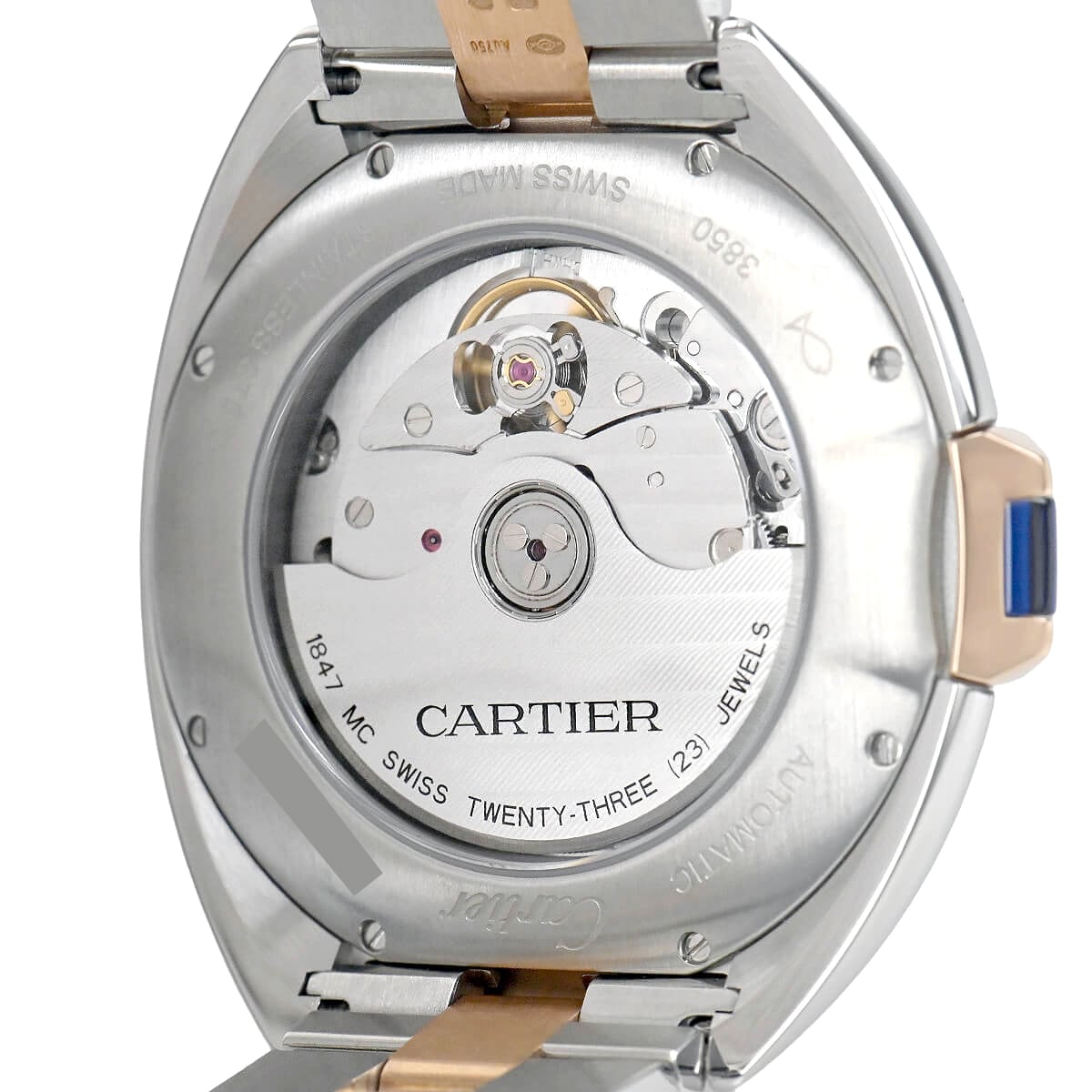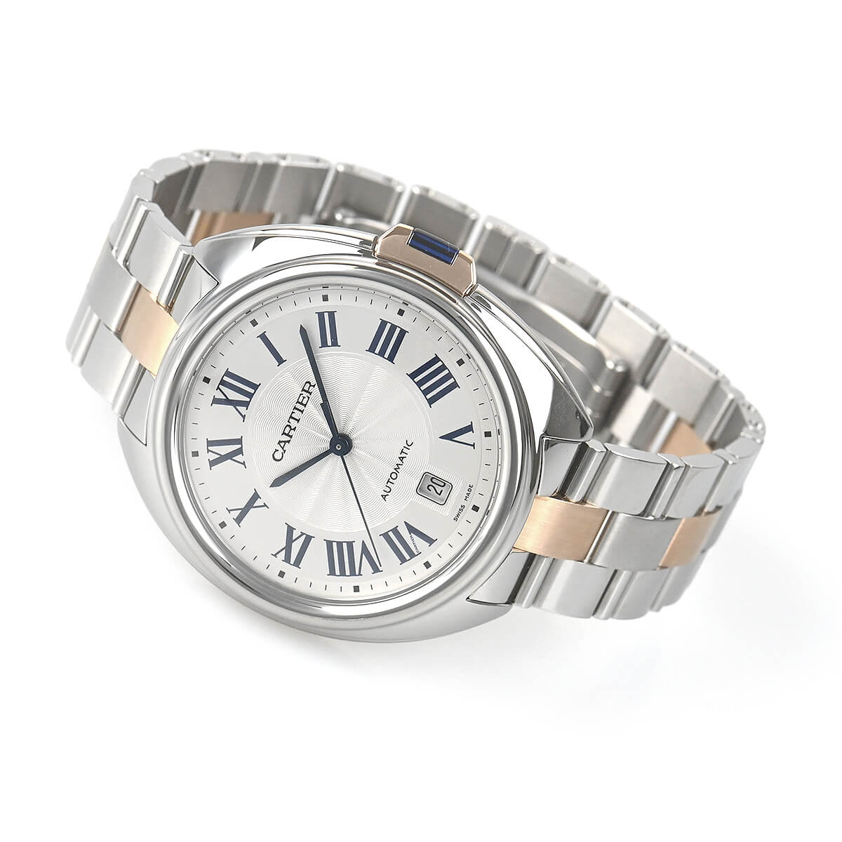 こちらはピンクゴールドとステンレスのコンビモデルで、フランケ装飾のギョーシェ彫りが施されたシルバーダイアルもカルティエらしく美しい仕上りです。