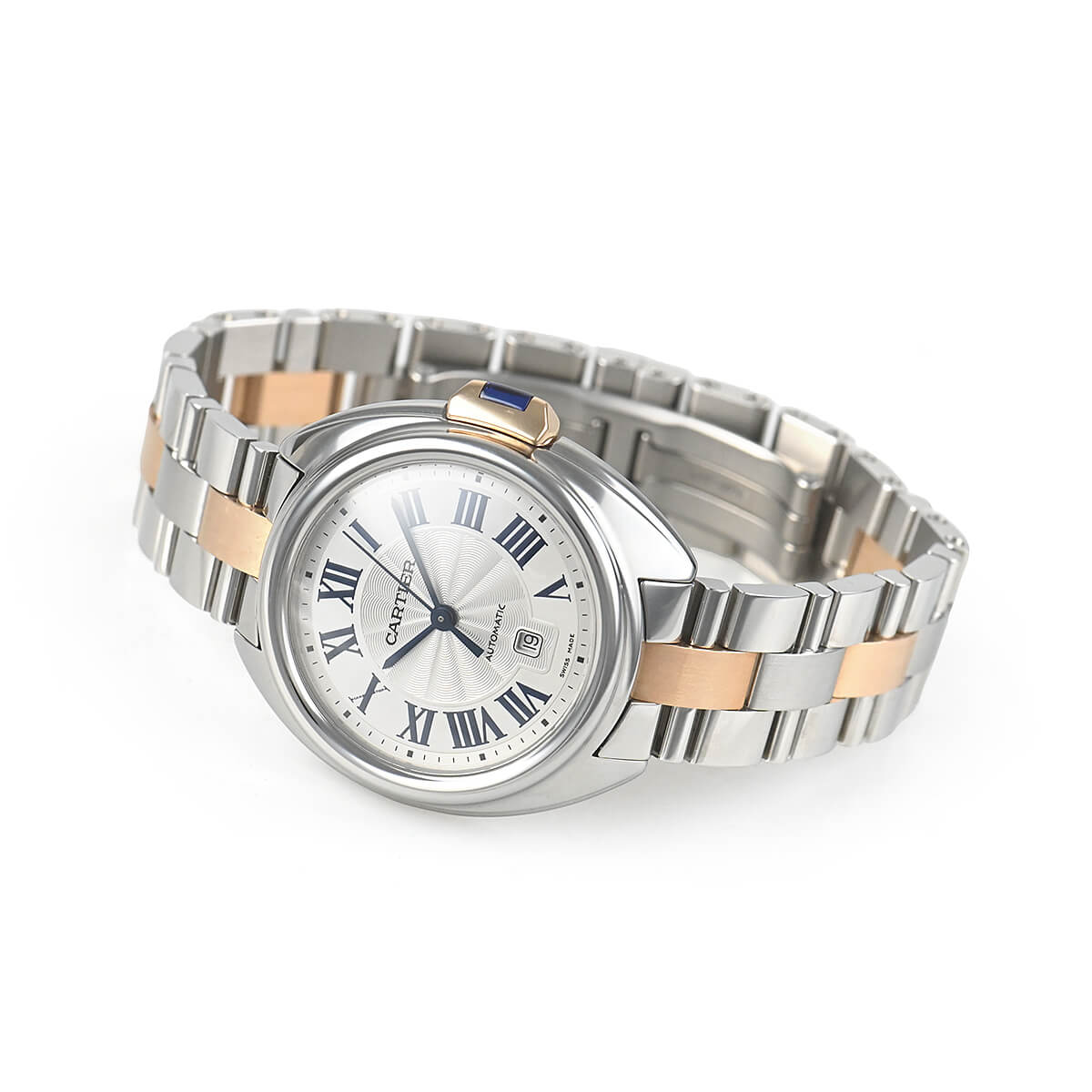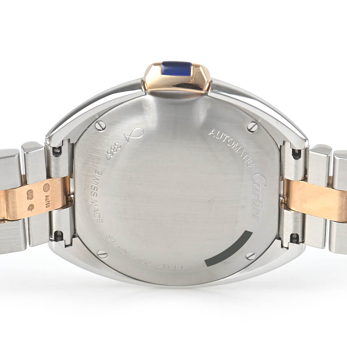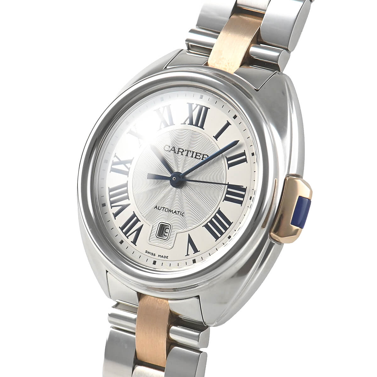 こちらはピンクゴールドとステンレスのコンビモデルで、フランケ装飾のギョーシェ彫りが施されたシルバーダイアルもカルティエらしく美しい仕上りです。