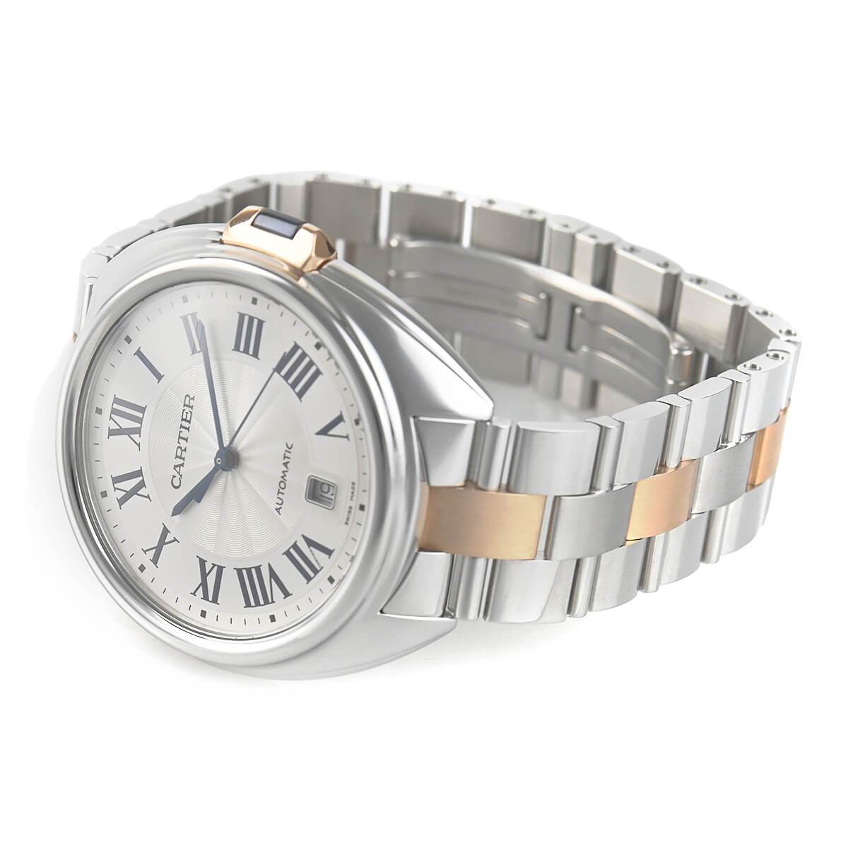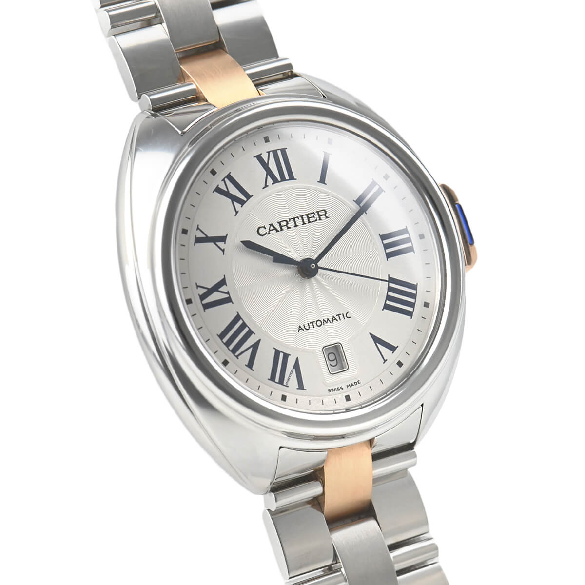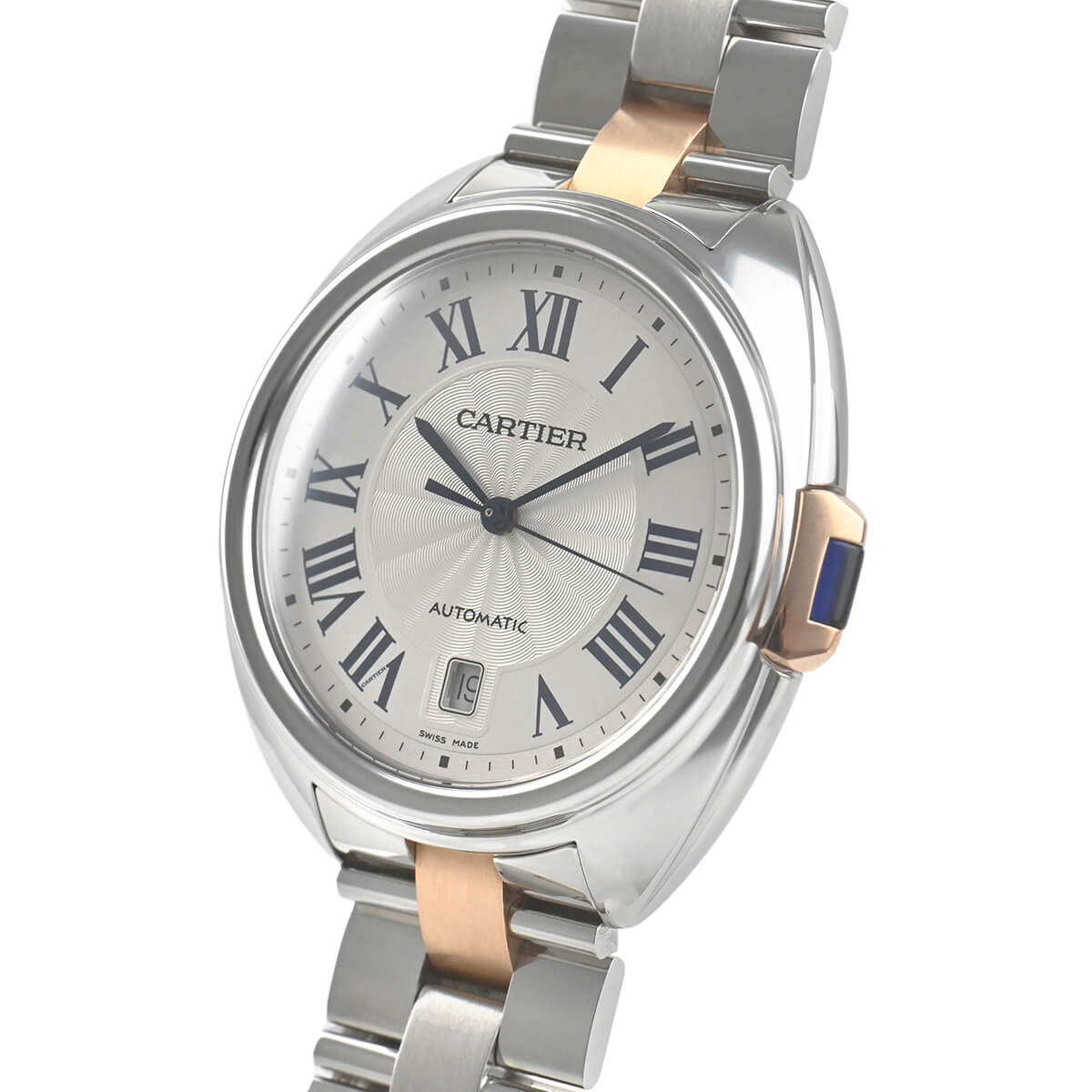 こちらはピンクゴールドとステンレスのコンビモデルで、フランケ装飾のギョーシェ彫りが施されたシルバーダイアルもカルティエらしく美しい仕上りです。