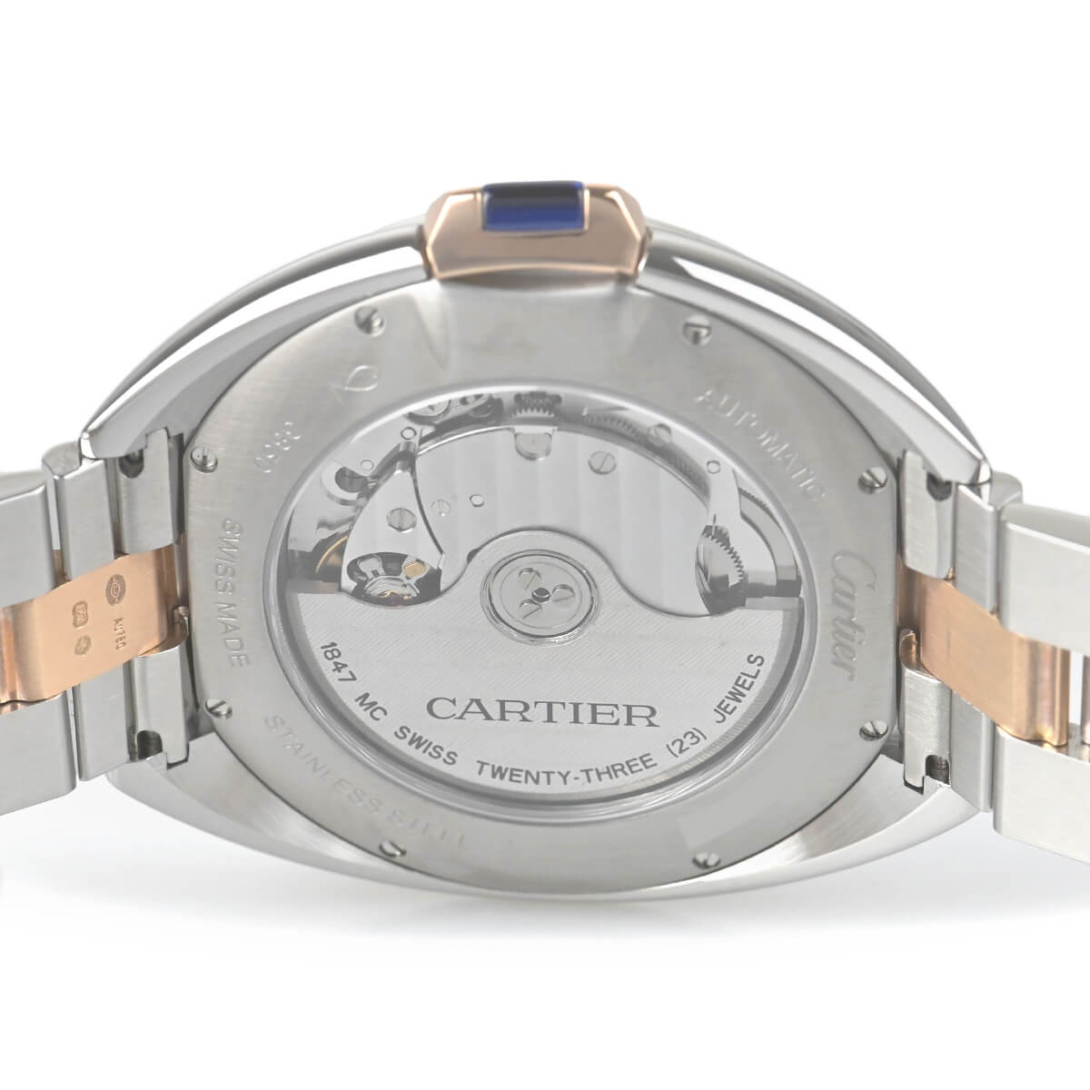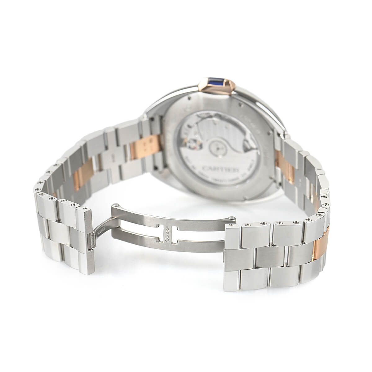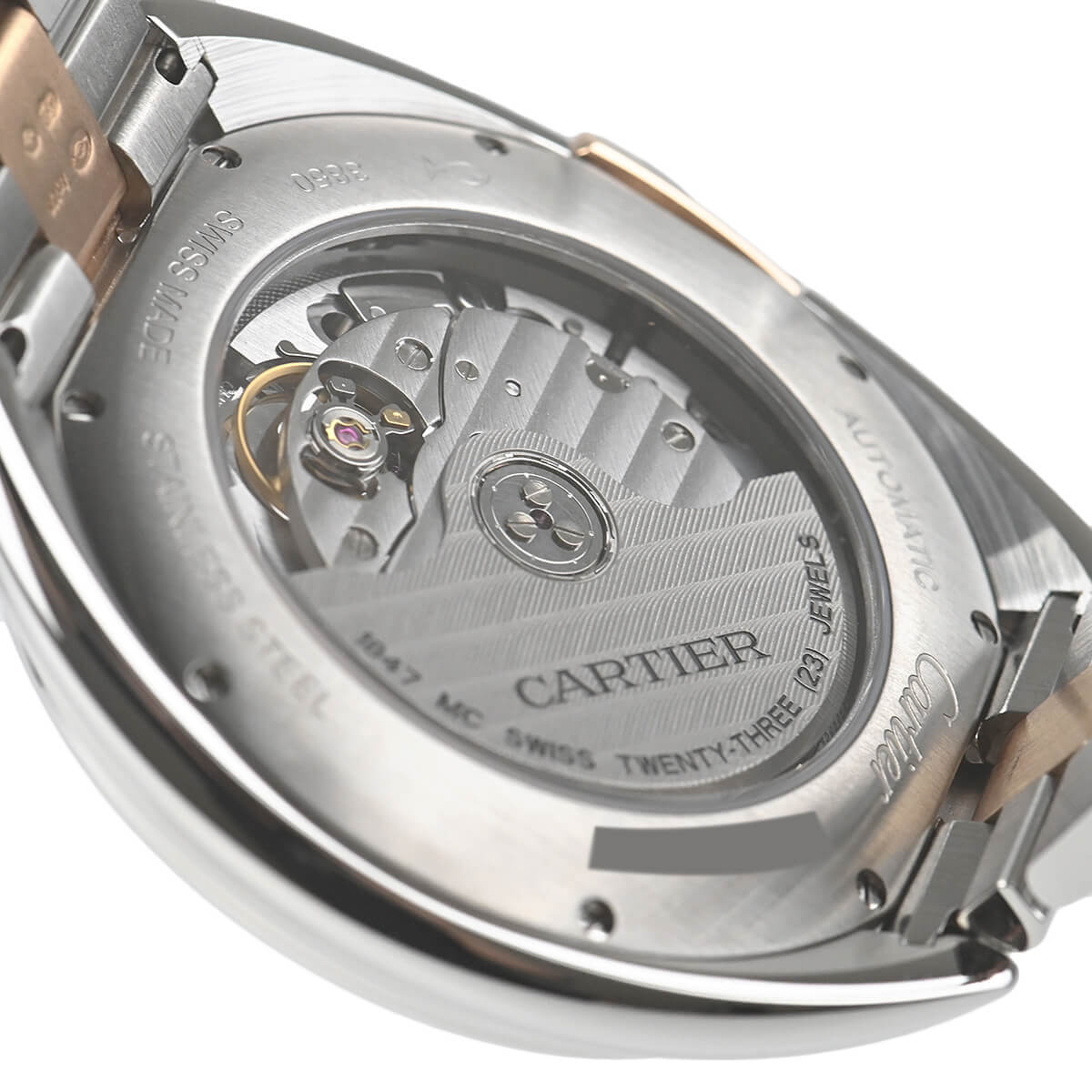 こちらはピンクゴールドとステンレスのコンビモデルで、フランケ装飾のギョーシェ彫りが施されたシルバーダイアルもカルティエらしく美しい仕上りです。
