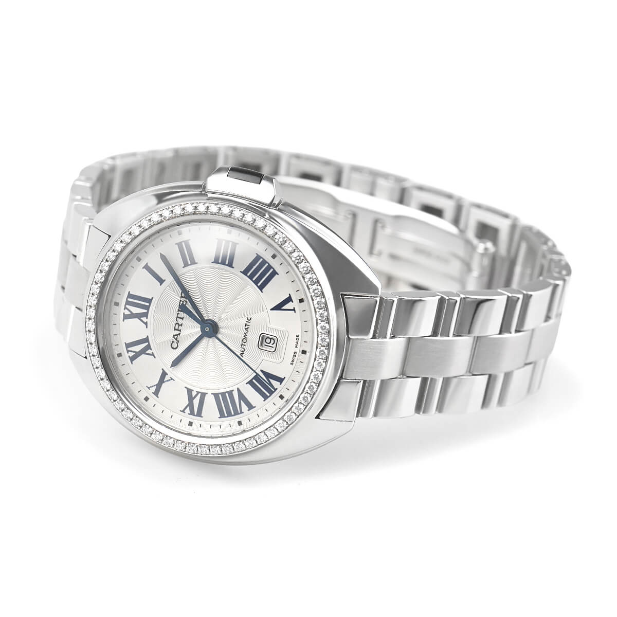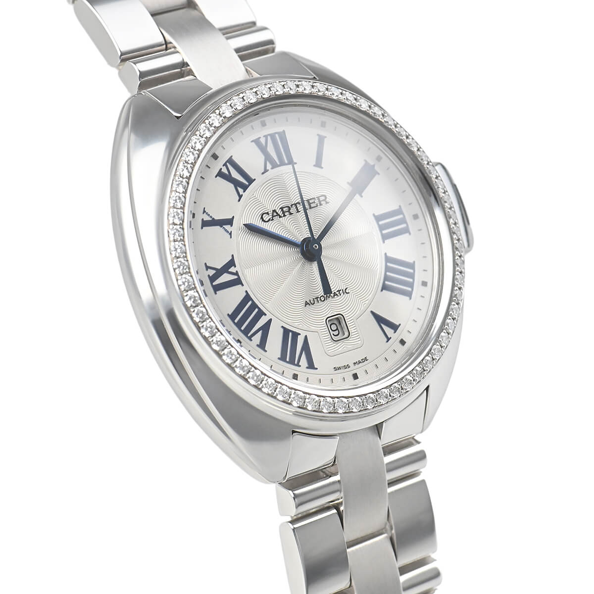 リューズのトップにはカルティエならではの高度な技術で流れるようにセッティングされたサファイアが輝きます。