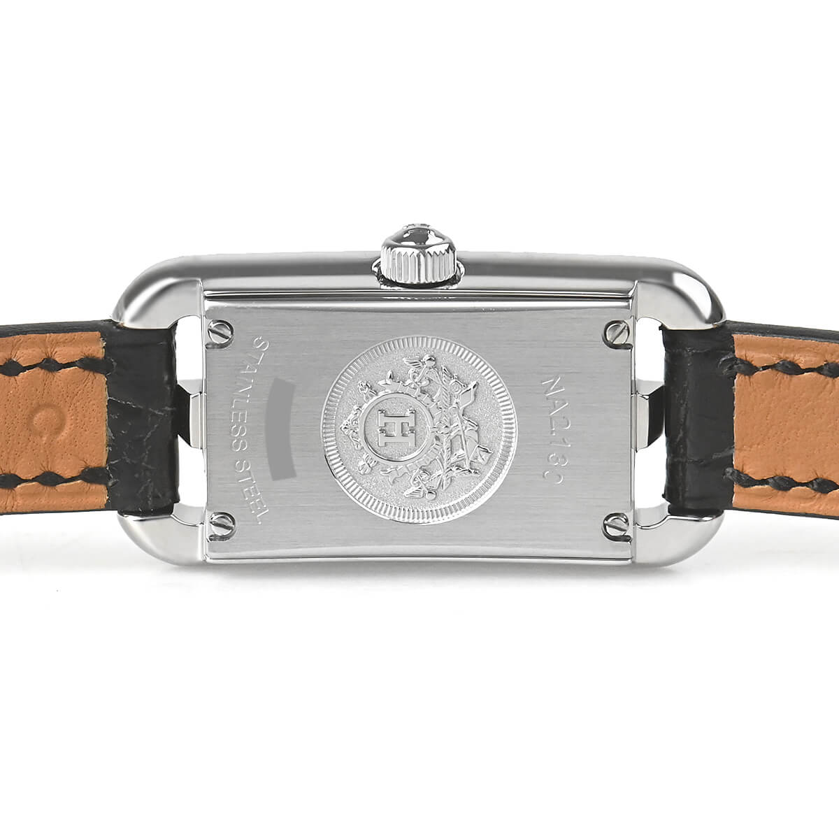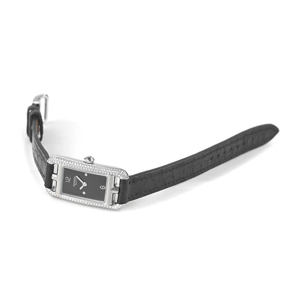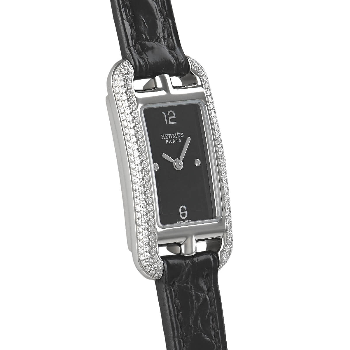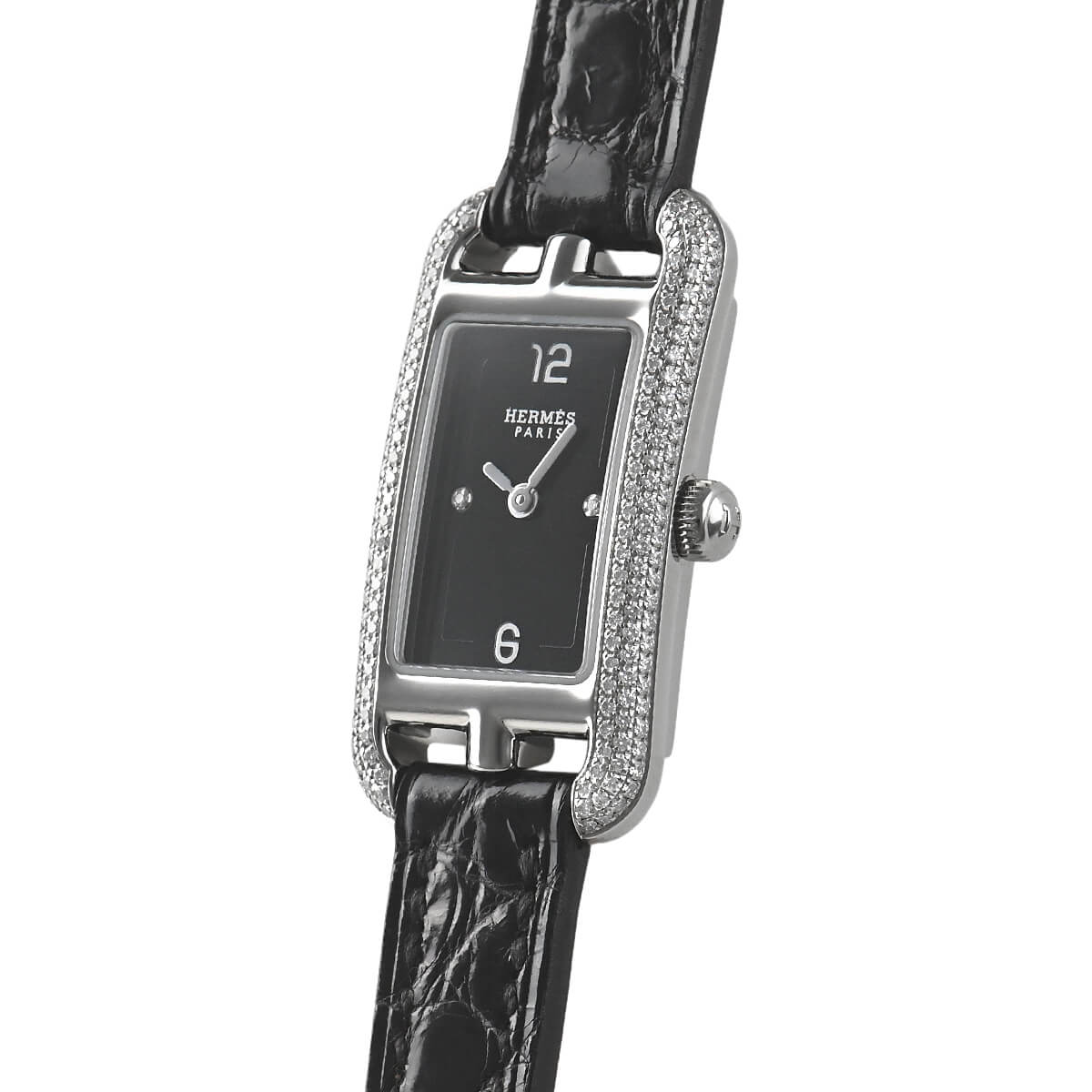 エルメスのアイコニックジュエリー「シェーヌ・ダンクル」をモチーフにレクタングルケースに進化させた「ナンタケット」。こちらはダイヤモンドが美しいステンレスモデルです。