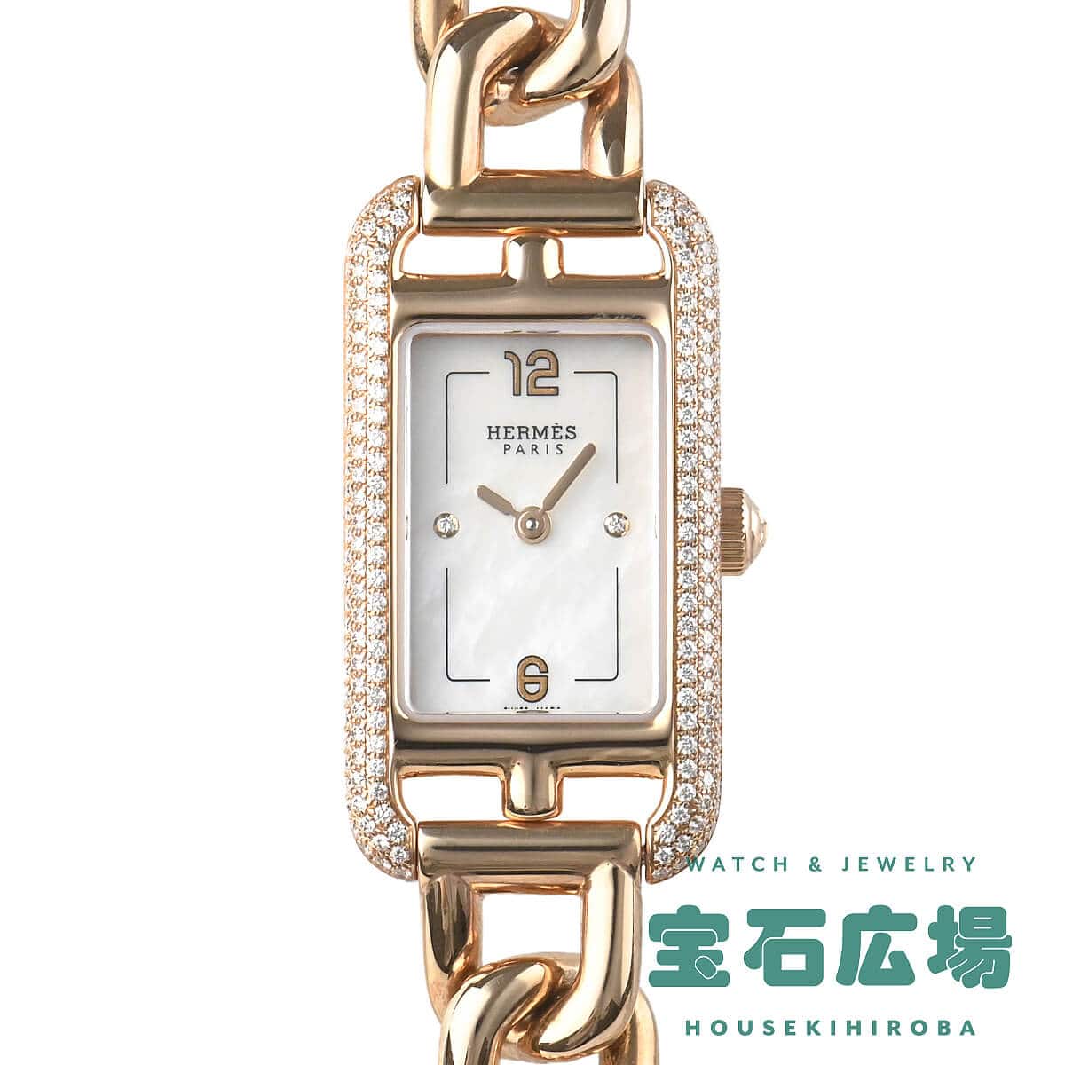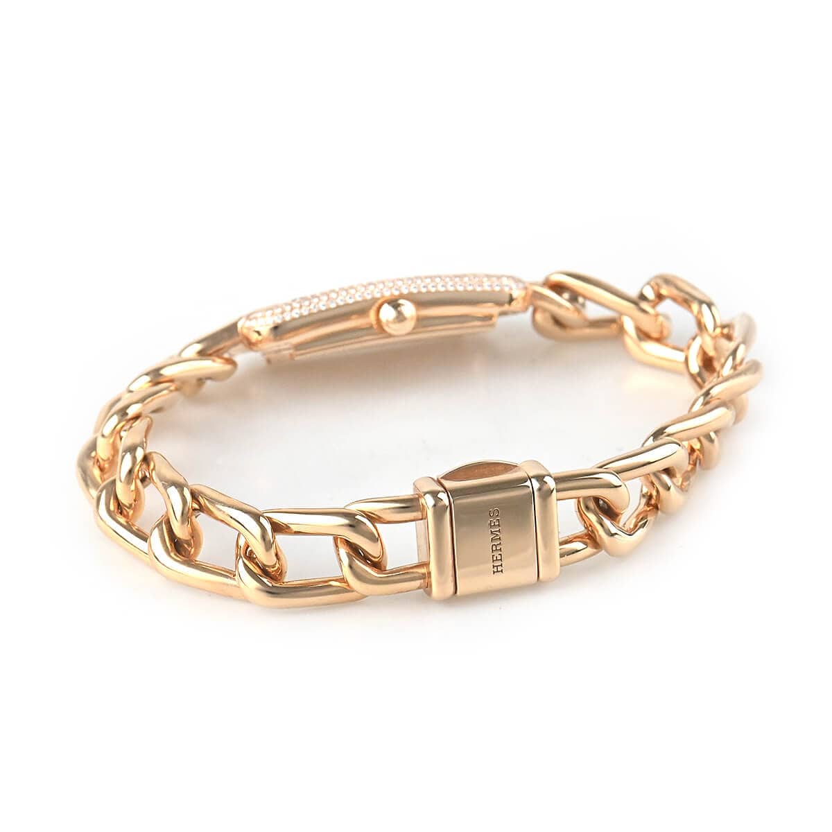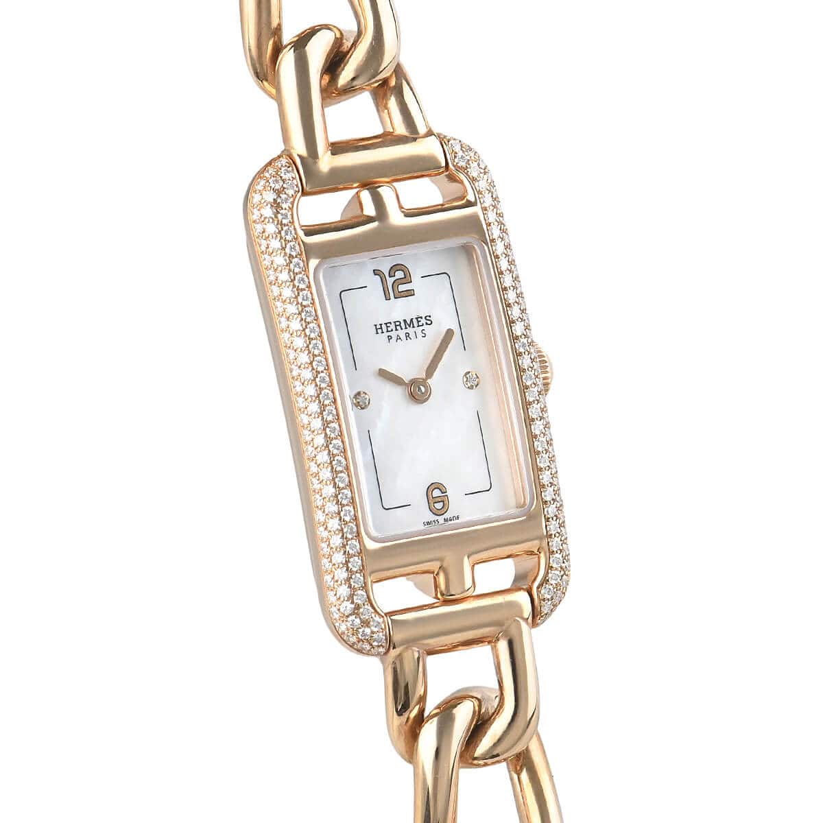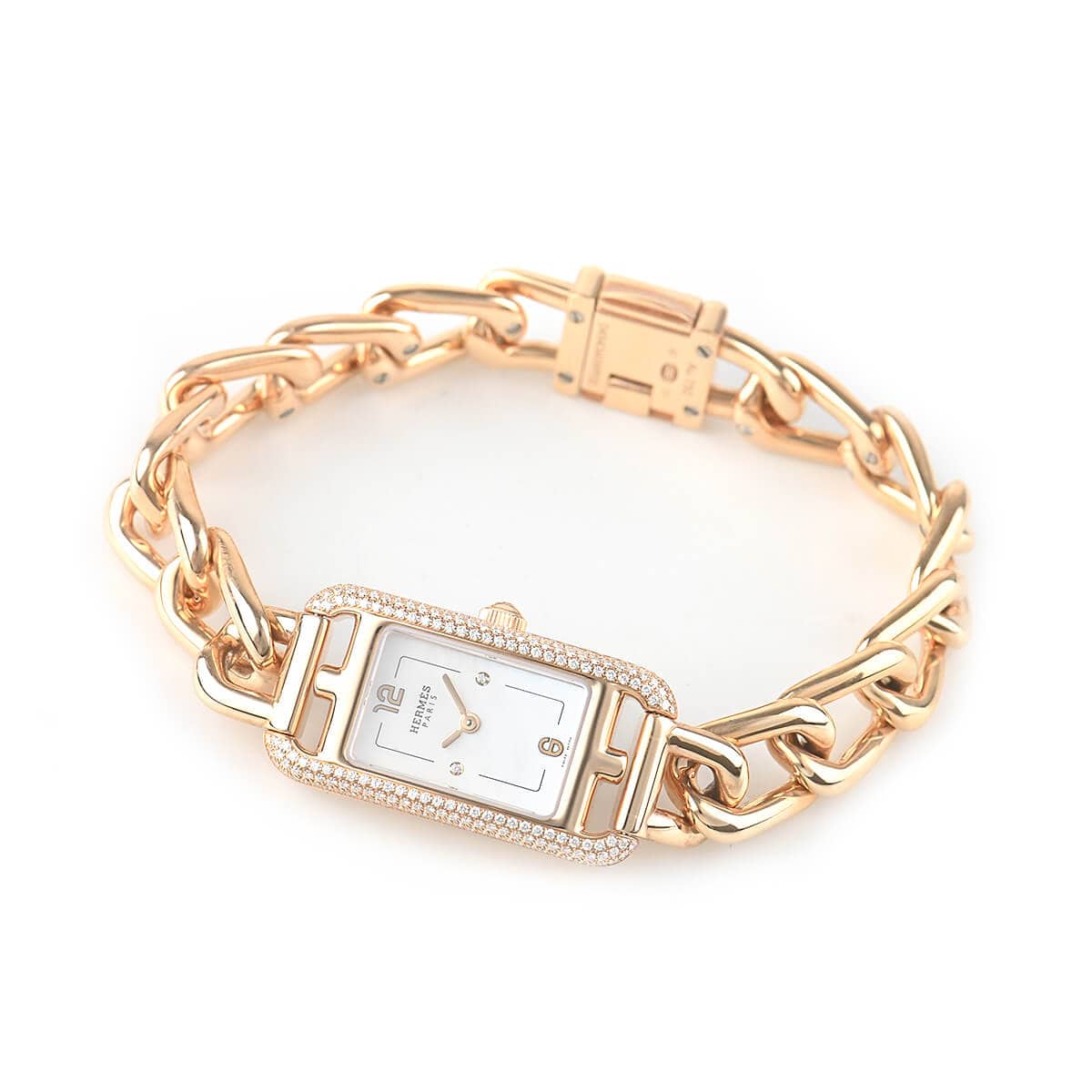 エルメスのアイコニックジュエリー「シェーヌ・ダンクル」をモチーフにレクタングルケースに進化させた「ナンタケット」。こちらはダイヤモンドが美しいピンクゴールドモデルです。