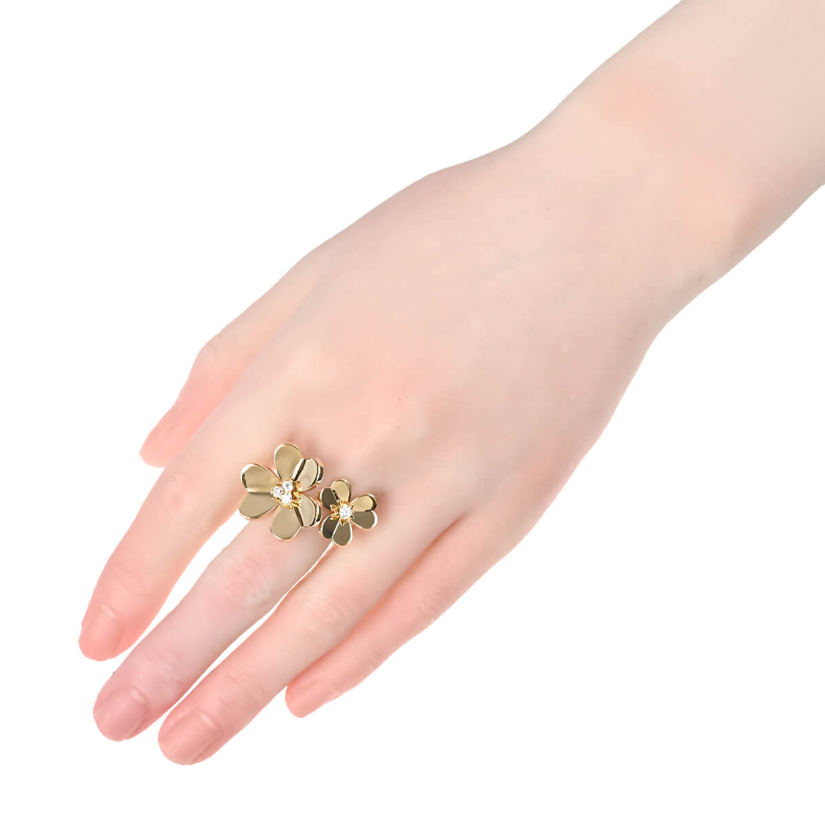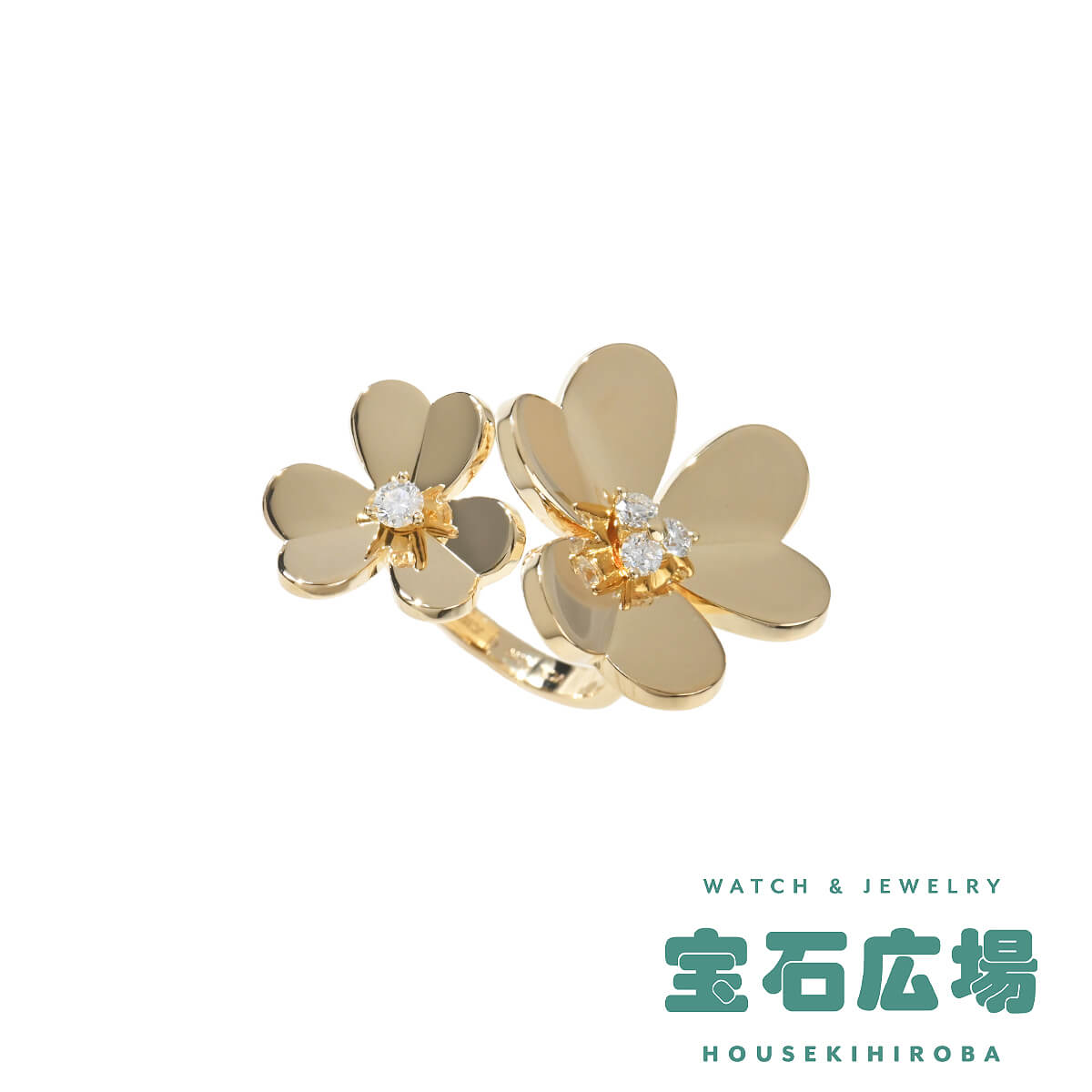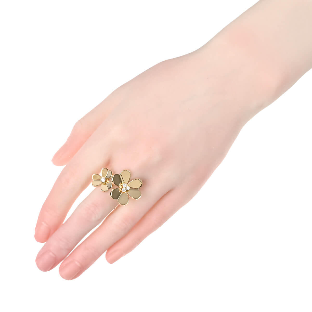 そよ風の中で花々が踊るように、グラフィカルに、軽やかに輝く『VanCleef&Arpels(ヴァンクリーフ&アーペル)』の「フリヴォル」コレクション。心安らぐ愛らしい自然の形を詩的に表現したグラフィカルなハート型の花びらが愛らしい、「フリヴォル」フラワーがふたつあしらわれた、イエローゴールド製アントレレドアリングです。つけると指と指の間にモチーフが出るアントレレドアリングは、個性的な指輪のつけ方を提案したヴァンクリーフの名作。フリヴォルフラワーの花びら一枚一枚をメゾンの研磨職人が特別な技法で丁寧に磨き上げ、真ん中にあしらわれたダイヤモンドの煌めきとあいまって、まるで鏡のようにまばゆく輝くお花を咲かせています。絶え間なく再生を繰り返す花々が、いつも新たな魅力を生み出す、ヴァンクリーフの“フローラ”コレクション。フェミニンでエレガントに咲き誇る、「フリヴォル」フラワーの存在感は格別です。