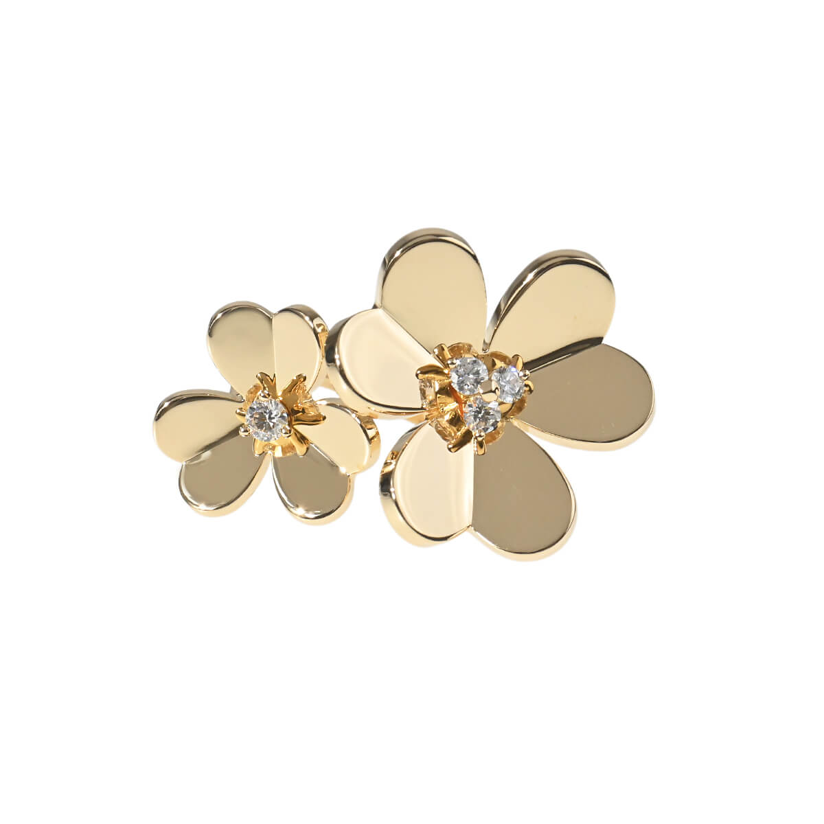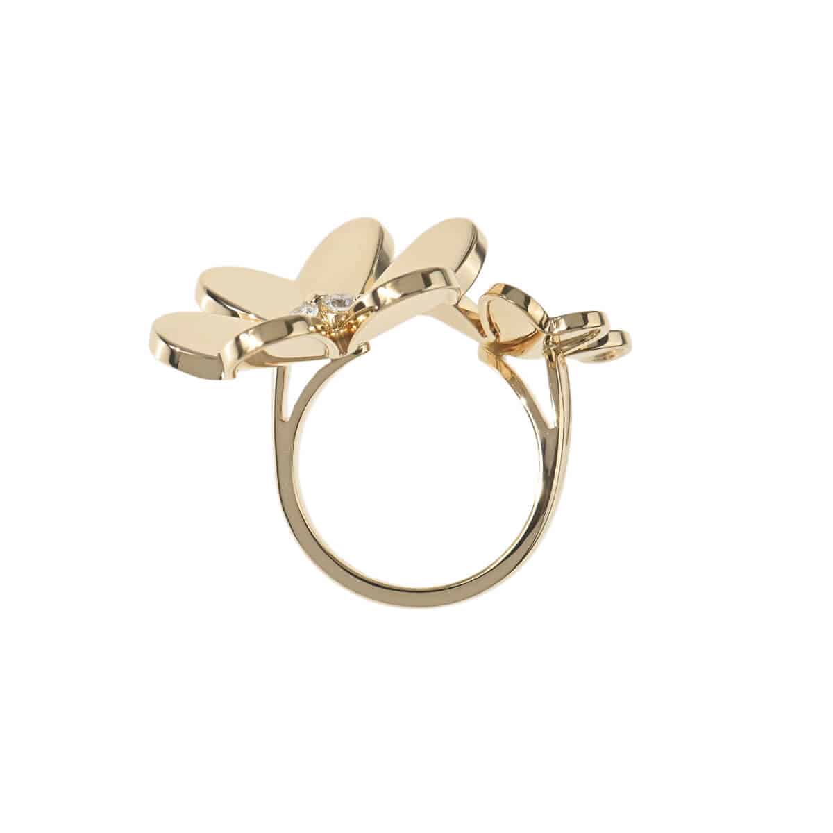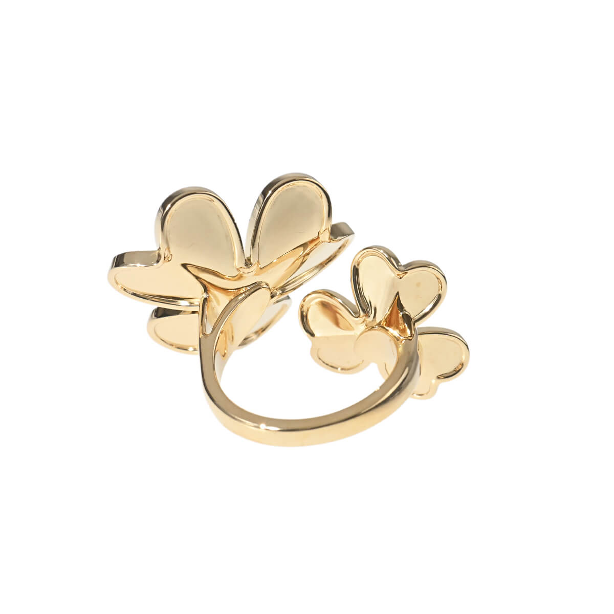 そよ風の中で花々が踊るように、グラフィカルに、軽やかに輝く『VanCleef&Arpels(ヴァンクリーフ&アーペル)』の「フリヴォル」コレクション。心安らぐ愛らしい自然の形を詩的に表現したグラフィカルなハート型の花びらが愛らしい、「フリヴォル」フラワーがふたつあしらわれた、イエローゴールド製アントレレドアリングです。つけると指と指の間にモチーフが出るアントレレドアリングは、個性的な指輪のつけ方を提案したヴァンクリーフの名作。フリヴォルフラワーの花びら一枚一枚をメゾンの研磨職人が特別な技法で丁寧に磨き上げ、真ん中にあしらわれたダイヤモンドの煌めきとあいまって、まるで鏡のようにまばゆく輝くお花を咲かせています。絶え間なく再生を繰り返す花々が、いつも新たな魅力を生み出す、ヴァンクリーフの“フローラ”コレクション。フェミニンでエレガントに咲き誇る、「フリヴォル」フラワーの存在感は格別です。