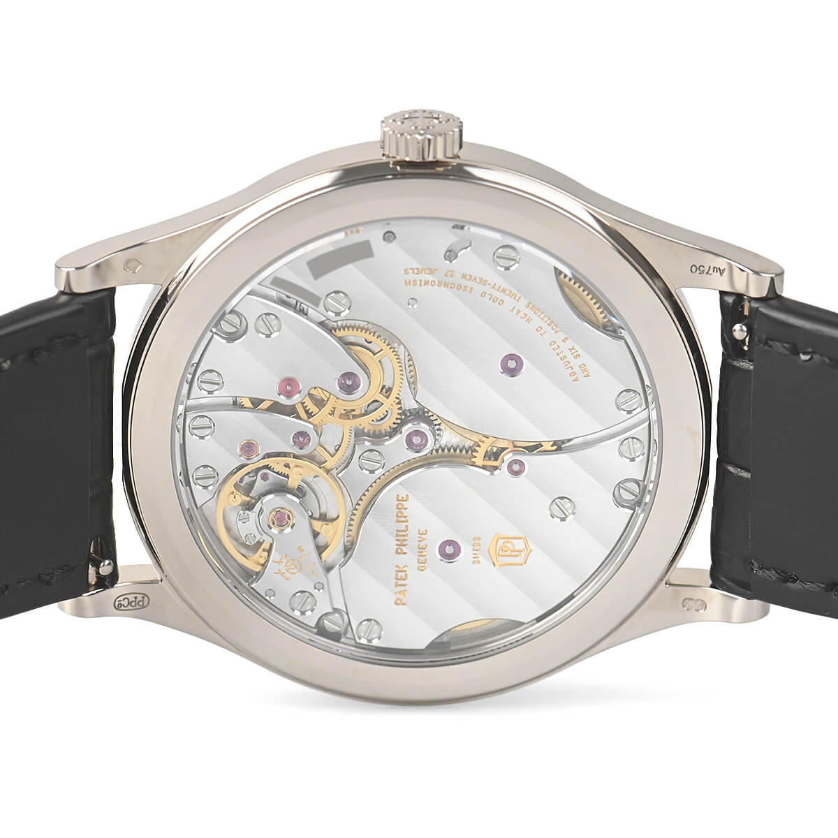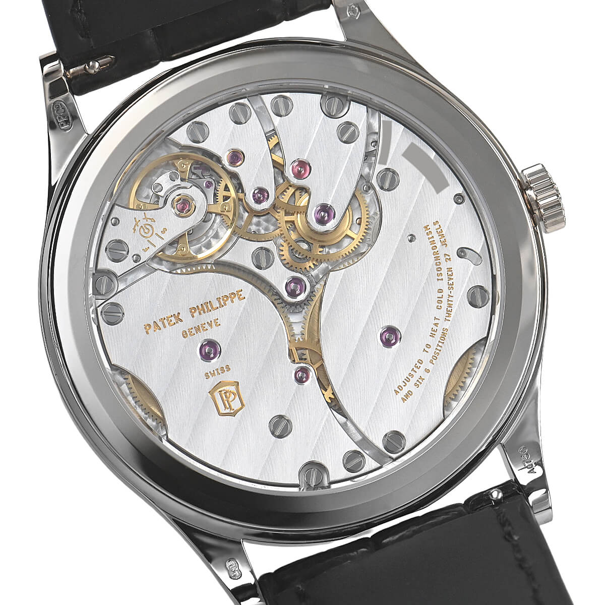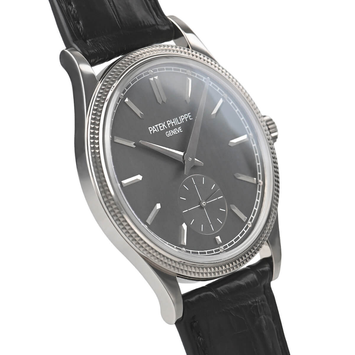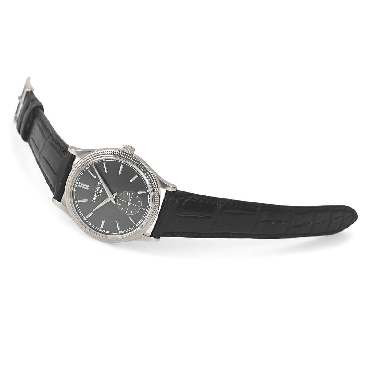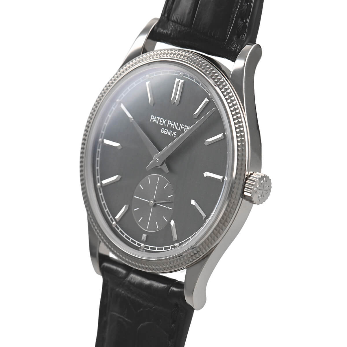 サテン仕上げが施されたチャコールグレーダイヤルが美しい「6119G−001」。クルー・ド・パリ・ベゼルのホブネイルパターンの繊細さはパテックならではです。