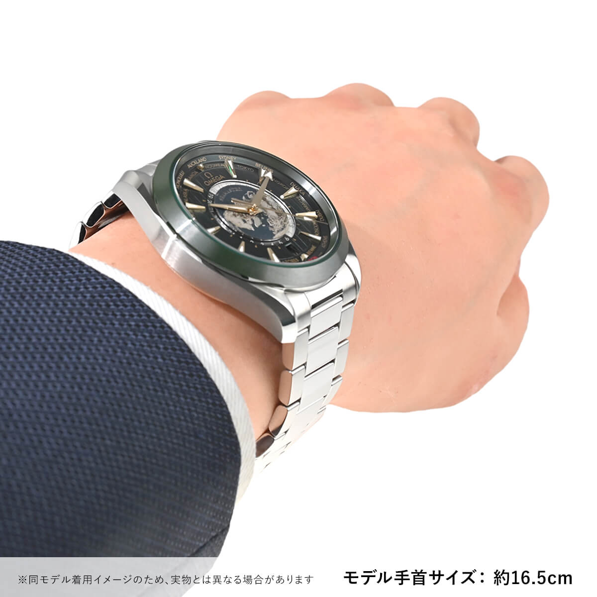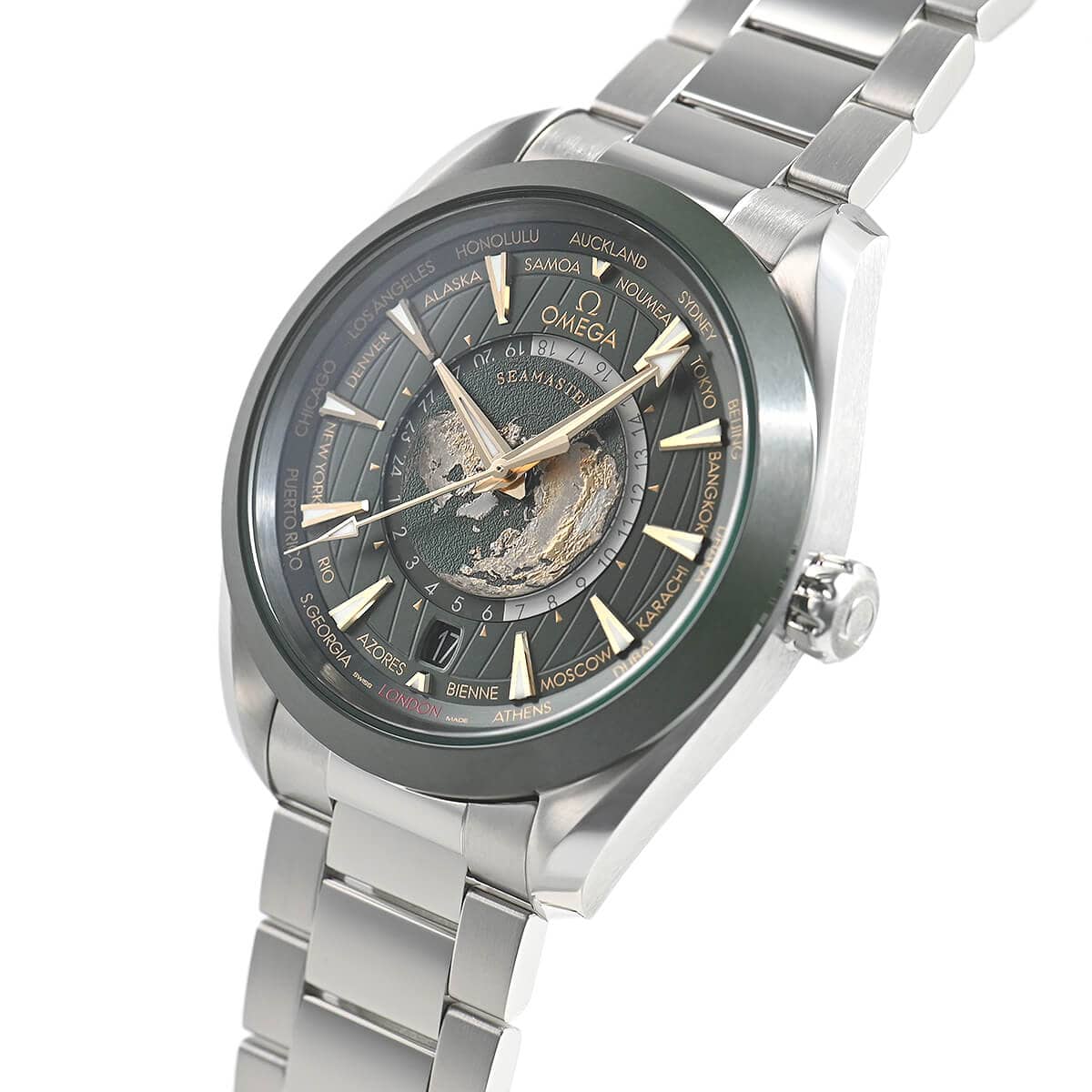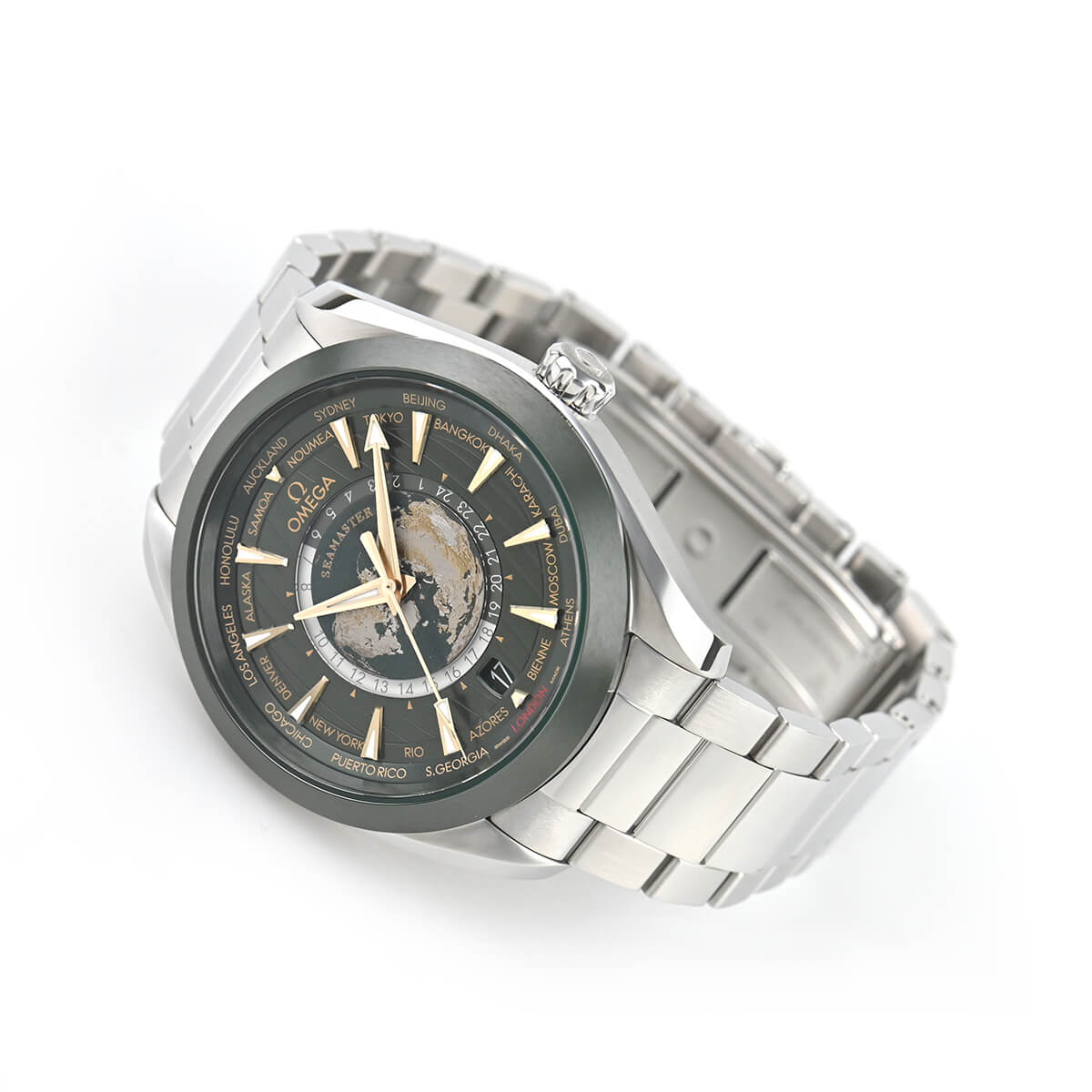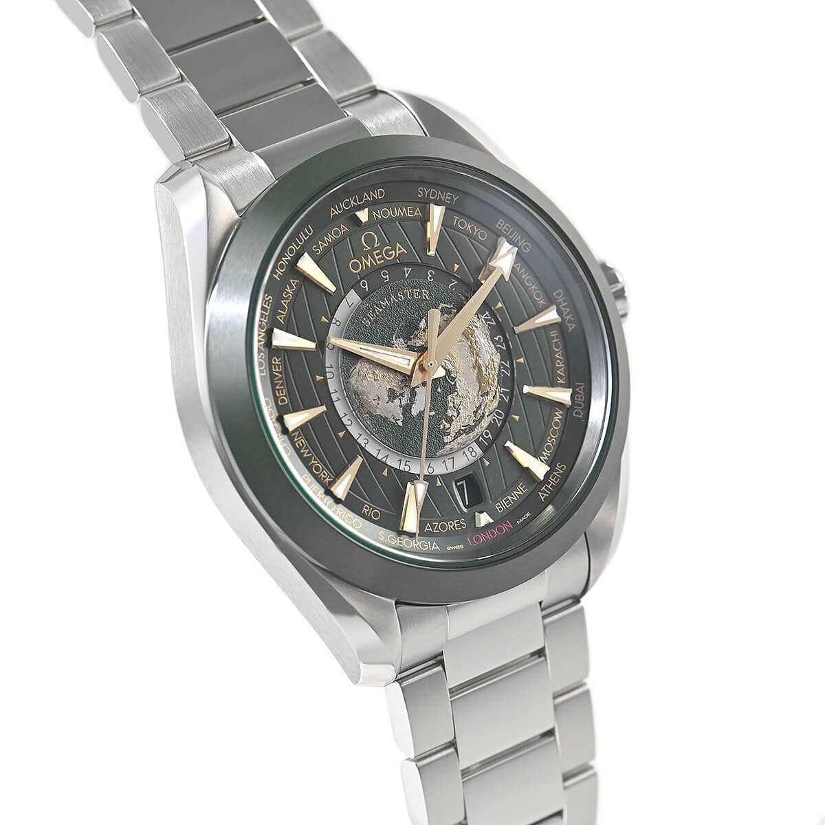 2020年発表の【シーマスターアクアテラGMT ワールドタイマー】に新たに2色の新しいモデルが2023年追加されました。今回ご紹介するのは、全体をグリーン色で美しく落ち着いた雰囲気でまとめ、ムーンシャインゴールドを採用することによりゴージャスな印象の【220.30.43.22.10.001】。