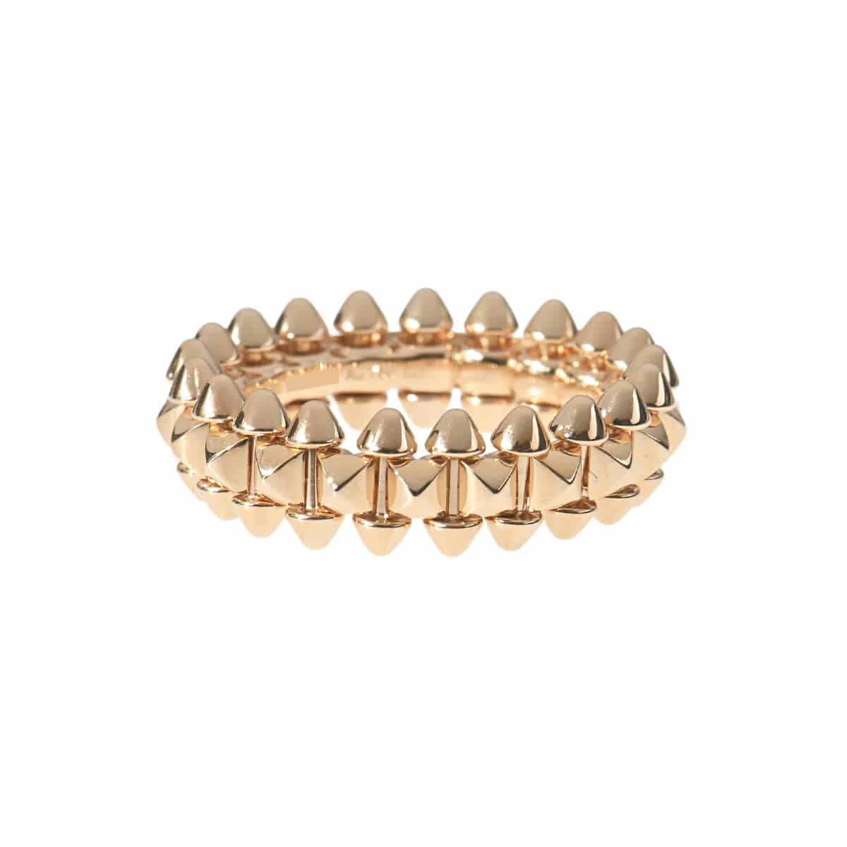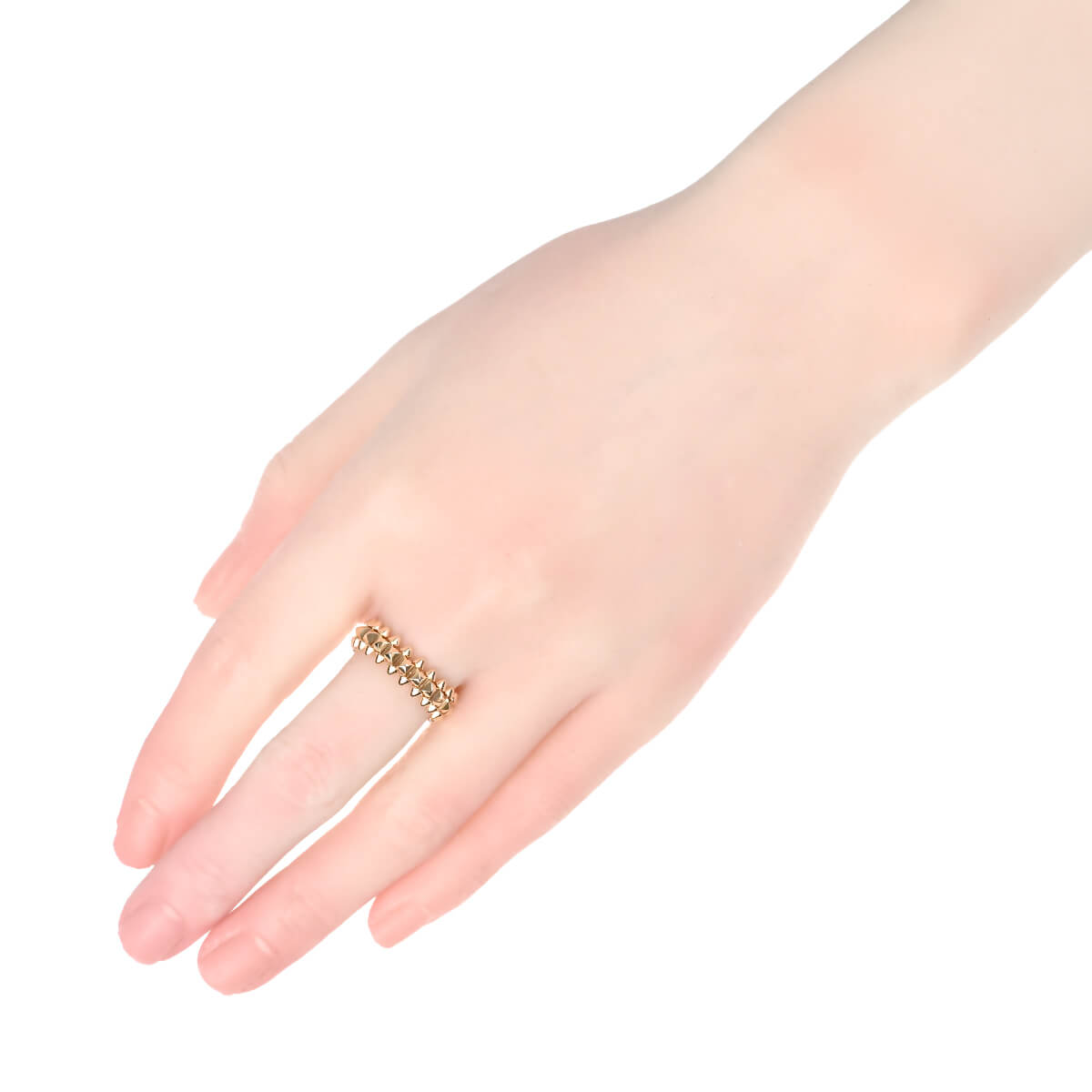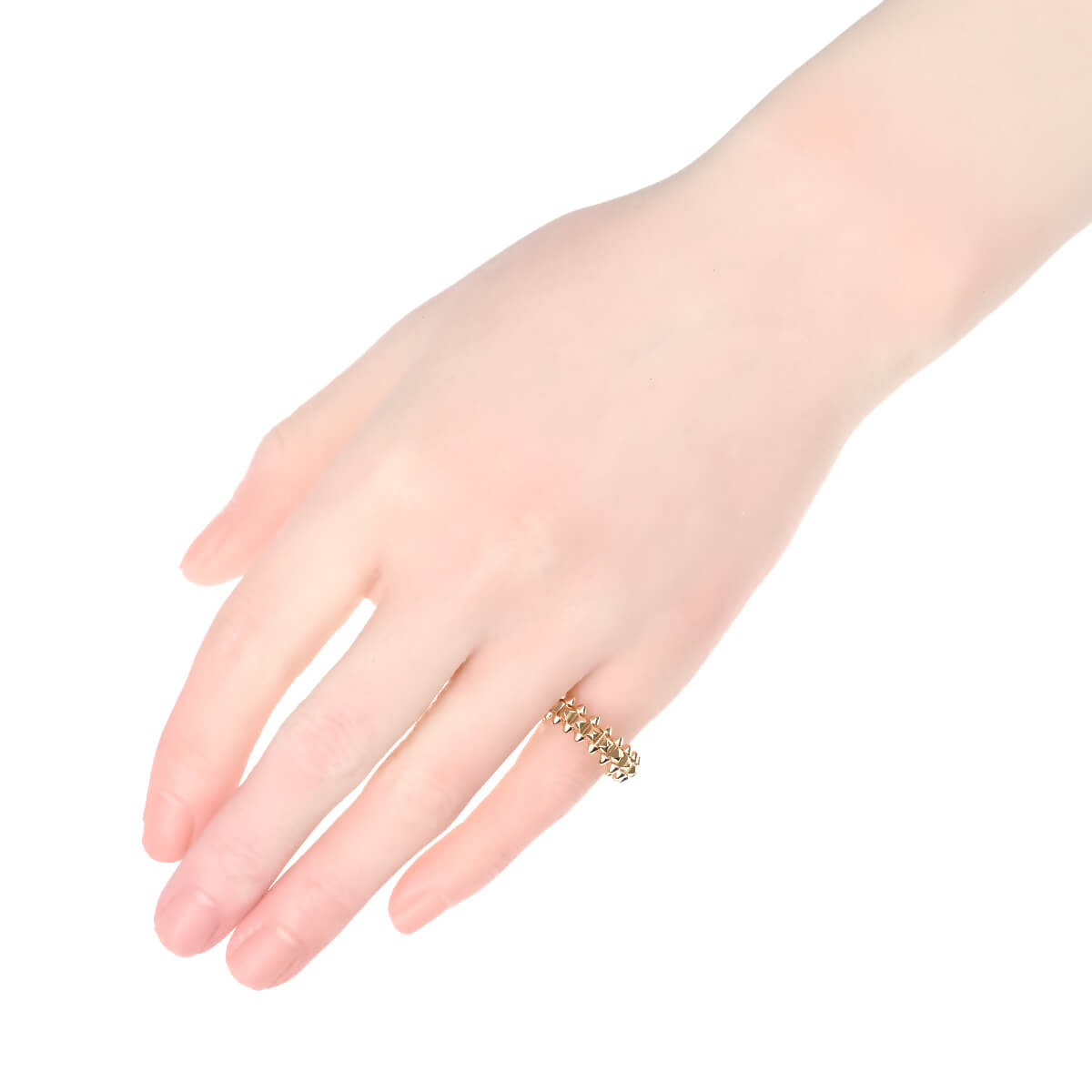 クラシックなフォルムとそこからの解放、削ぎ落されたラインと有り余るエネルギー、真面目さとちょっと羽目を外す感覚、そんな相反するものを同時に主張する「クラッシュ ドゥ カルティエ」コレクション。ジオメトリック、スタッズ、クル カレ、そしてクリエイティブな遊び心、そんな『Cartier(カルティエ)』の象徴的で伝統的なデザインコードをモダンに解釈し独創的に組み合わせた、斬新でシックなこのコレクションは未来に引き継がれるアイコンです。フランス語で“スクエア(正方形)”を意味する「カレ」から生まれたカルティエの象徴的なコードのひとつ「クル カレ」がライン中央に並び、その両サイドにあしらわれた「ピコ」と呼ばれる円錐状のスタッズと幾何学的なデザインコントラストを描く、ピンクゴールド製リング。ジオメトリックでありながらどこかフェミニン、ミニマルなデザインでありながら複雑な構造を持つ、相反するふたつの魅力を同時に主張するそのフォルムが美しく、カルティエらしい洗練を纏ったリングです。