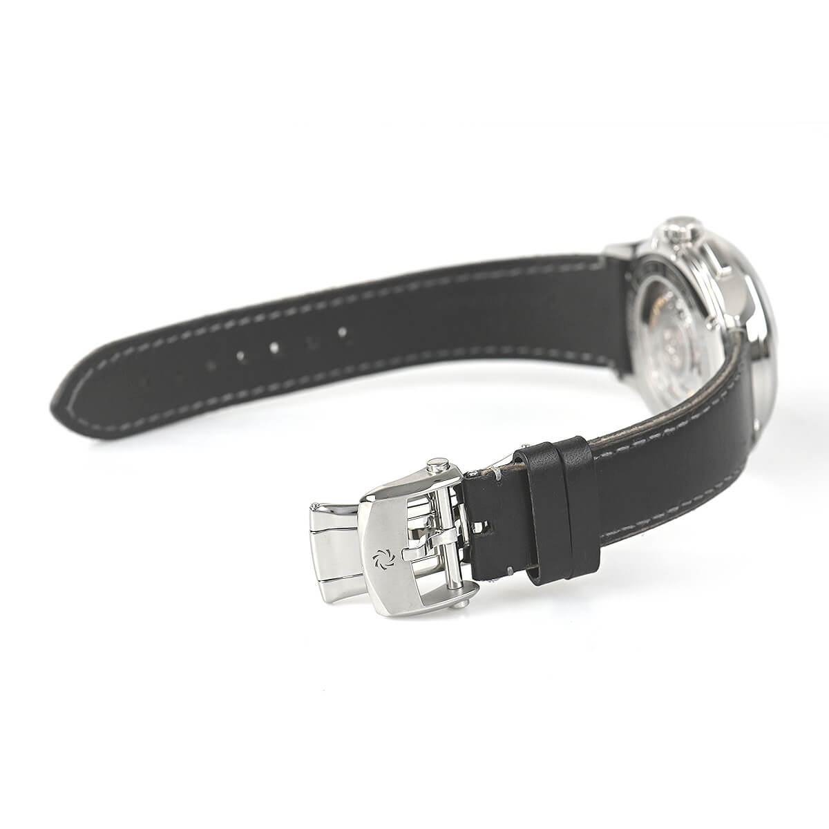 クラシカルなデザインのケースには、アニュアルカレンダー付のクロノムーブメントが収められています。