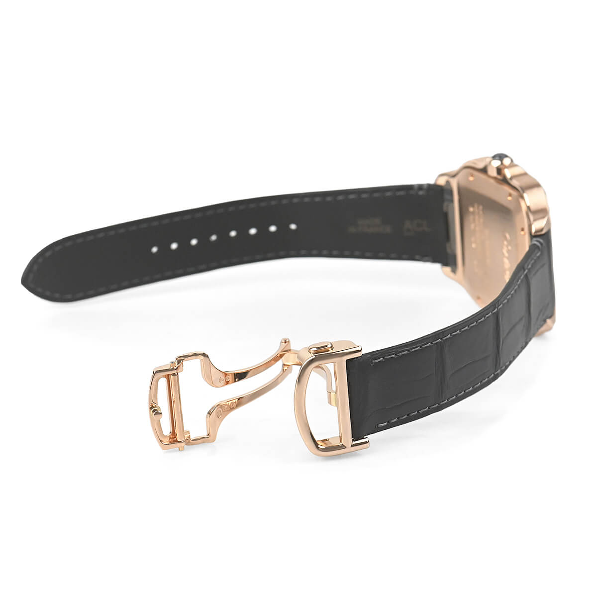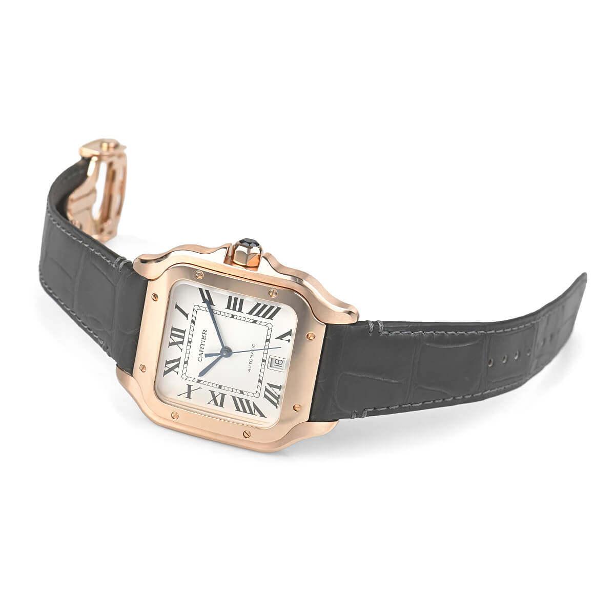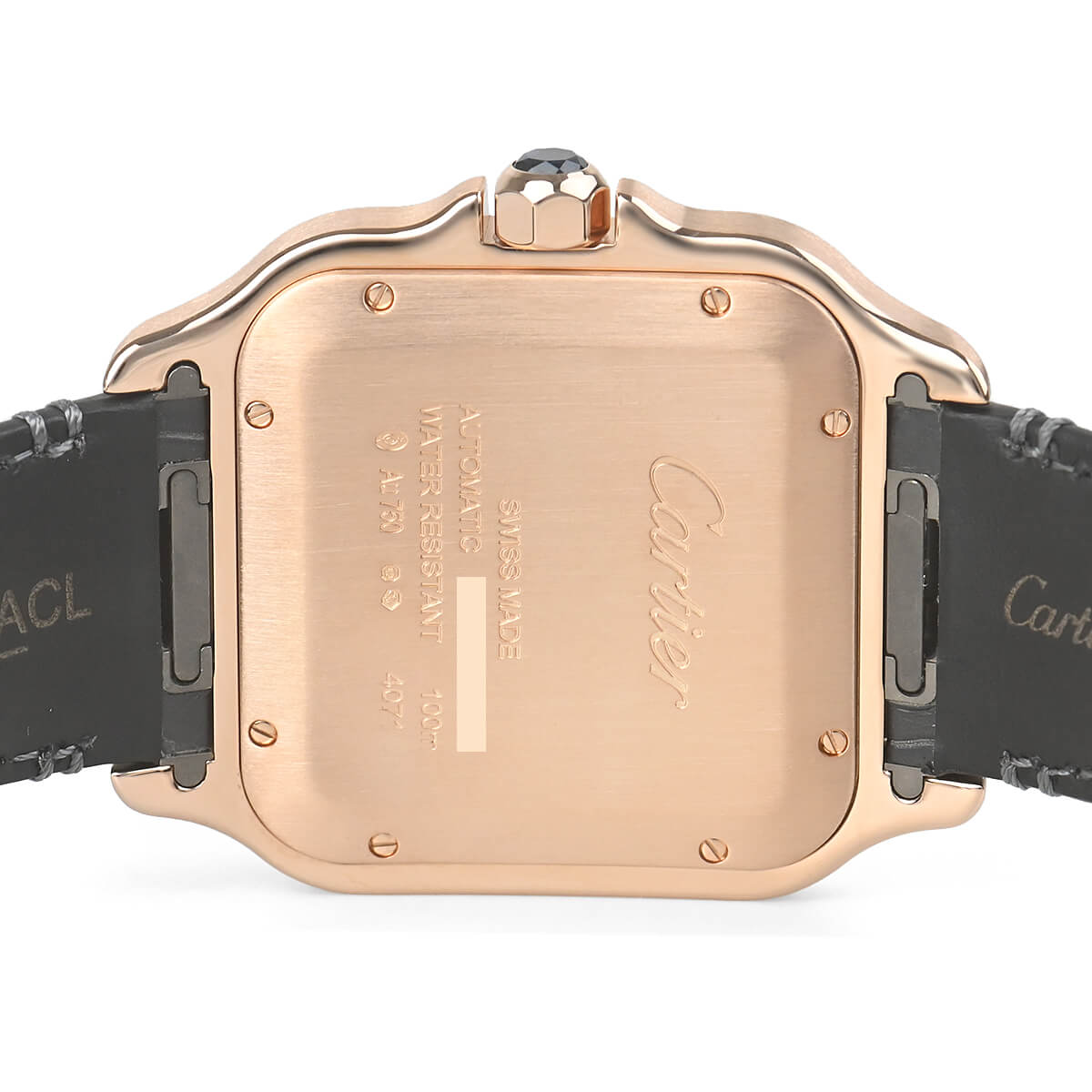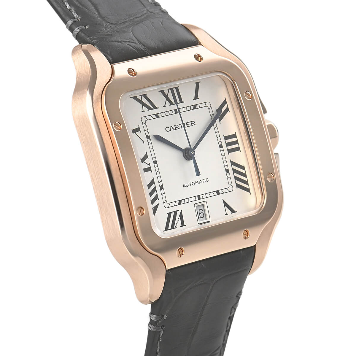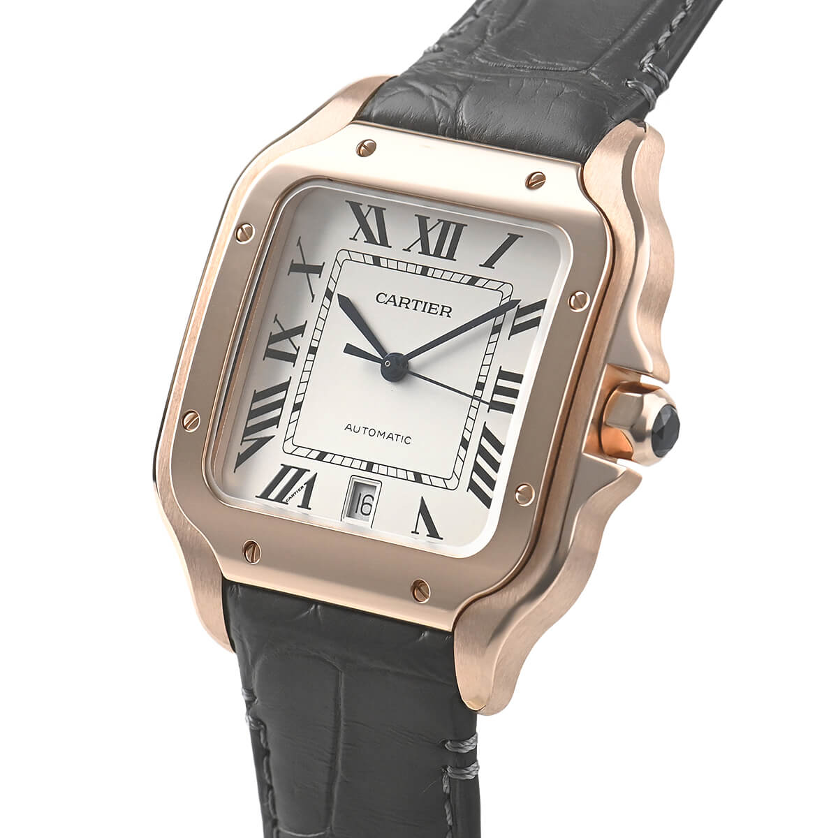 文字盤のローマインデックスとその内側に描かれた四角のレイルウェイ分目盛はカルティエウォッチを特徴づけ、さらにベゼル部分にはサントスウォッチ特有のビス・モチーフが施されます。