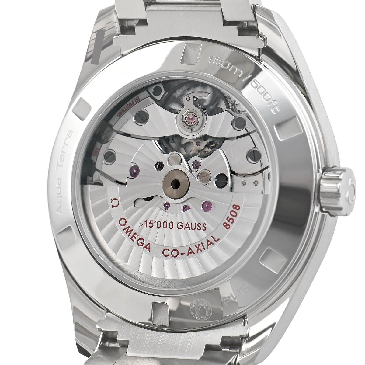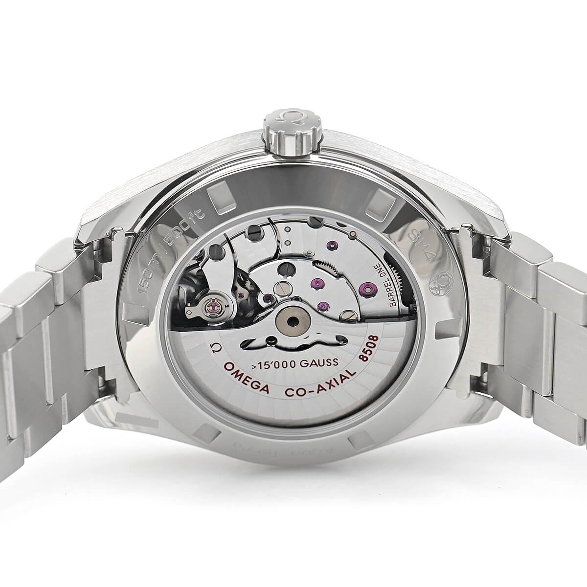 耐磁時計でありながらシースルーバックを採用した「シーマスター アクアテラ 15000ガウス」。ほとんどの耐磁時計は、ムーブメントを軟鉄製インナーケースで囲んで耐磁性を得ていますが、この時計は物理的に磁力を帯びる可能性がある鉄製のパーツを排除。