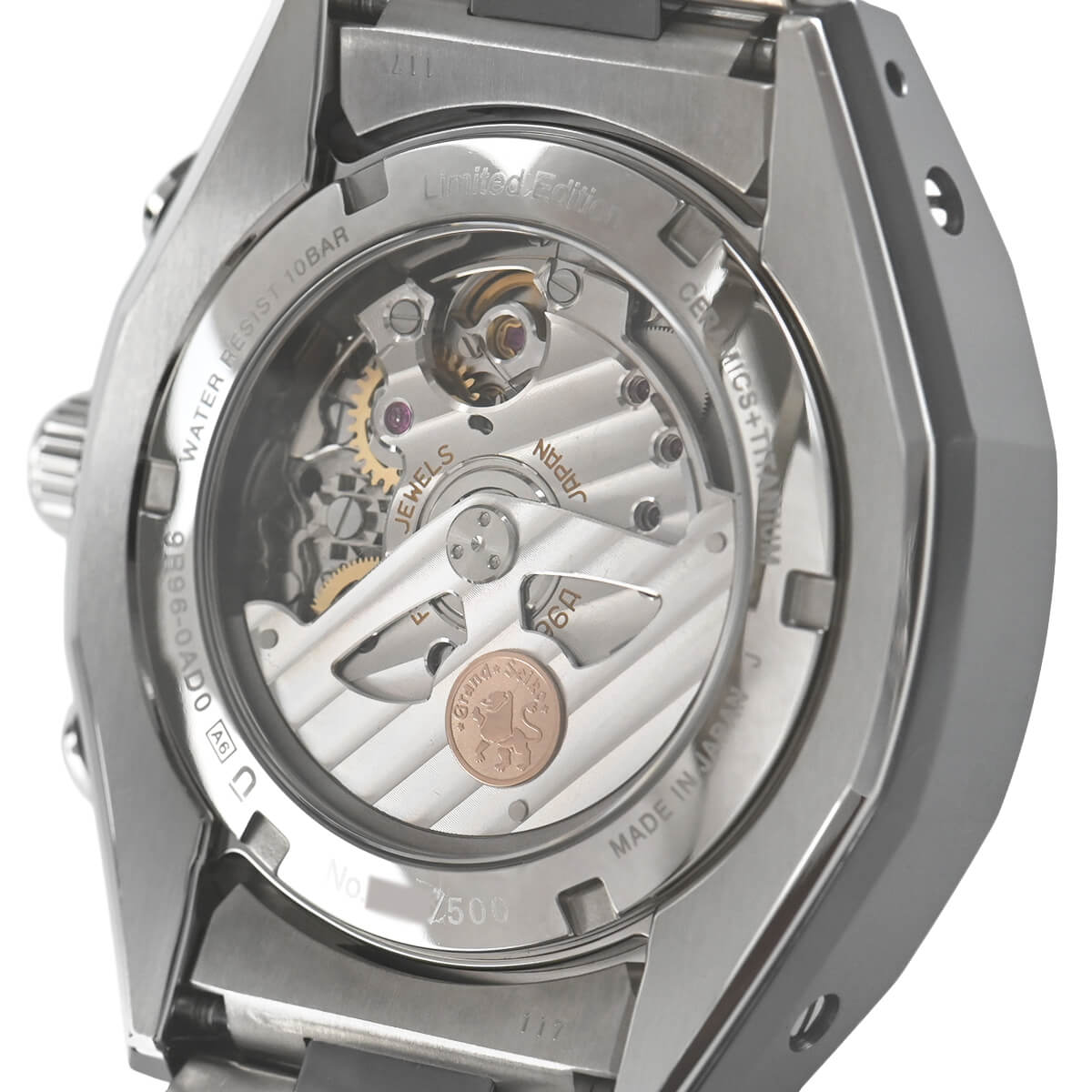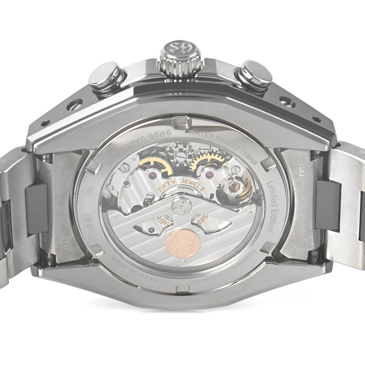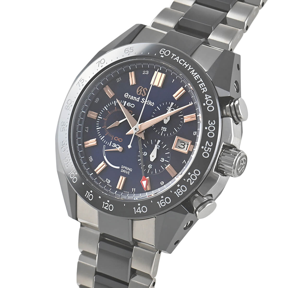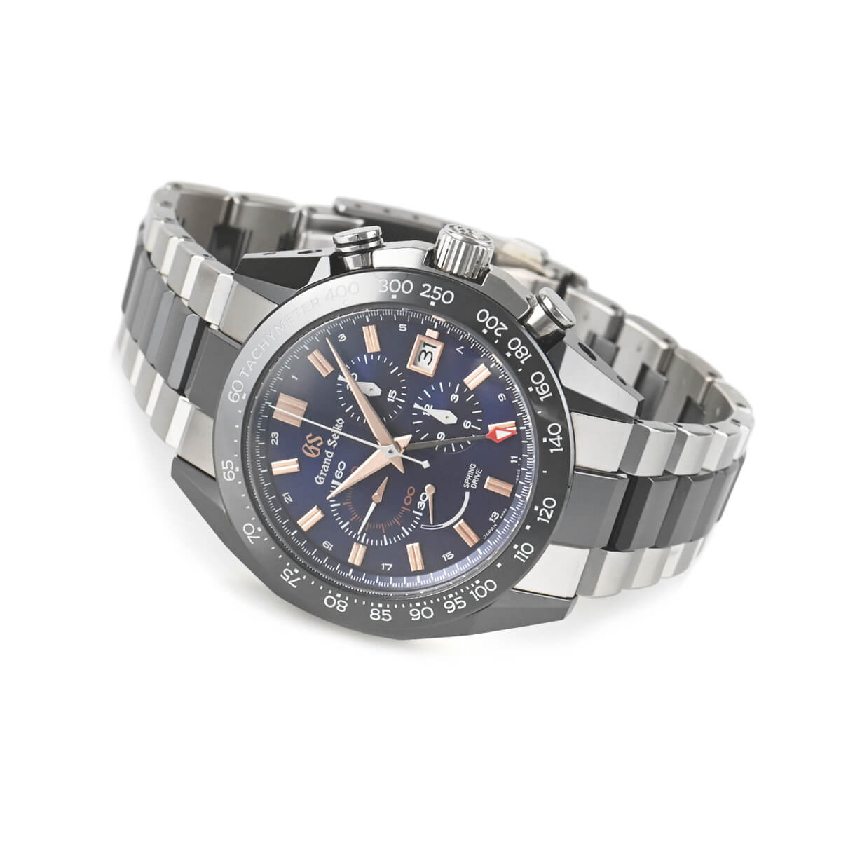 限定モデルのみに採用される深いブルーが印象的な「SBGC219」。こちらは2007年に誕生したスプリングドライブクロノグラフ GMT「キャリバー9R96」の10周年記念モデルです。