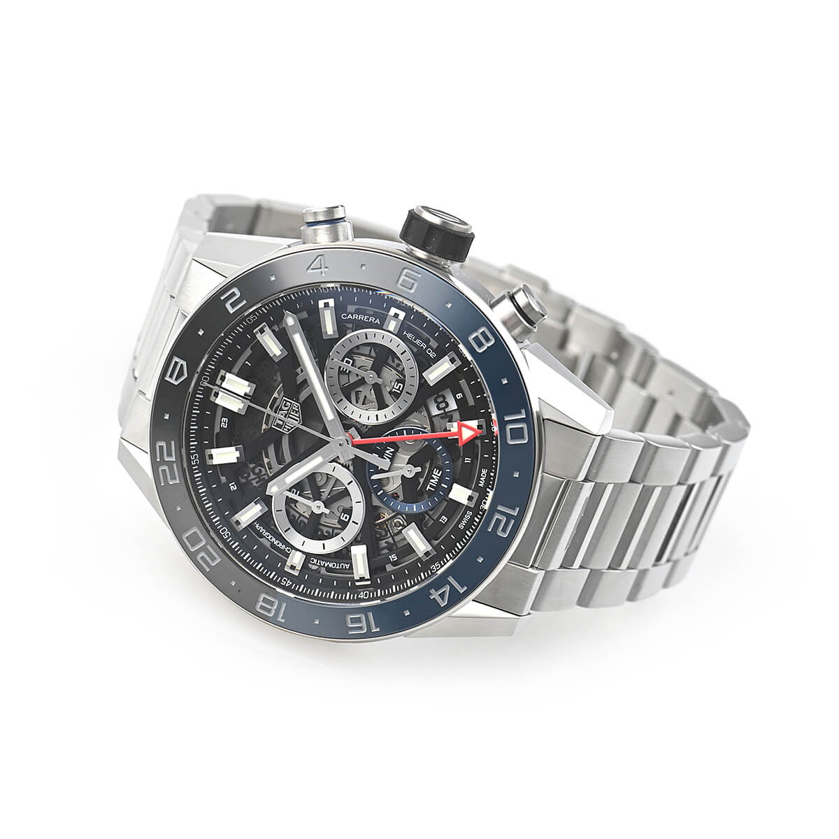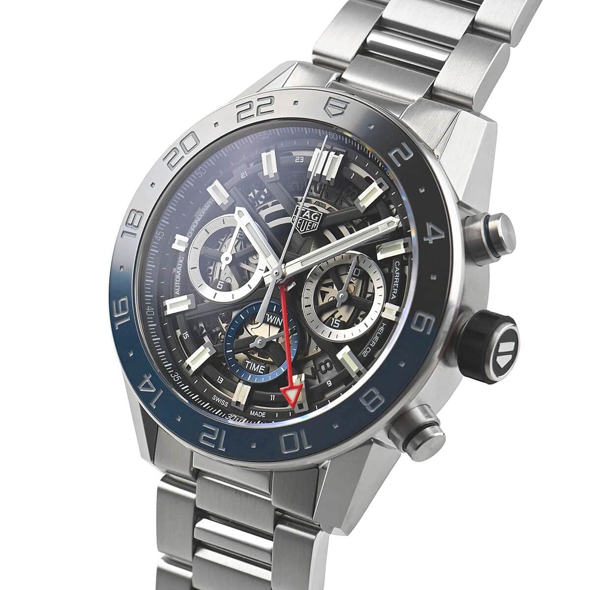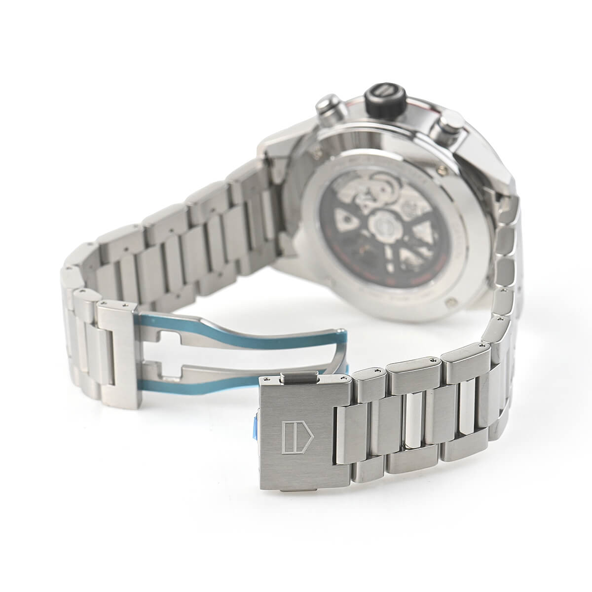 文字盤をスケルトン仕様にしたことでスポーティーでメカニカルな印象となり、シースルーバックから覗くムーブメントにはブラックコーティングが施されたローターが特徴の自社製キャリバー「ホイヤー02」を搭載します。