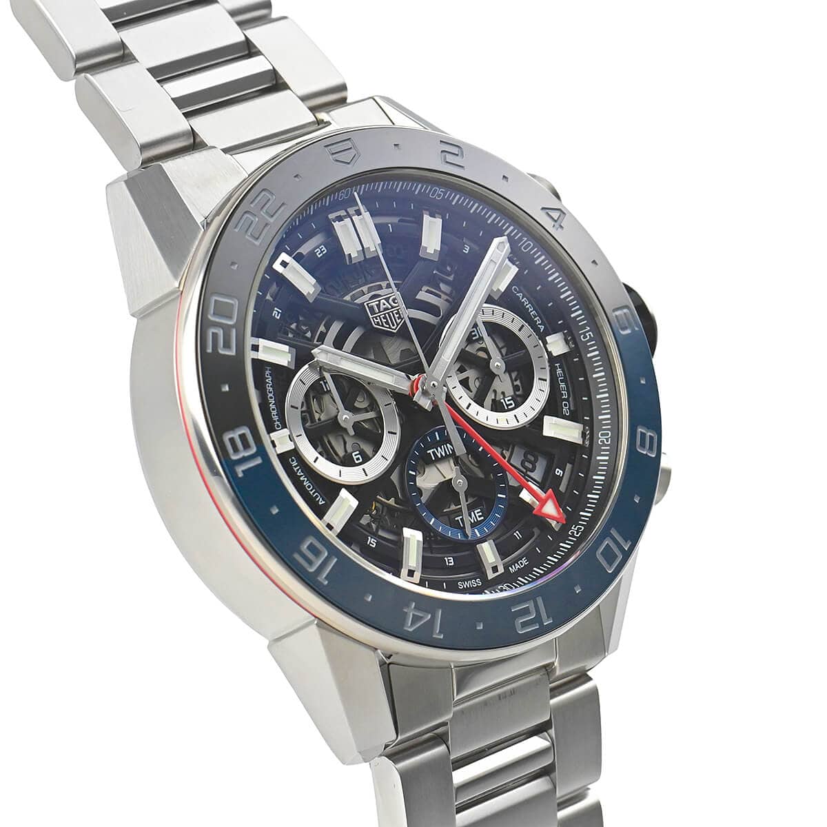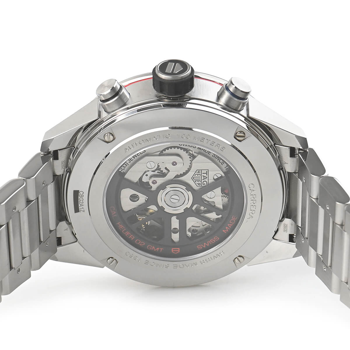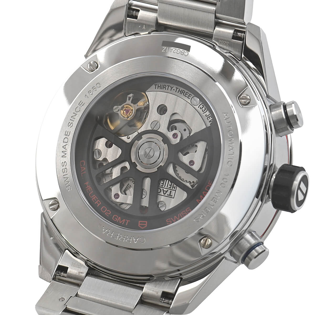 文字盤をスケルトン仕様にしたことでスポーティーでメカニカルな印象となり、シースルーバックから覗くムーブメントにはブラックコーティングが施されたローターが特徴の自社製キャリバー「ホイヤー02」を搭載します。