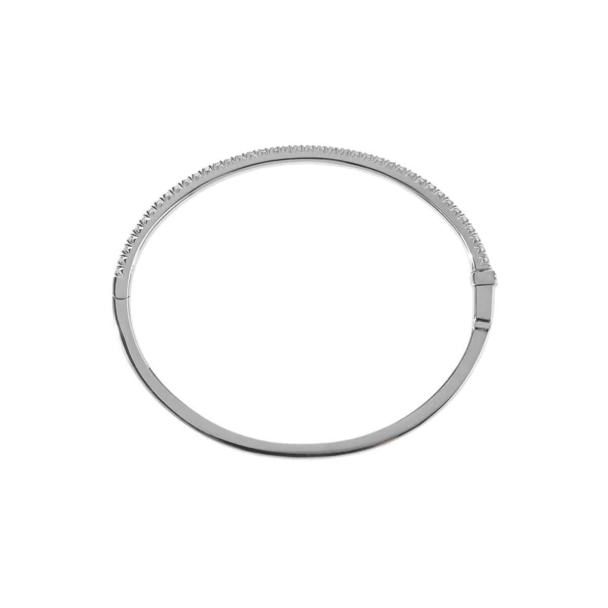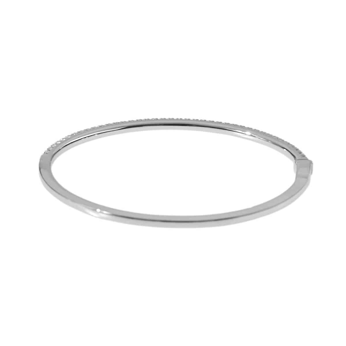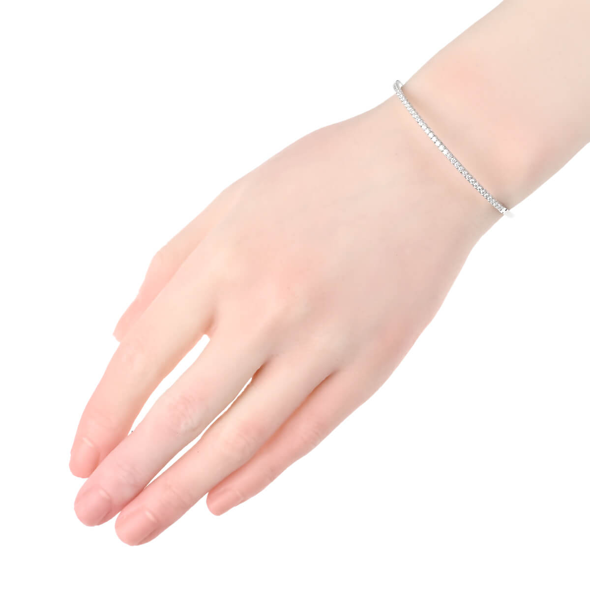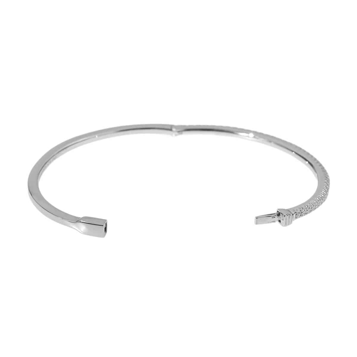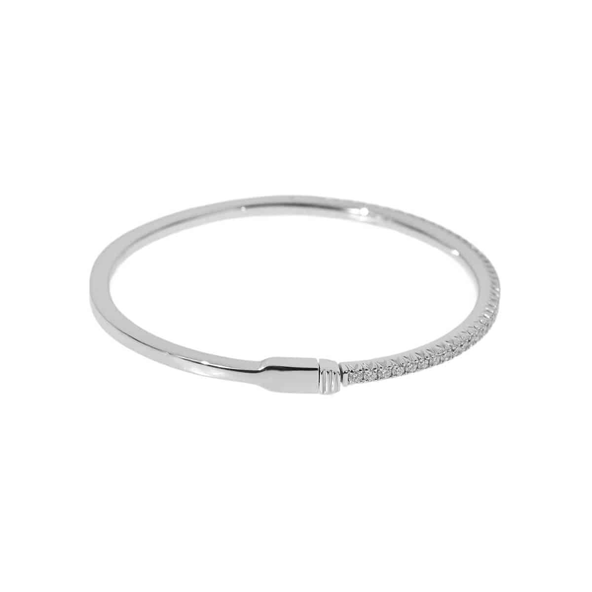 無駄のない、ミニマルでモダンなデザインをもつ、『TIFFANY&Co.(ティファニー)』「メトロ」は、ダイヤモンドの細やかなマイクロパヴェセッティングが何とも美しいジュエリーコレクション。ティファニーダイヤモンドのきらめきをまとった、軽やかでエレガントな魅力あふれるホワイトゴールド製バングルです。シンプルであるからこそ引き立つ洗練された美しさをもつダイヤモンドバングルは、重ねづけでもすんなりなじみ、1本でもエレガント。指先で光を放つダイヤモンドラインが日常にさりげなくも本物の煌めきを添えてくれる、このうえなく繊細で美しいダイヤモンドジュエリーです。