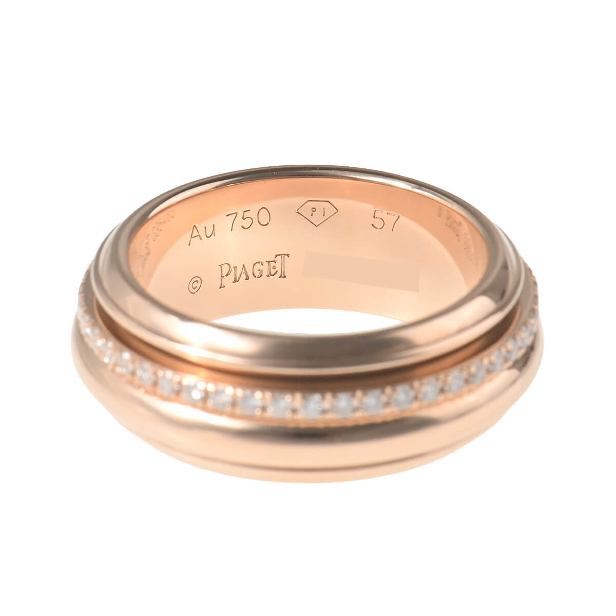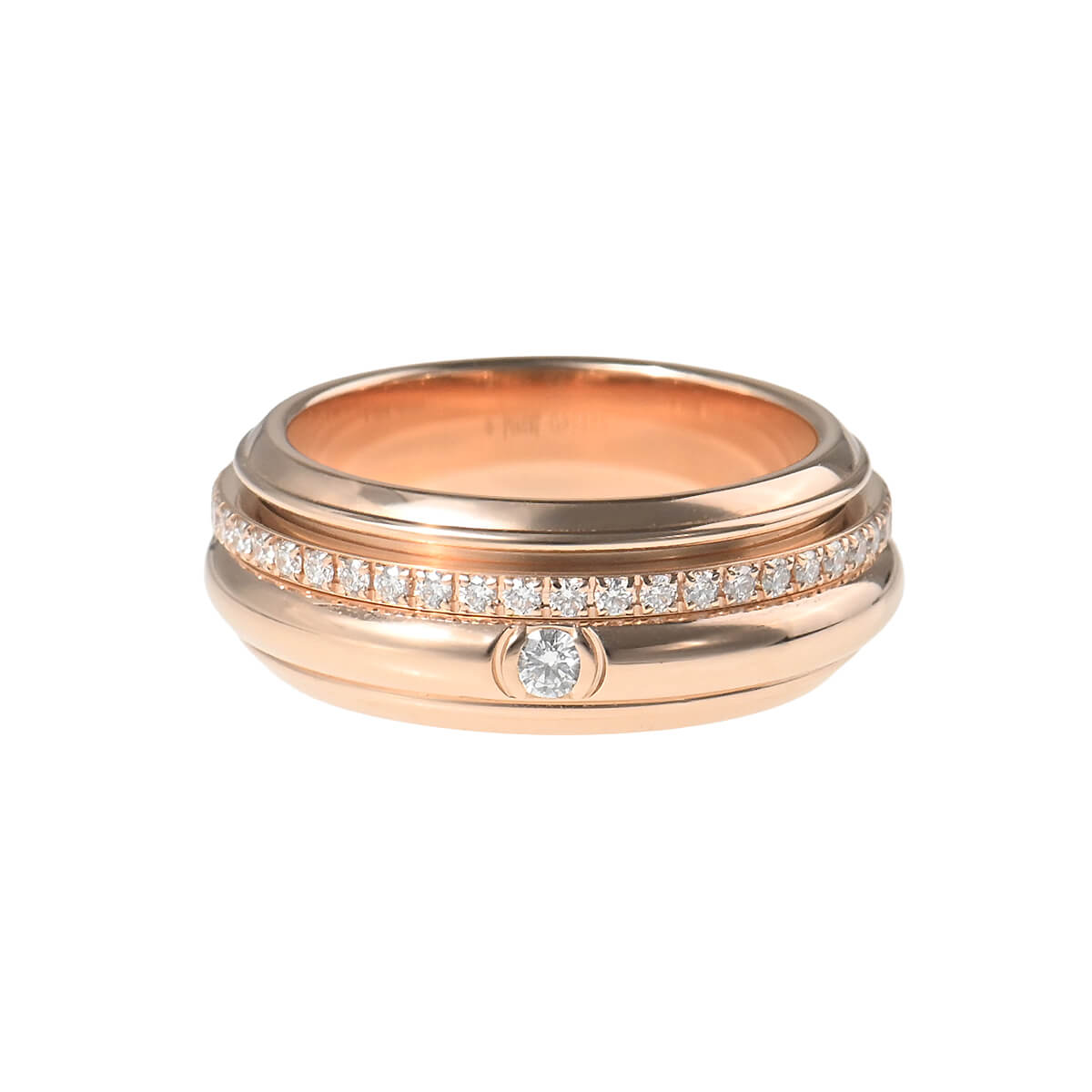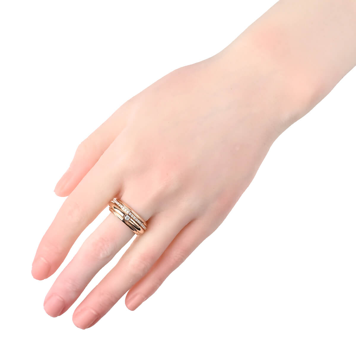 フランス語で“所有”を意味する「POSSESSION(ポセション)」は、愛する人を所有し、そして所有されるという情熱的な思いが込められた『PIAGET(ピアジェ)』の代表的コレクション。2つの輪が重なり合った個性的なデザインが特徴のこのコレクションは、自由に廻るけれども決して離れることなく永遠に結ばれているという、新しい愛の形を表現しています。ダイヤモンドがぐるりと1周連なるリングとひと粒のダイヤモンドがきらめくリング、2本のリングがボリュームたっぷりの幅広リングの外側で廻る、ピンクゴールド製「ポセション」リング。身につける人が指で軽く回すたび、まるで自分の世界を動かしているような感覚を楽しめる この“動き”は、“自由・変化・ポジティブなエネルギー”を象徴しているそう。どんなスタイリングにもしっくりなじむ洗練されたミニマルなシルエットが美しい、さりげない個性と品格も感じられるアイコニックなハイジュエリーです。