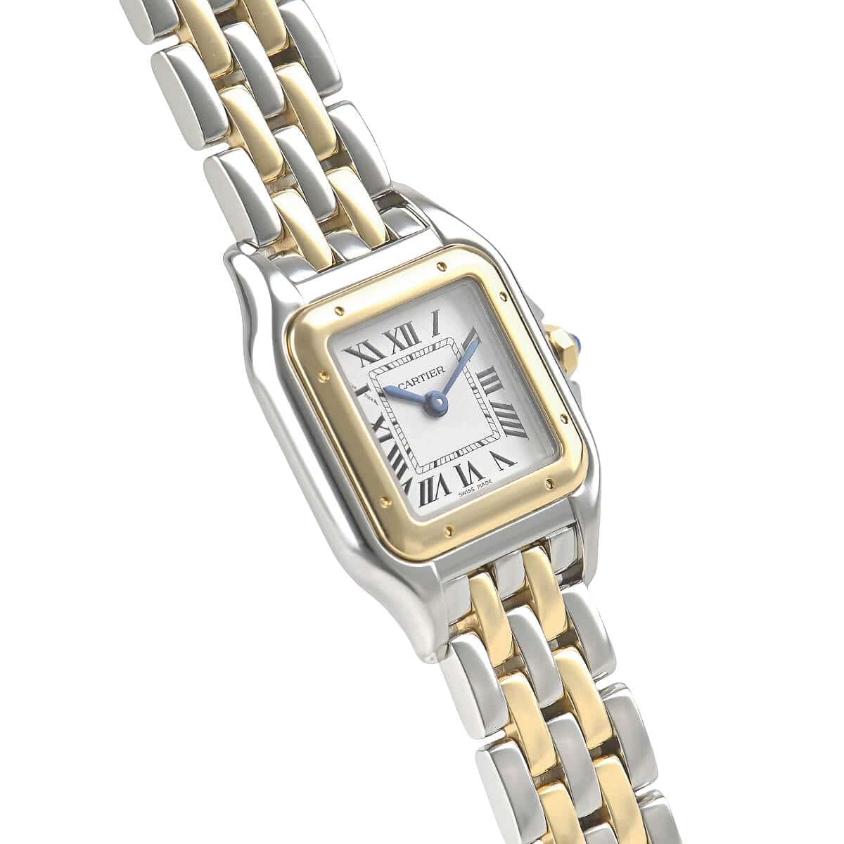 文字盤は内側にレイルロードを設けたローマインデックスで、美しく仕上げられたブルースチール針との組み合わせもカルティエらしく絶妙なバランスを保っています。
