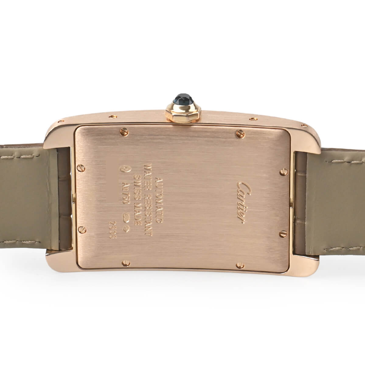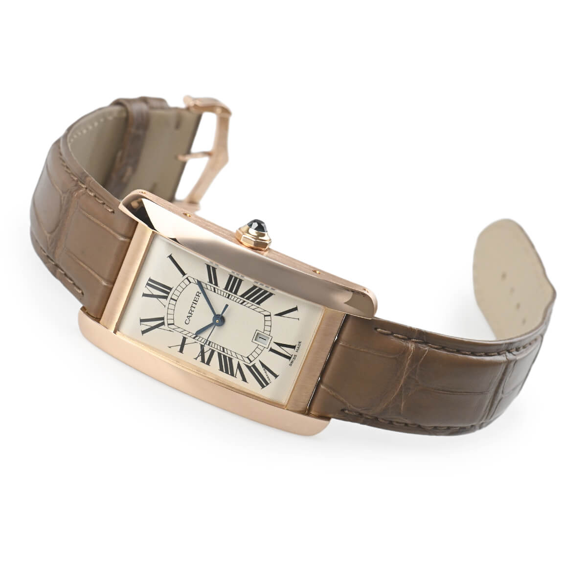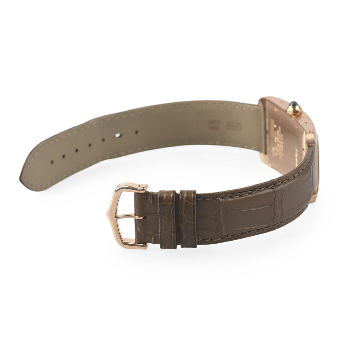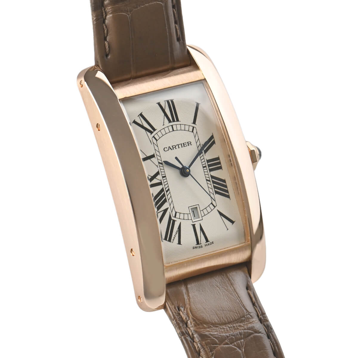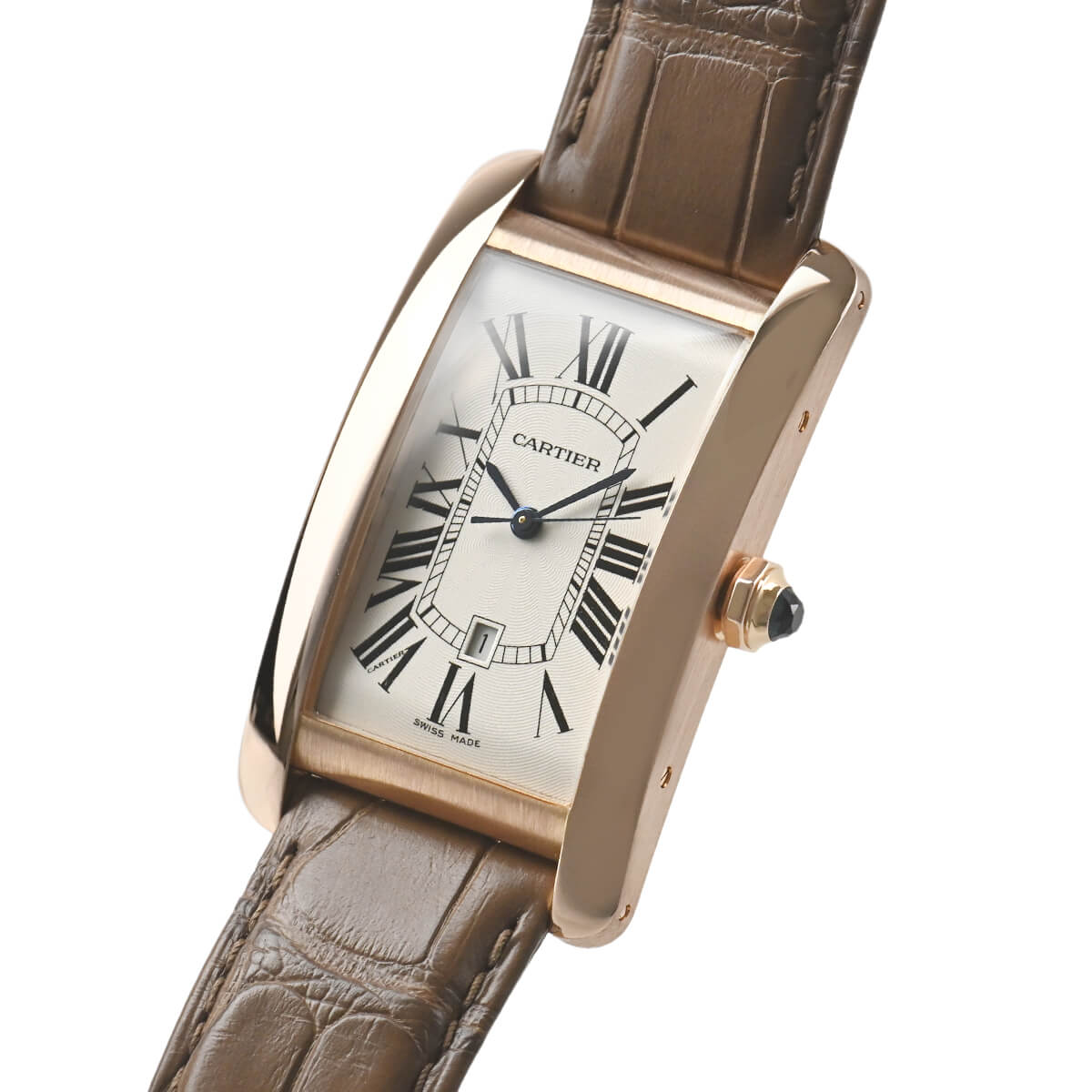 二本の平行するバーを特徴とするタンクシリーズの中でも縦方向に長いデザインが個性的な「タンクアメリカン」。八角形のリューズには、ファセットを施したサファイアがセッティングされています。