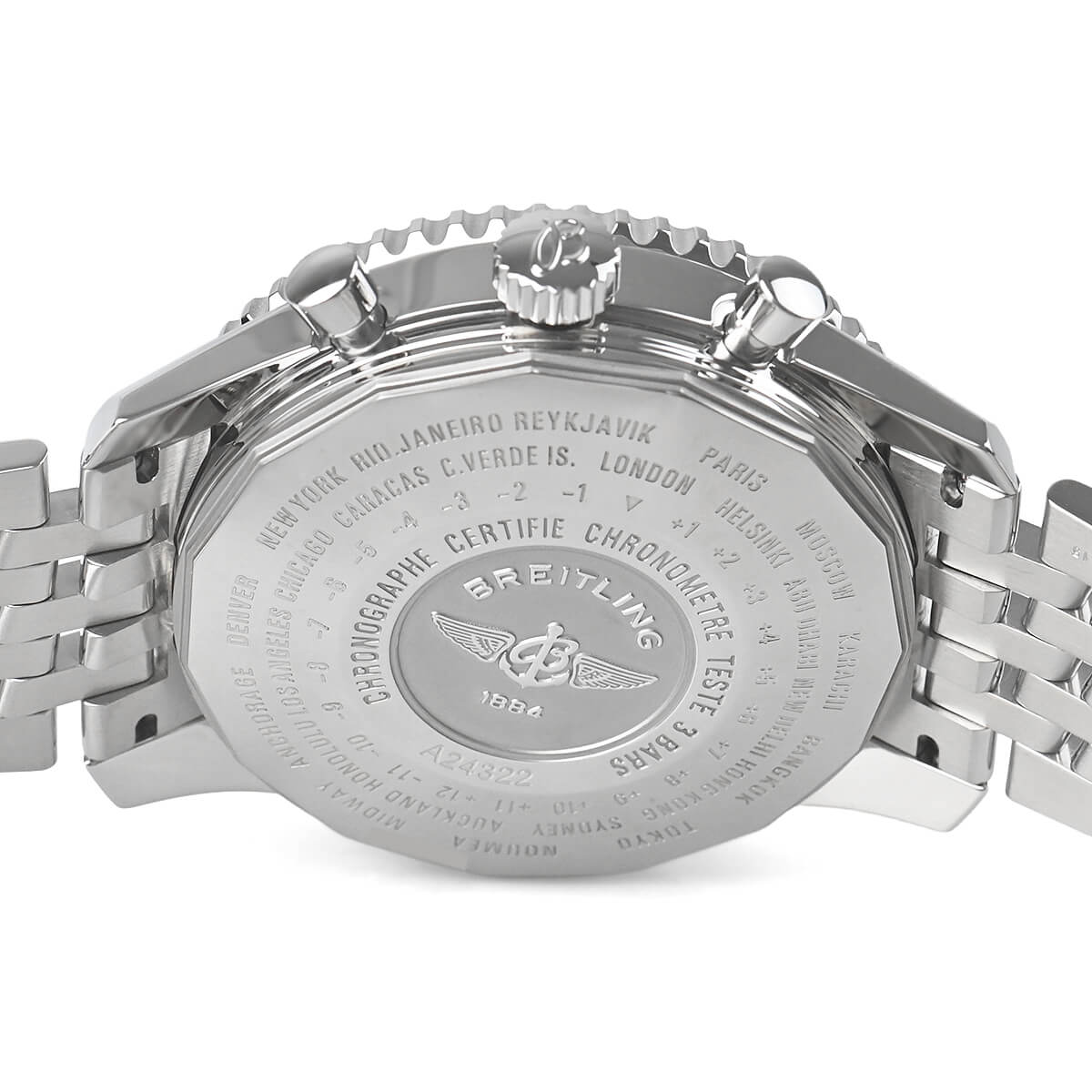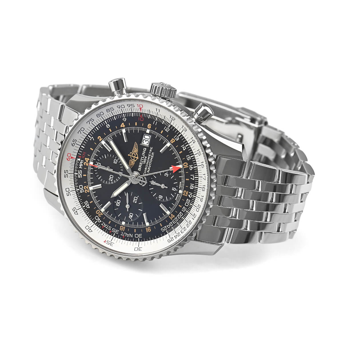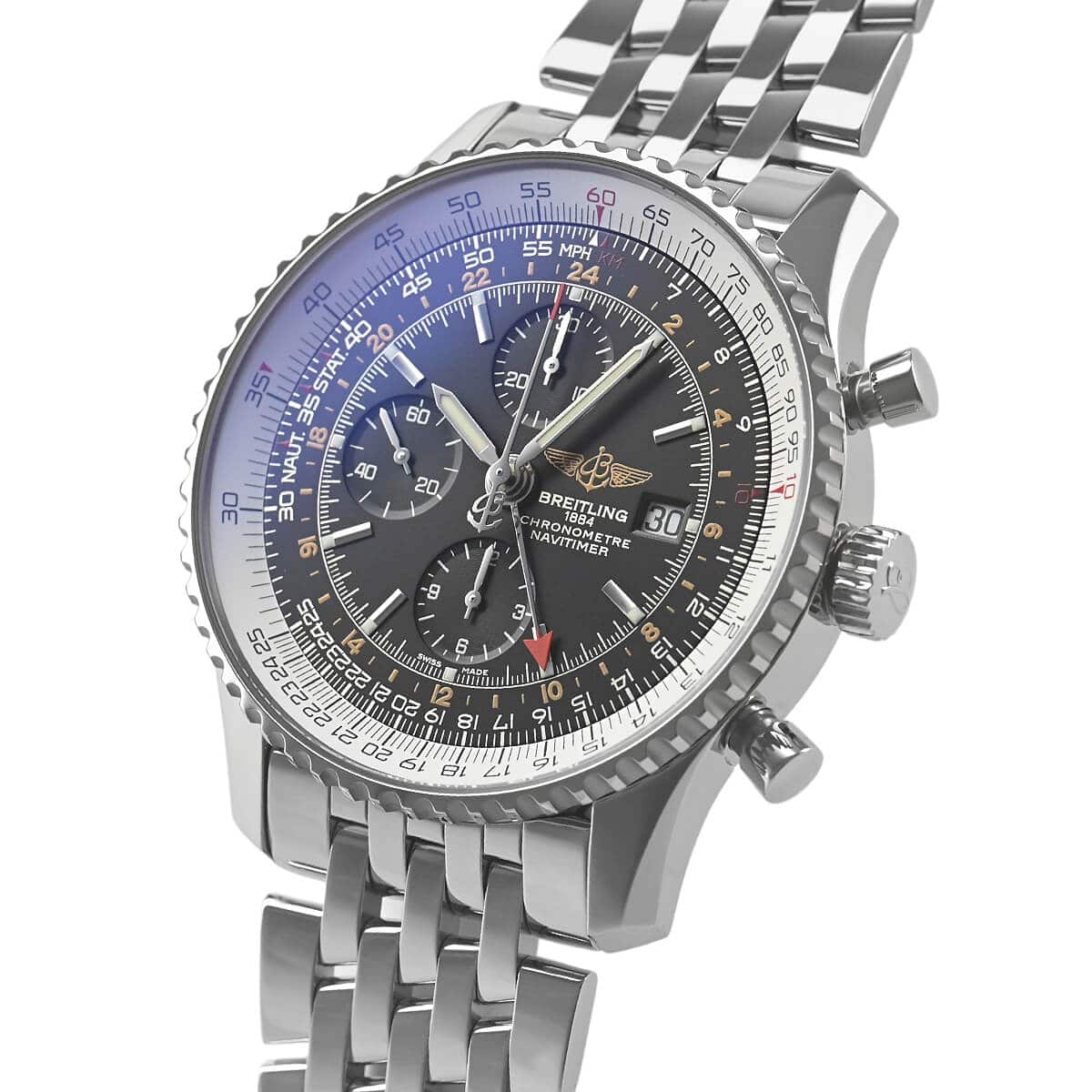 世界中の時刻を表示できる「ナビタイマーワールド」。このパイロットウォッチは便利なGMT機能だけではなく、直径46mmと存在感あるケースも魅力です。