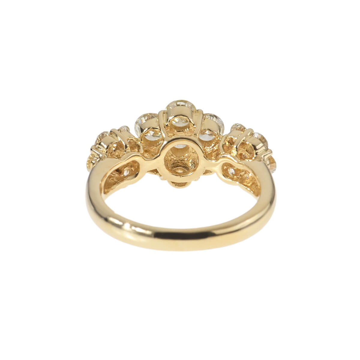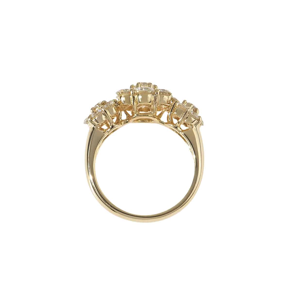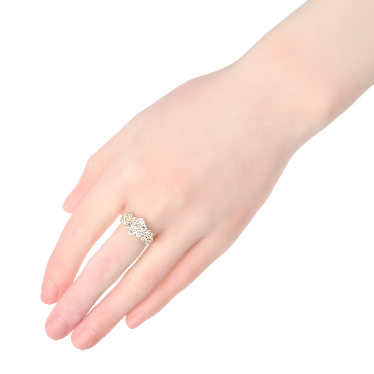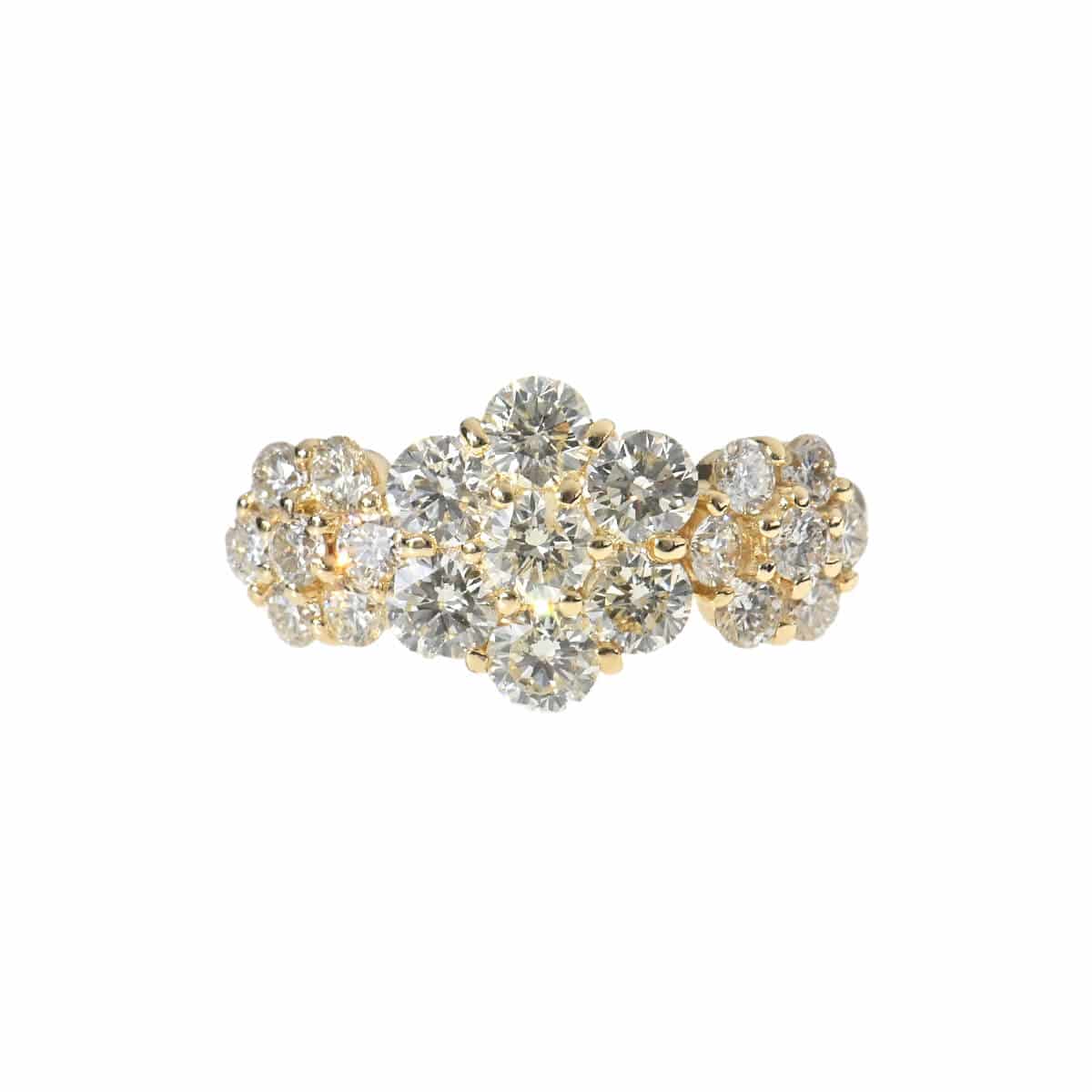 トータル1.905ctものダイヤモンドでデザインされた3輪のダイヤモンドフラワーが並ぶ、イエローゴールド製リング。エレガントで可憐なフラワーモチーフが煌めいて、大胆な存在感で指先を華やかに飾ります。セッティングされたダイヤモンドひと粒一粒が際立って煌めき、ダイヤモンドそのものの美しさも楽しめるリング。大人の可愛らしさも感じるダイヤモンドリングは、どんなスタイルにもさりげない個性と気品を添えてくれそうですね。