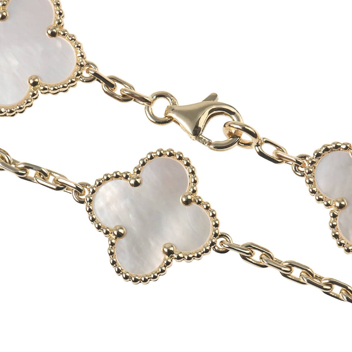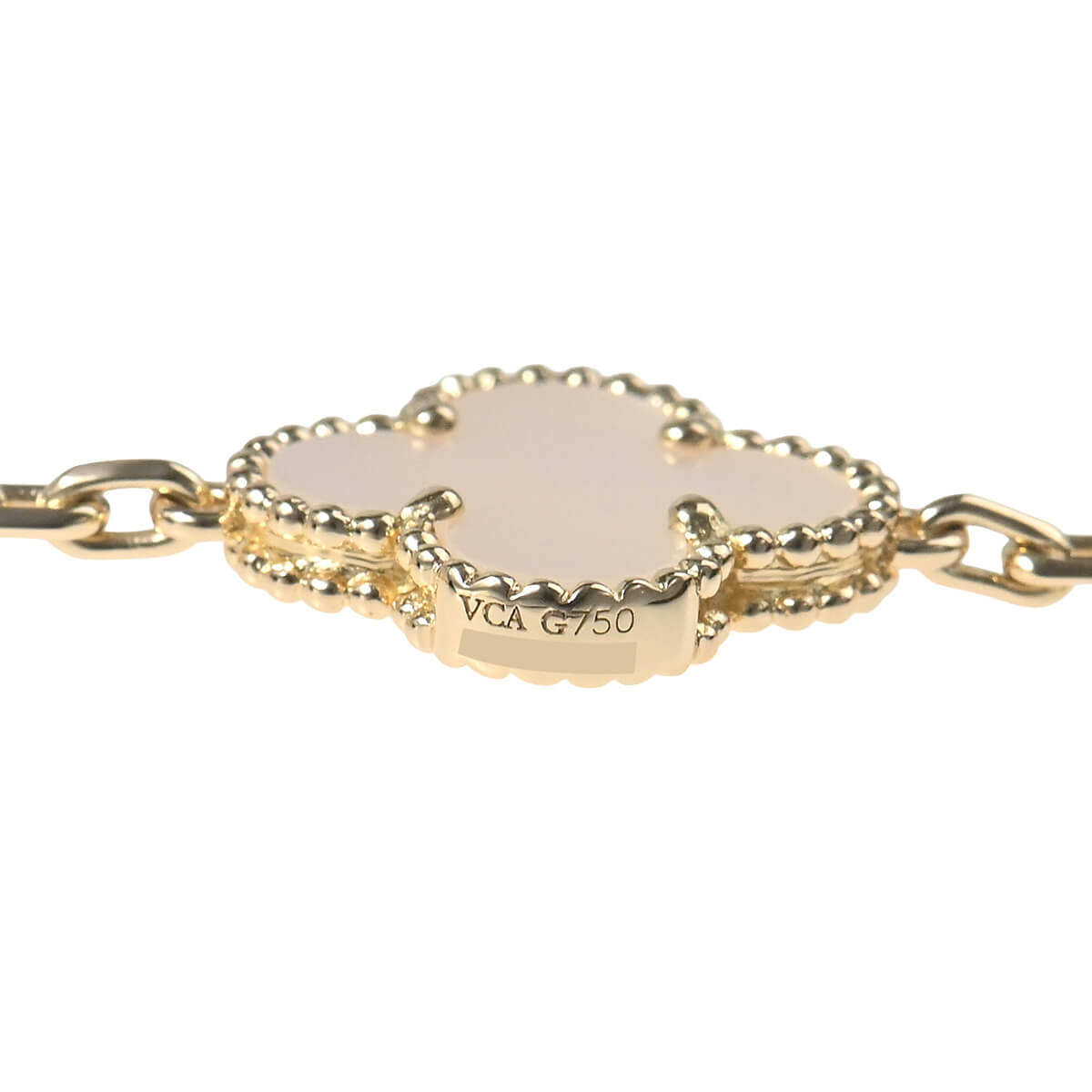 1968年に初めて誕生した幸運のシンボル「アルハンブラ」の特徴を受け継ぎ、『VanCleef&Arpels(ヴァンクリーフ&アーペル)』ならではの独創性と時を超えるエレガンスを湛える「ヴィンテージアルハンブラ」コレクションは、エレガントで清楚、控えめでありながら洗練された、メゾンを代表するアイコン。可憐なビーズに縁取られたクローバーのマザーオブパールがきらめくゴールドチェーンに5ピースあしらわれた、「ヴィンテージアルハンブラ」ブレスレットです。たくさんつけてもしつこくなく、むしろ“素敵”にまとまる、不思議な個性をもつアルハンブラはコレクションで揃えていって、バリエーションを魅せるのも。ひとめでそれとわかるラッキーチャームを、どのタイミングで、どのカラーで迎えるかを考えるのも楽しい、エレガントに映えるハッピーな魅力にあふれたコレクションジュエリーです。
