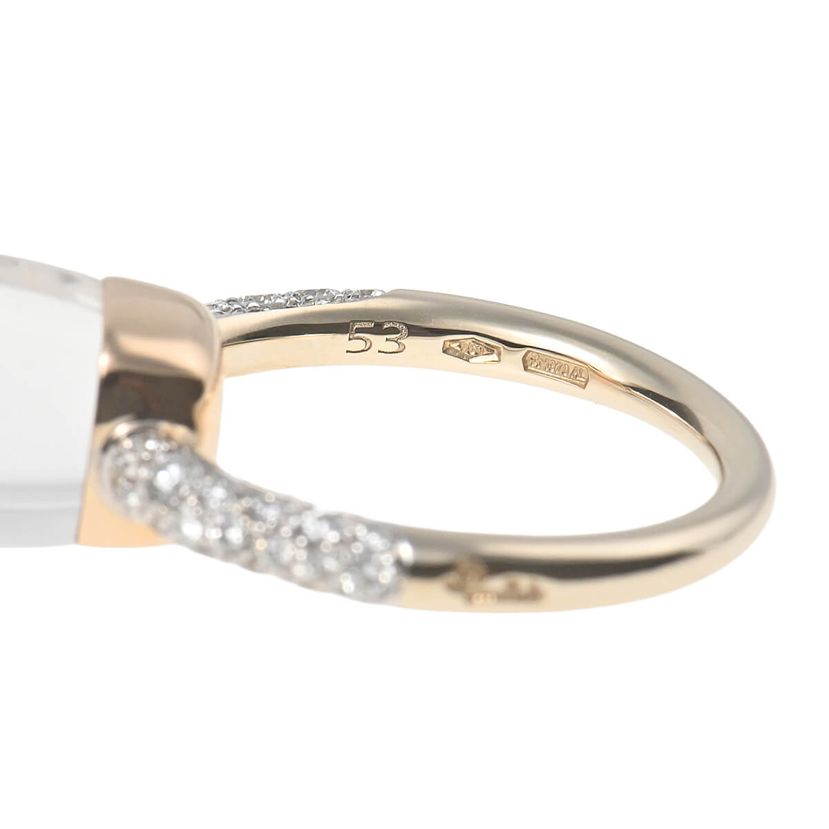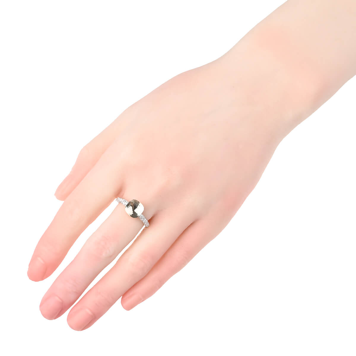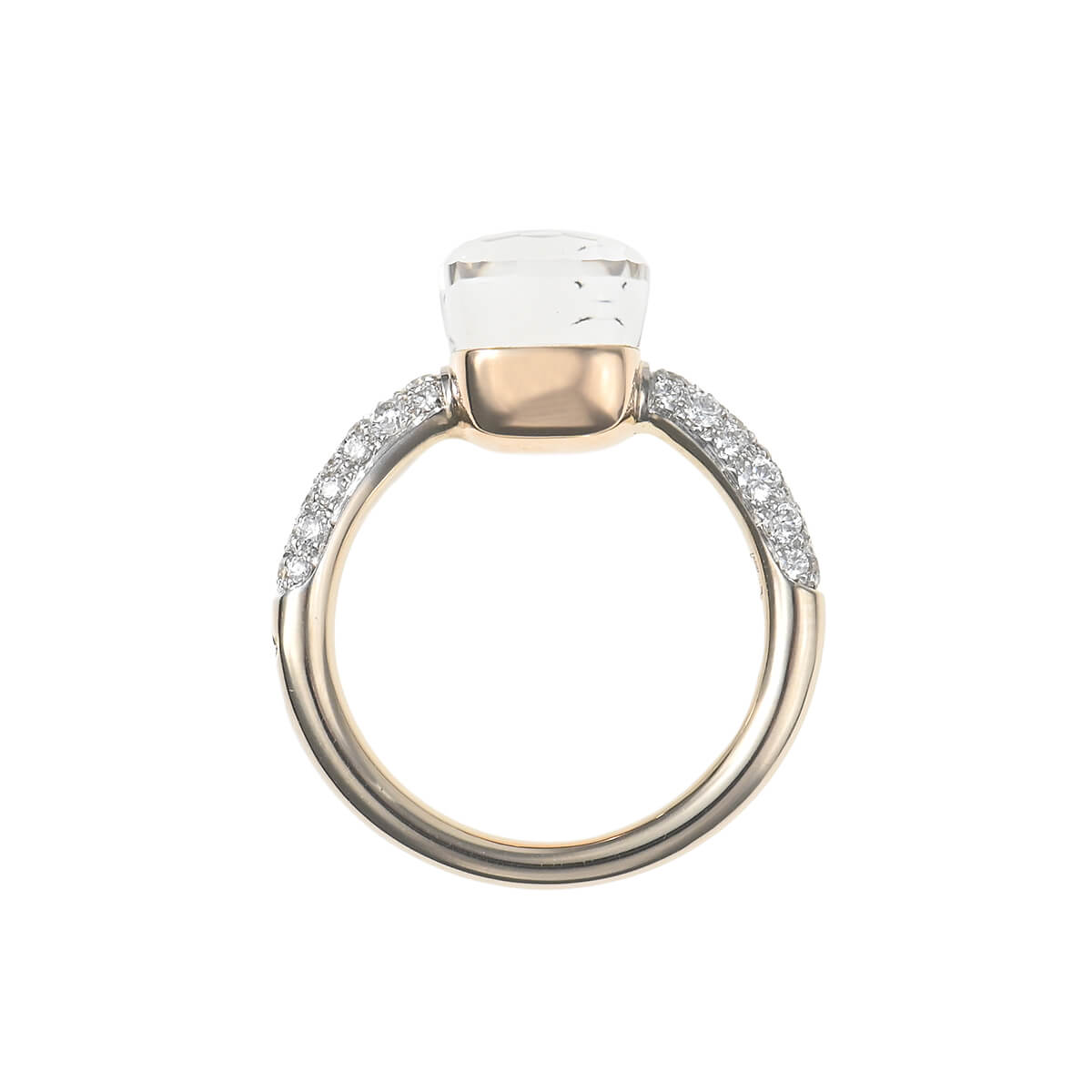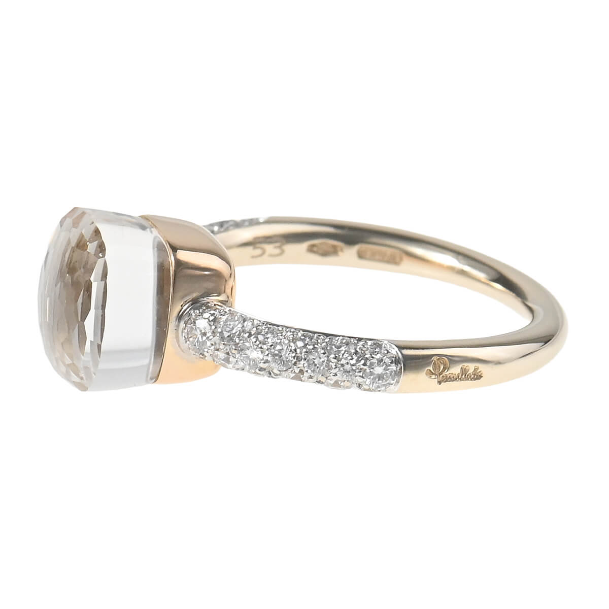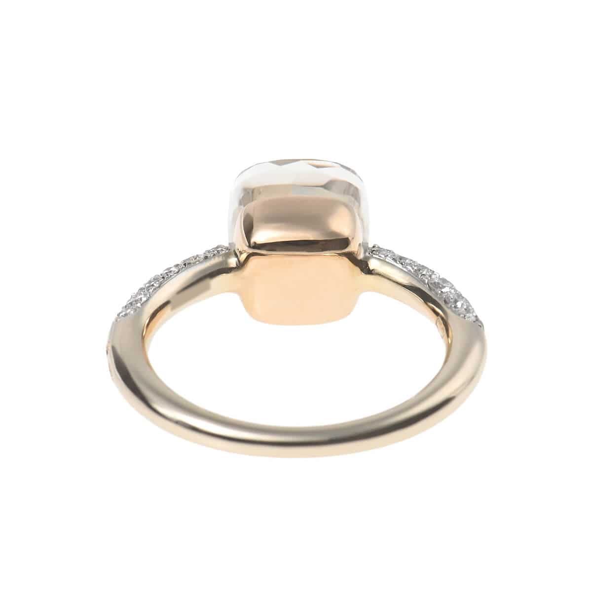 『Pomellato(ポメラート)』のコンテンポラリーなスタイルのアイコン「ヌード」は、特許を取得している美しい多面のファセットカットとセッティングで、宝石がもつありのままの美しさを表現したジュエリーコレクション。無数のカラーコンビネーションが可能な「ヌード」の宝石をあしらった、非常にすっきりとシンプルなデザインながらパワフルで、強く印象に残るシックな個性をもつコレクションです。コレクションの中で最もコンパクトなサイズの「ホワイトトパーズ」をあしらった、「ヌード・プチ」リングは、より繊細な印象に。他の宝石にはないホワイトトパーズならではのみずみずしさあふれる透明感を、サイドのパヴェダイヤモンドの強いきらめきが一層印象的に惹きたてています。ニュアンス豊かな存在感が目を惹く、ポメラートらしいお洒落な個性と遊び心、そしてインパクトある美しさにあふれたコレクションジュエリーです。