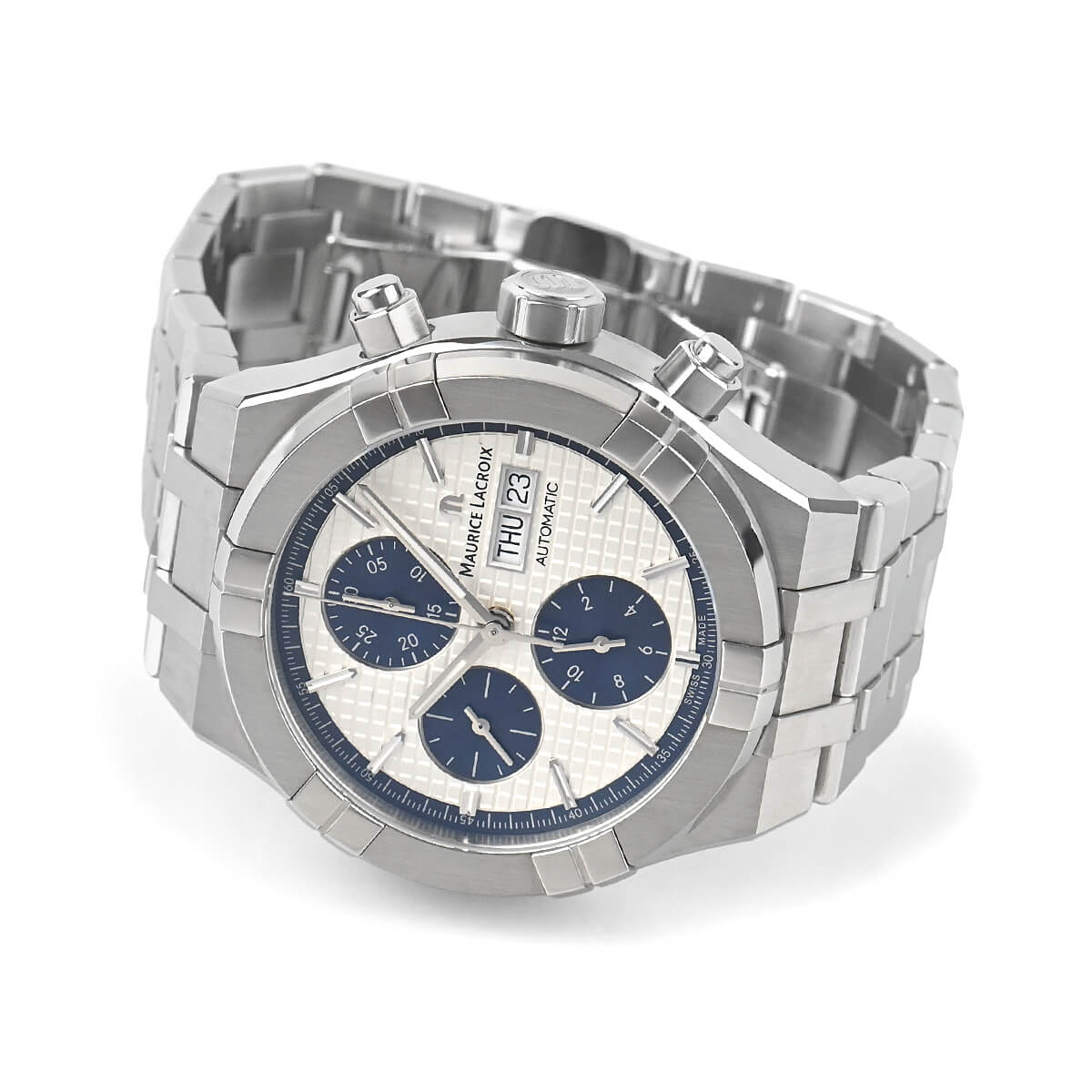 剛性感のあるケースとブレスレットに、文字盤全体に立体的なスクエア模様を施すことでスポーティーでありながら、ラグジュアリー感もお楽しみ頂ける一本です。