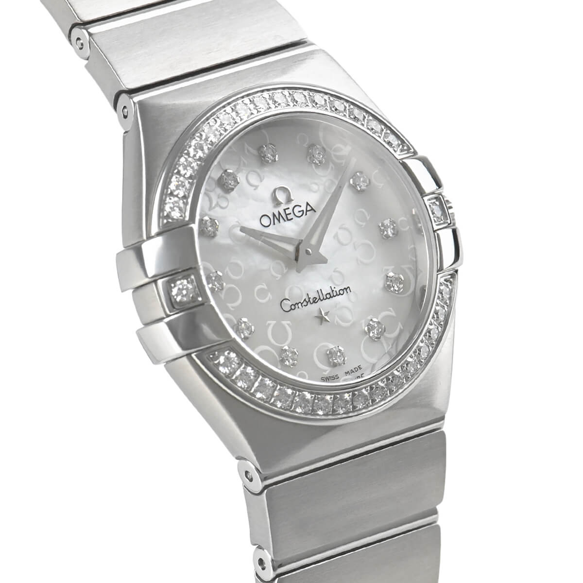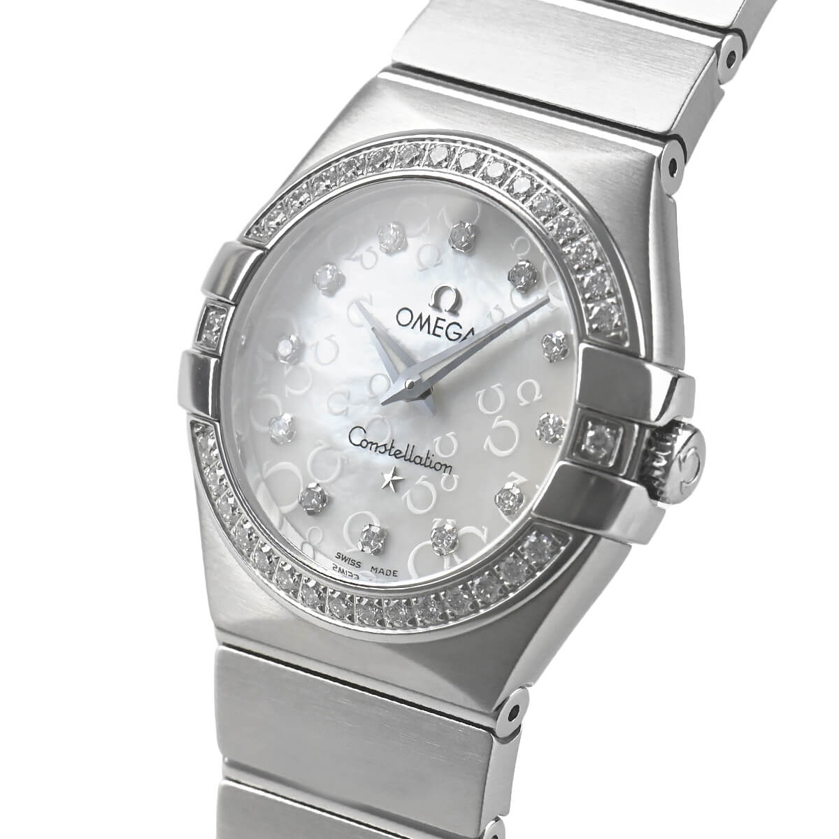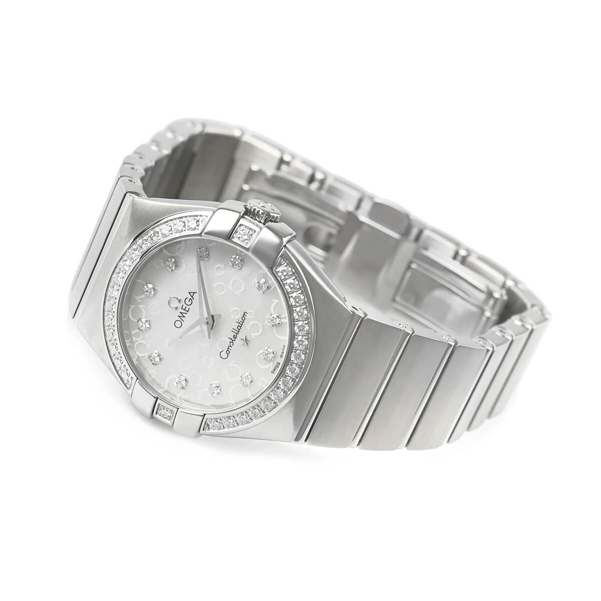 こちらはベゼルと文字盤にダイヤモンドをセッティングした華やかなモデルで、オメガマークが無数にプリントされたホワイト・マザーオブパールダイアルがアイキャッチとなったクォーツ式のコンステレーションです。