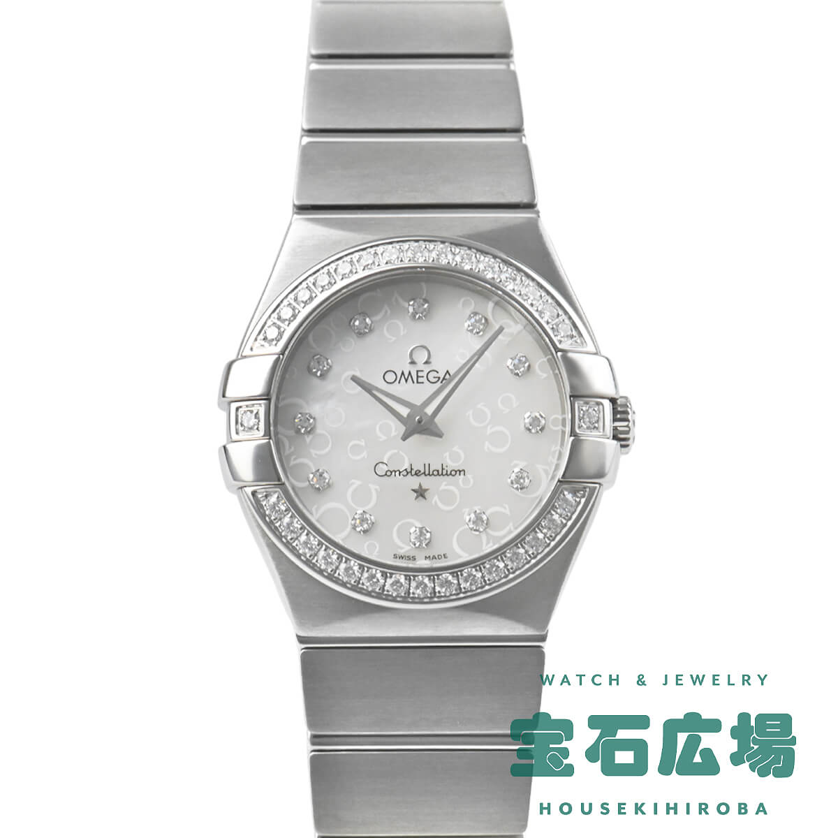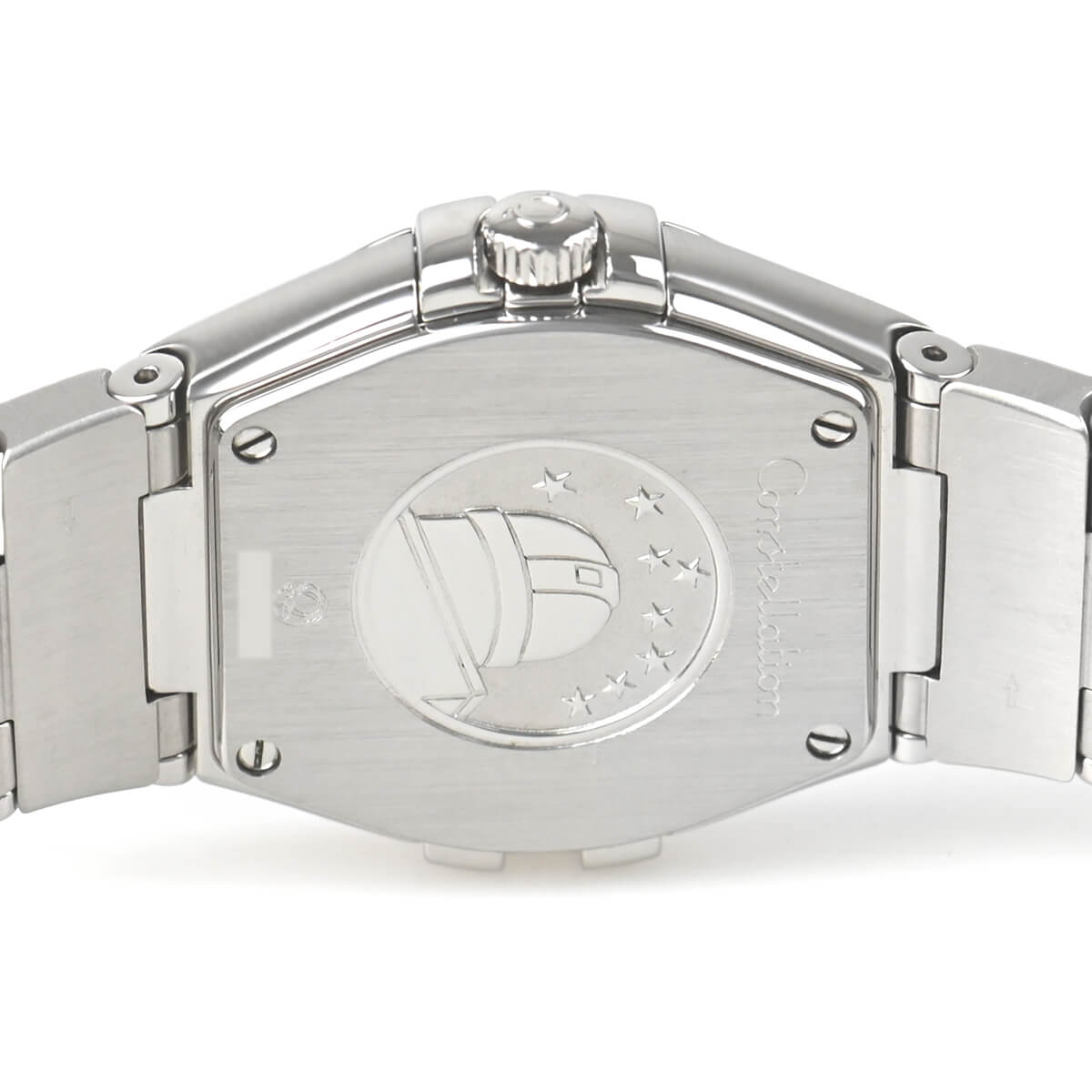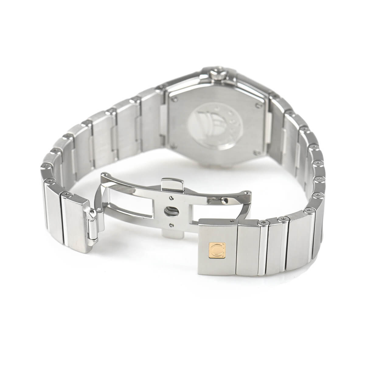こちらはベゼルと文字盤にダイヤモンドをセッティングした華やかなモデルで、オメガマークが無数にプリントされたホワイト・マザーオブパールダイアルがアイキャッチとなったクォーツ式のコンステレーションです。