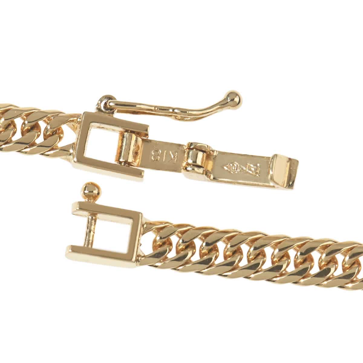 約50センチ、幅約3.6ミリ、約20グラムのイエローゴールド製6面ダブルキヘイチェーンネックレス。キヘイチェーンとは、あずき型のチェーンを90度ひねり、さらに押しつぶしたつくりのデザインチェーンのこと。押しつぶした面が綺麗に並んで同じ面を向き、連続していることによるなめらかな輝きが魅力のデザインチェーンです。上下及び2つの対角線上に2つずつ平面が施された6面のコマをダブルに繋いだ、6面ダブルキヘイチェーン。カット面が多く地金の輝きが強く映えるこのチェーンは、隣り合うコマとの密度も高いため、少し細めでもゴールドならではの華やかさを楽しめます。資産価値にも注目されるキヘイは他のチェーンとは違い、単なる装飾品としてだけでなく身につける資産としても人気です。