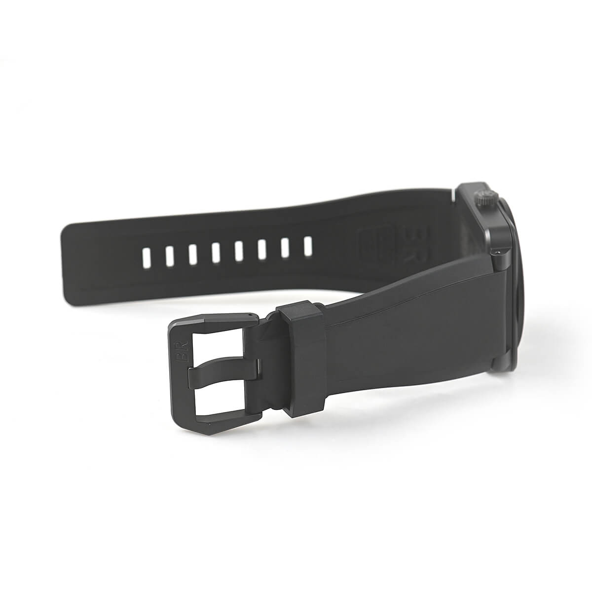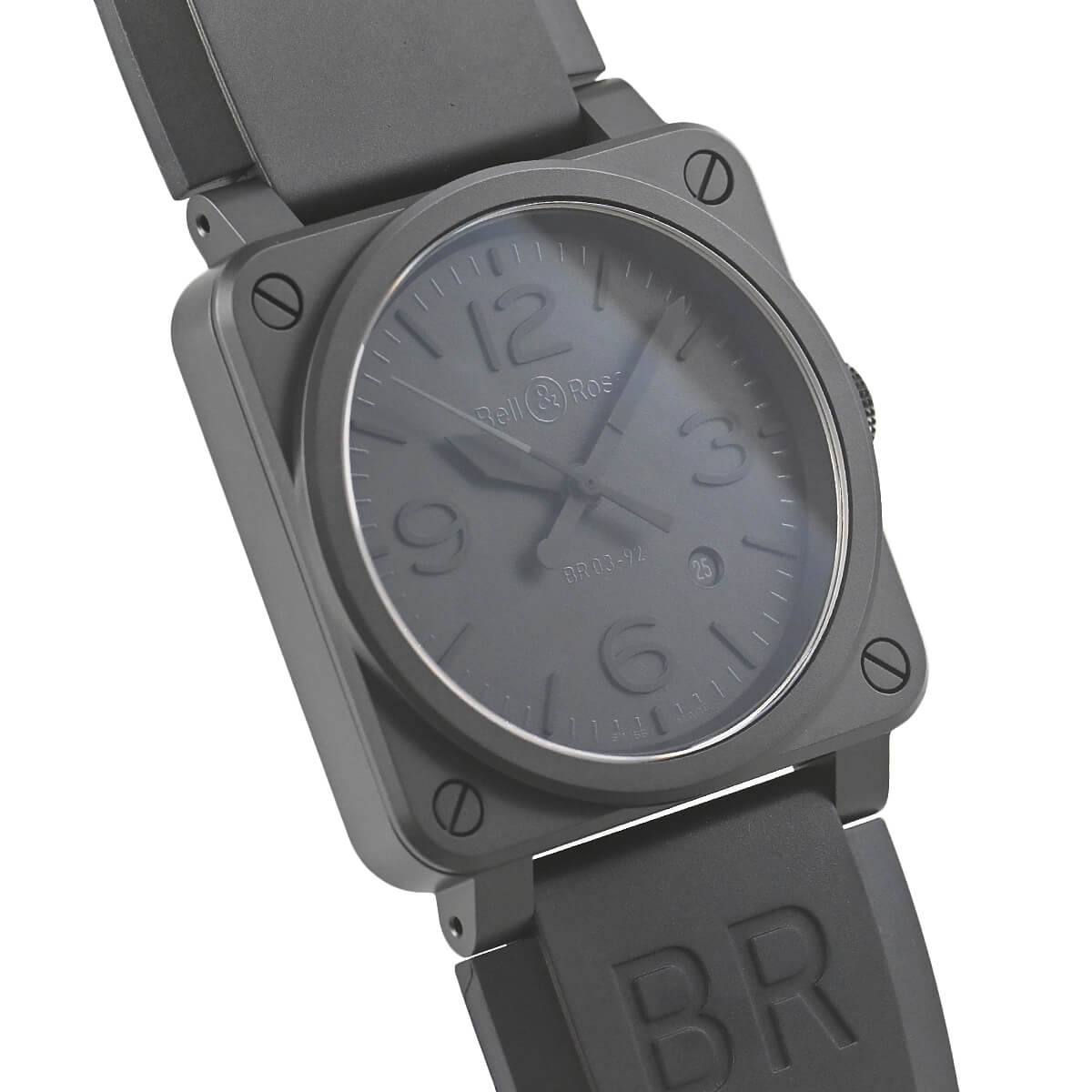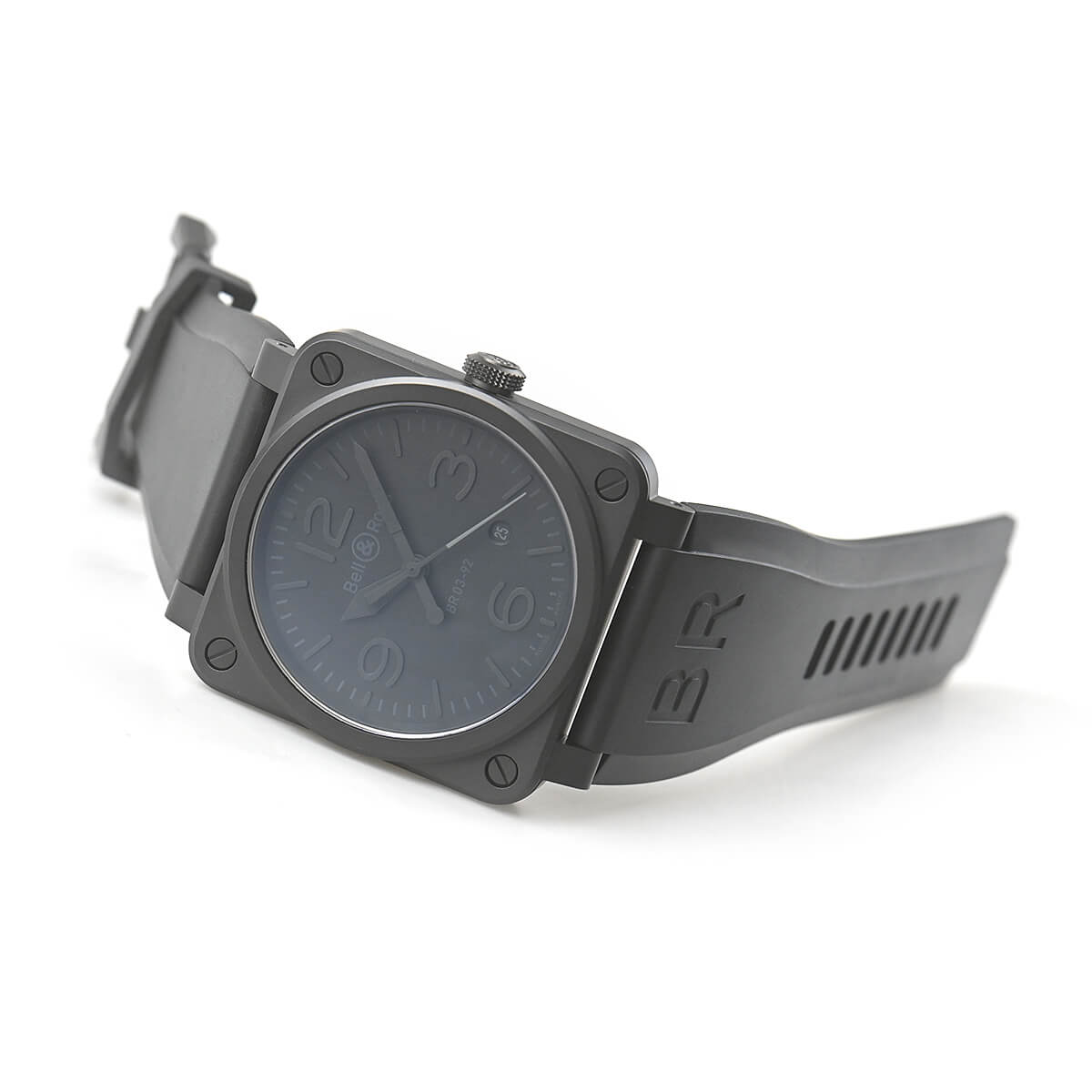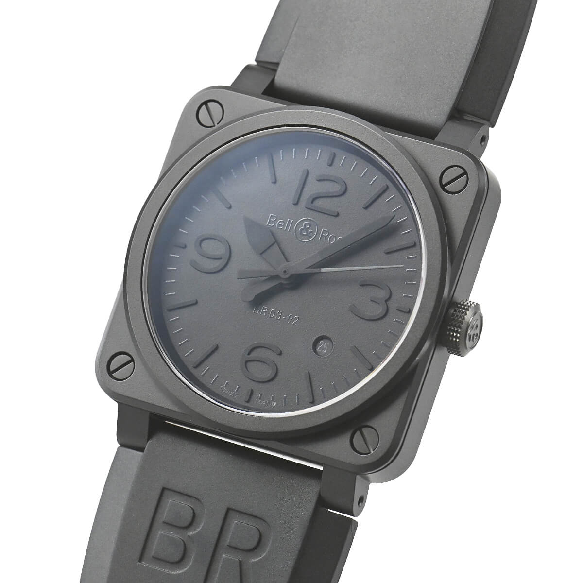 斬新な角形ケースが印象的なコレクション「BR03」。航空機のコックピット・クロックから発想を得たこの時計は、視認性を重視した機能的な道具という面が一段と強調されています。