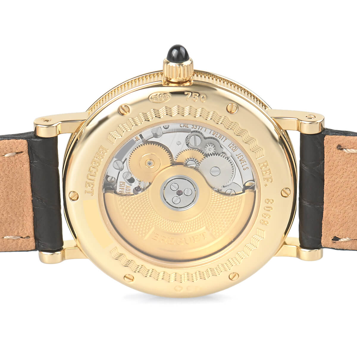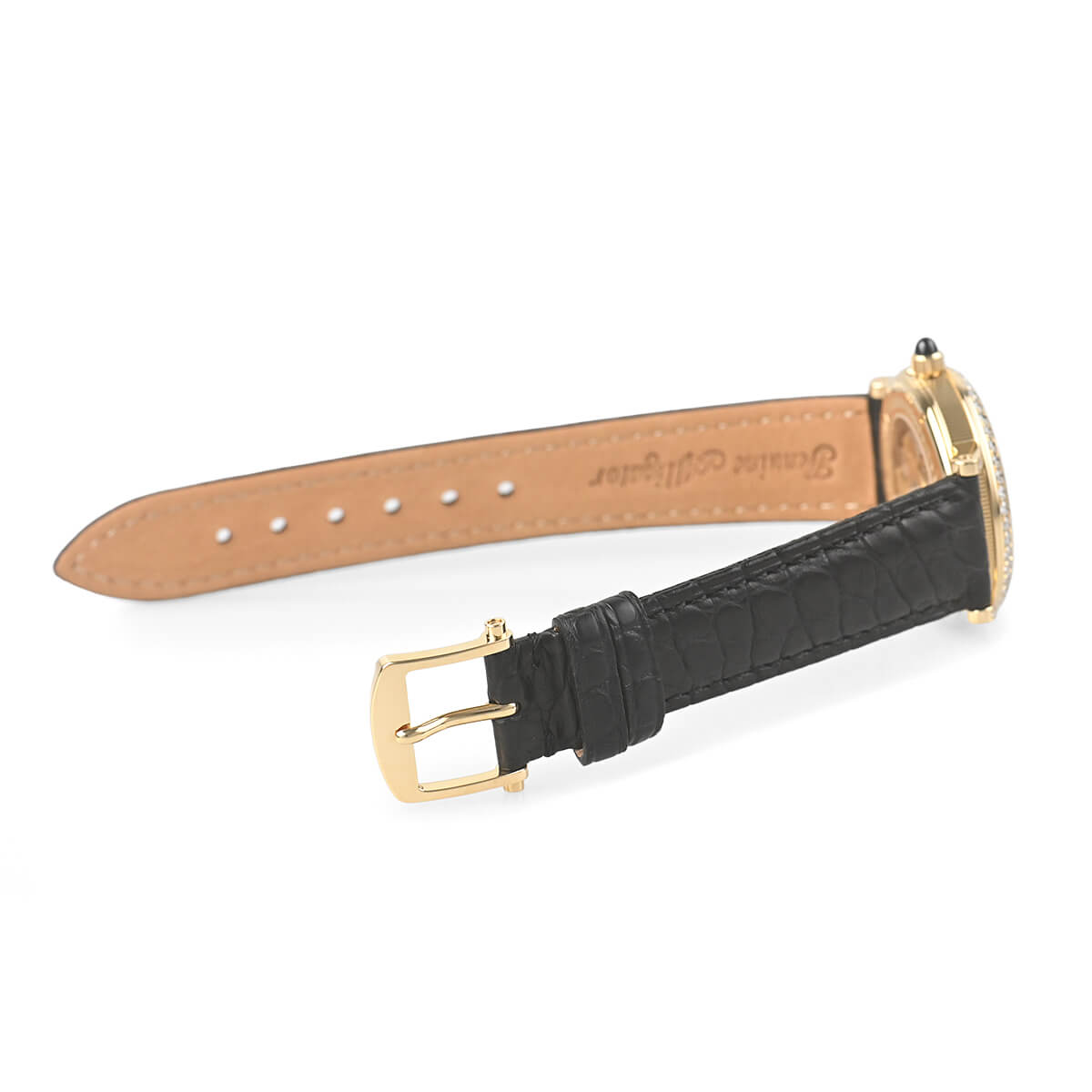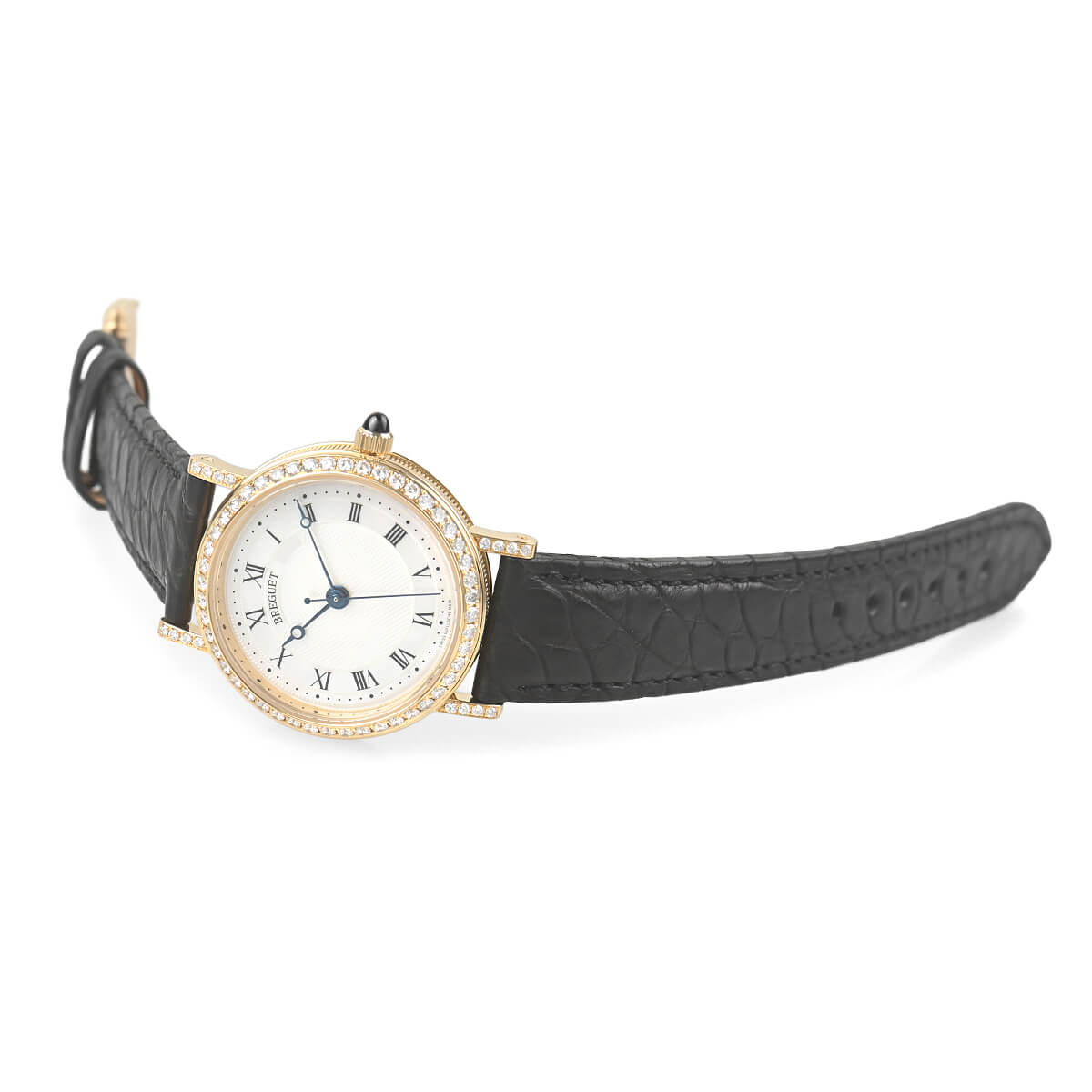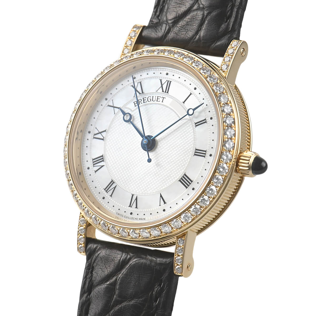 典型的なブレゲスタイルの通好みなレディースモデルです。コインエッジのケースやブレゲ針、ギョーシェの刻まれたダイヤルなど、ブレゲらしさに溢れつつもジュエリーウォッチならではの華やかさを併せ持ちます。