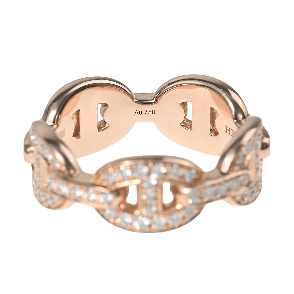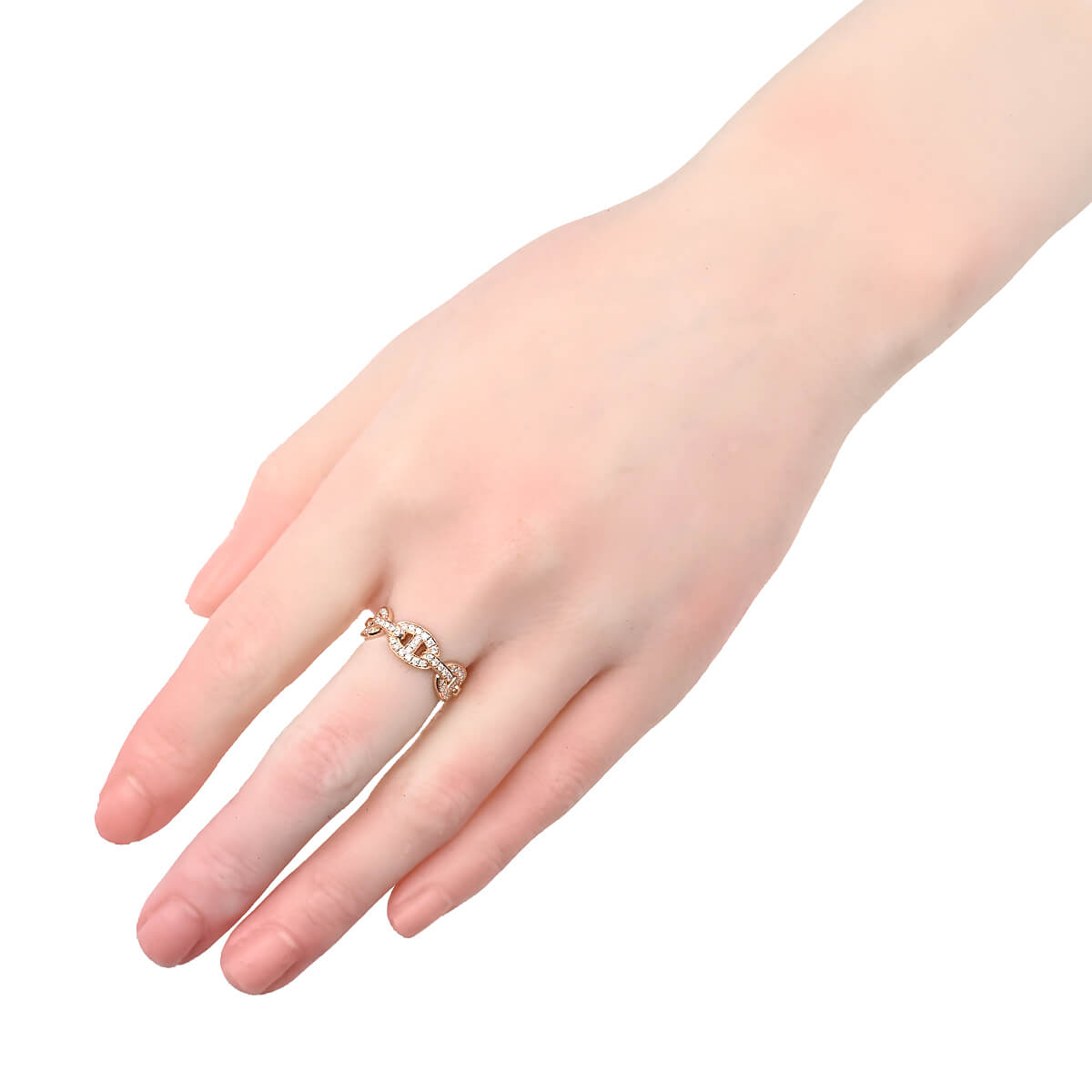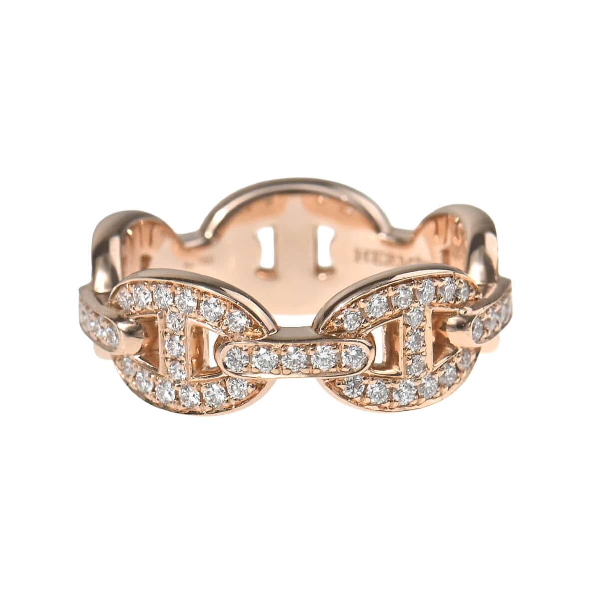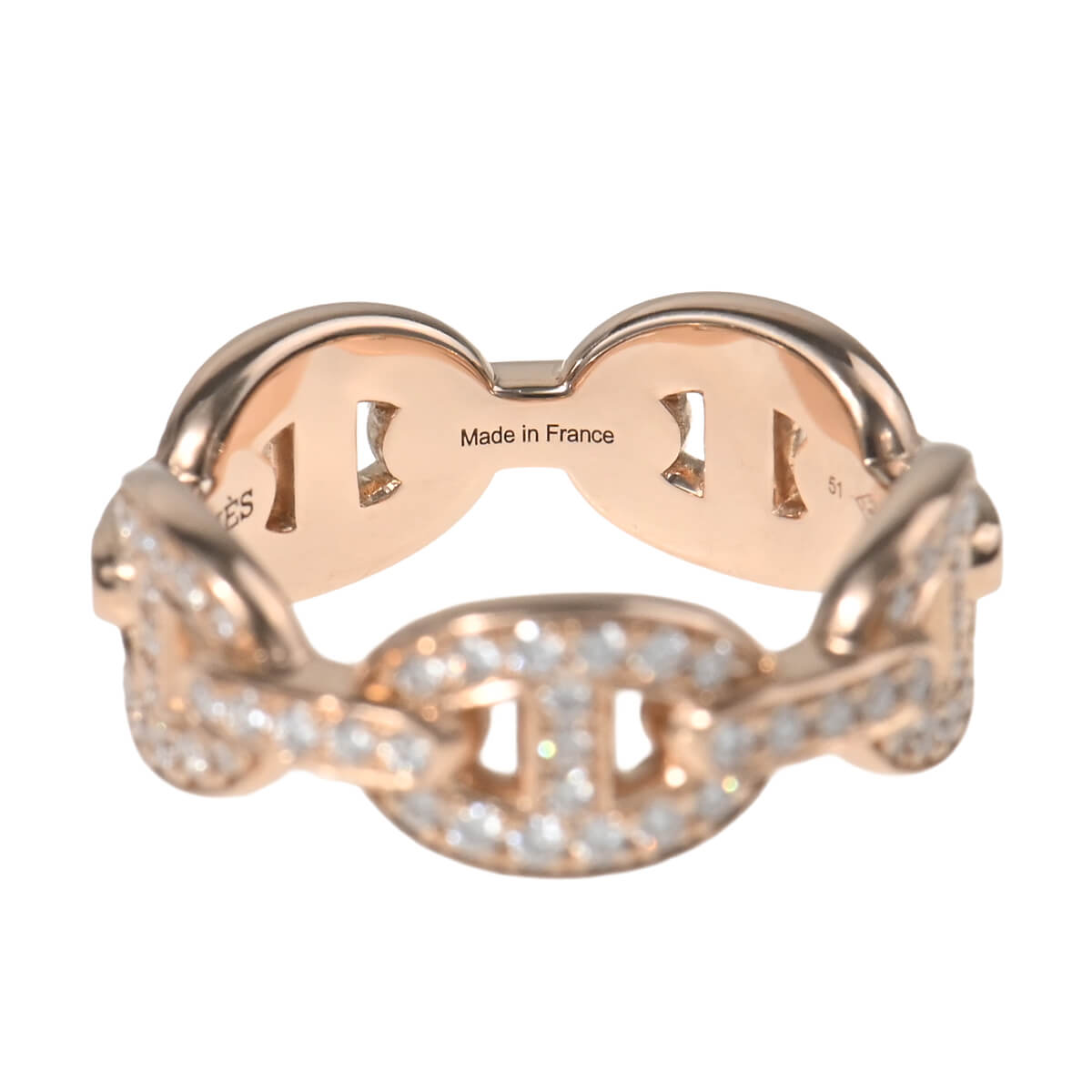 1938年にエルメス家の一員であり当時のエルメスの社長であったロベール・デュマ=エルメスが、ふと船の錨のチェーンに目を留め、そのシルエットに惹かれ、そのチェーンを元にデザインしたブレスレットを作ったことにはじまった「シェーヌ・ダンクル」コレクション。インスピレーションの源であった“錨の鎖(Chaine d’ancre)”をそのままモデル名に冠したこのコレクションは、鎖で強く結ばれた絆を象徴しているそう。最初のブレスレット誕生後も艶出しにしたり、丸い粒状にしたり、ひねったりと、コマの形や大きさを変え、ネックレスやリング、ピアス、ブレスレットとつぎつぎに新しい姿を見せ、メゾンを代表するコレクションのひとつとなった「シェーヌ・ダンクル」。1周連なる「シェーヌ・ダンクル」のオブジェ全てにダイヤモンドがあしらわれた、「シェーヌ・ダンクル・アンシェネ」のピンクゴールド製リング。美しいシェーヌ・ダンクルのオブジェが指先に寄り添って、どんなスタイリングも美しく、エレガントに飾ってくれる人気コレクションのハイジュエリーです。